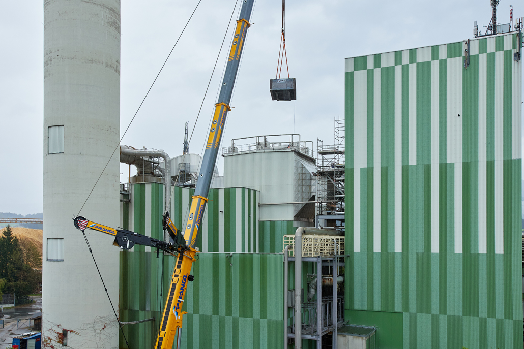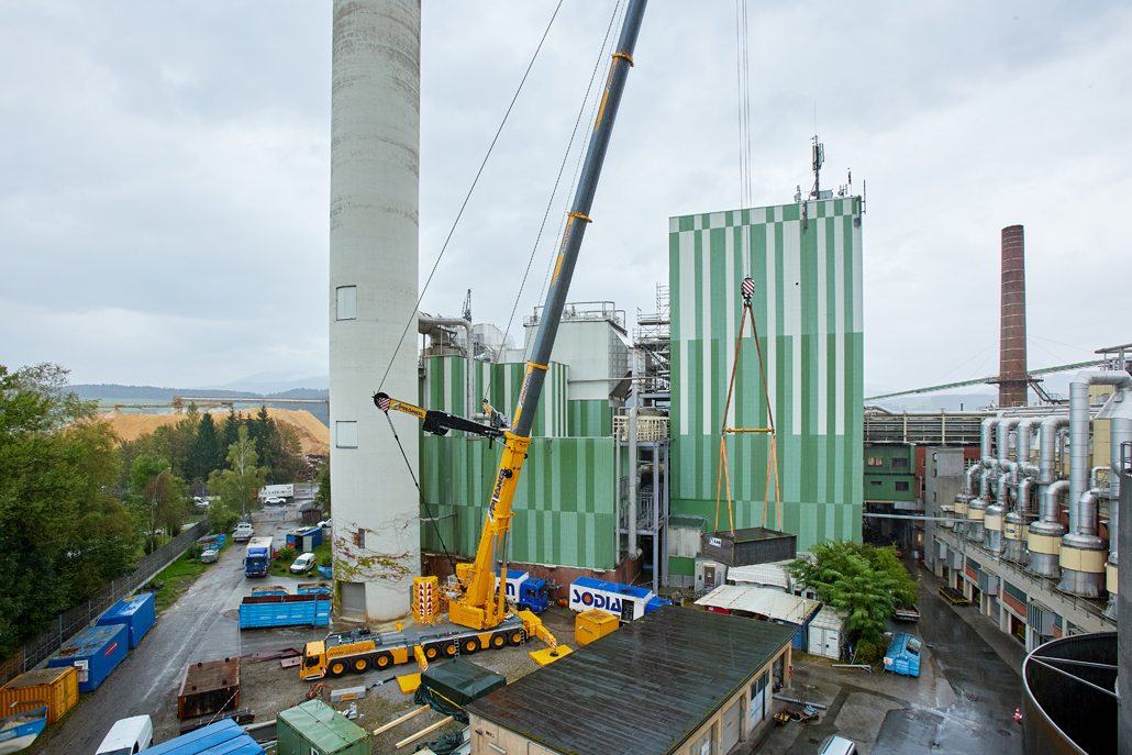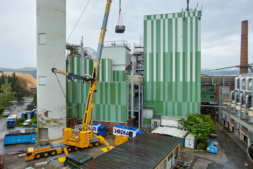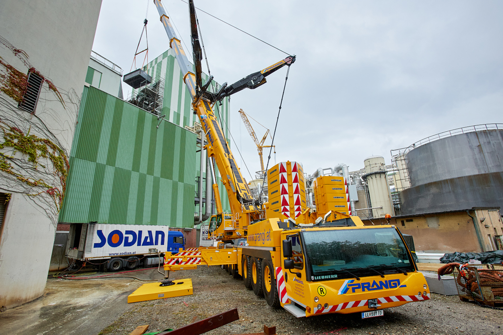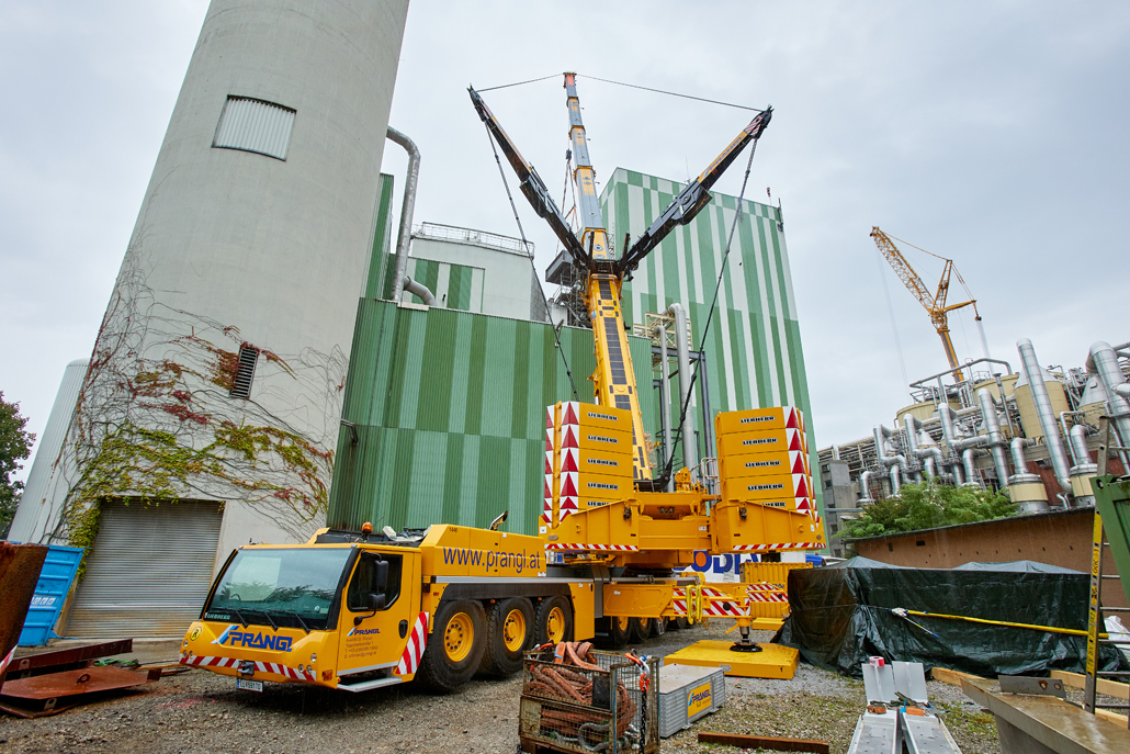 Ein besonderer Auftrag führte das Prangl-Team nach Hallein: Die AustroCel, ein Hersteller von umweltfreundlichem Zellstoff und Bio-Energie, beauftragte das Familienunternehmen mit anspruchsvollen Hebearbeiten. Ziel des Projekts war der Austausch massiver Wärmetauscherpakete – mit jeweils 5 Metern Länge, 3,4 Metern Breite, 1,6 Metern Höhe und einem Gewicht von rund 28 Tonnen – die präzise und sicher bewegt werden mussten.