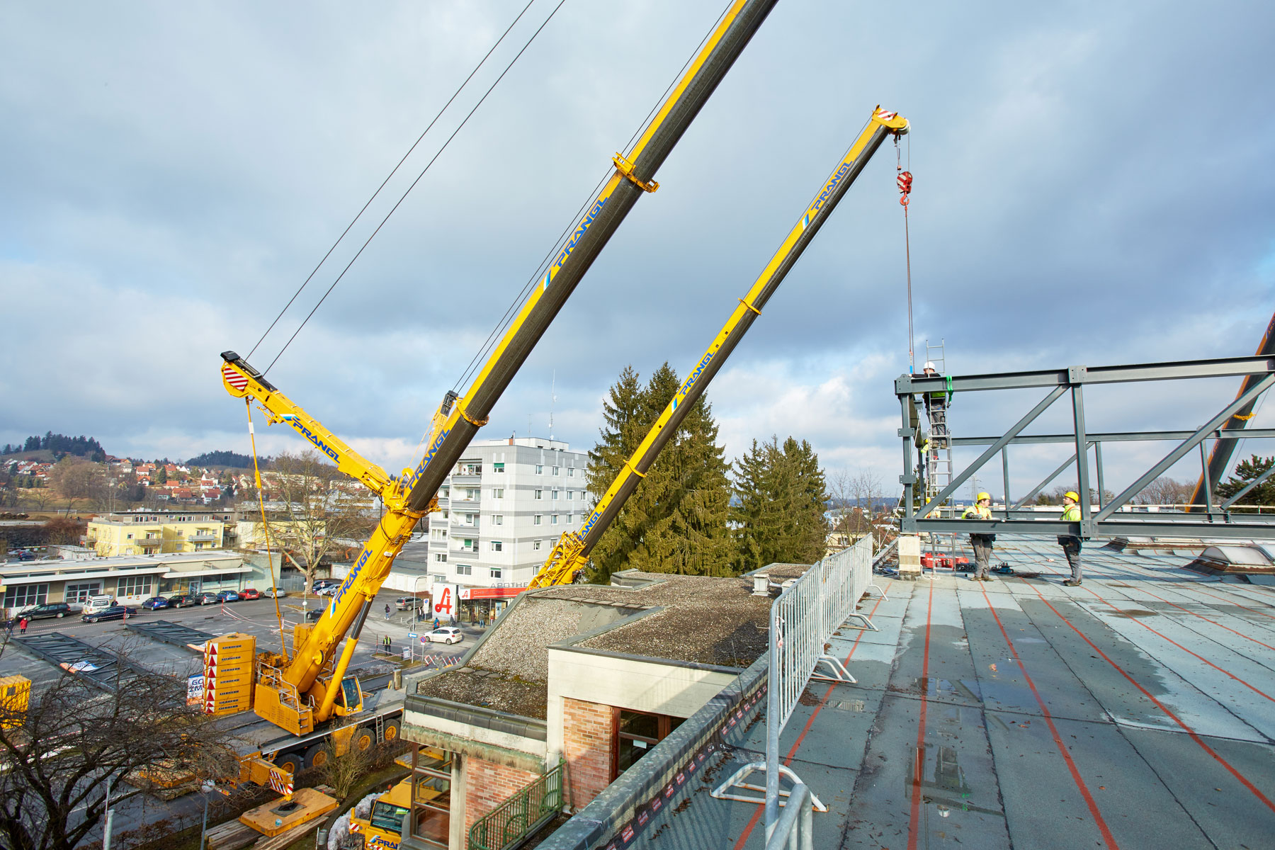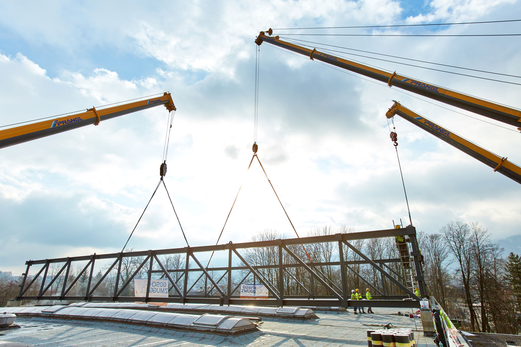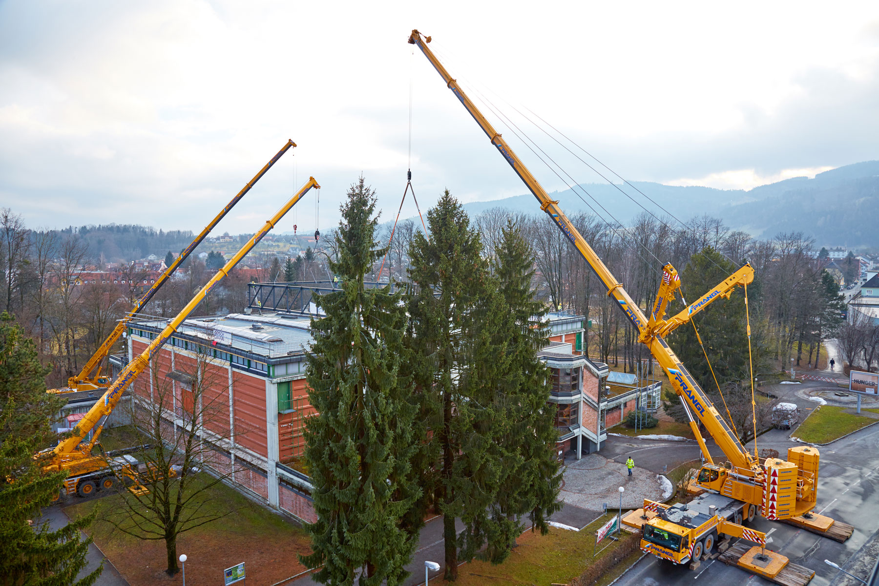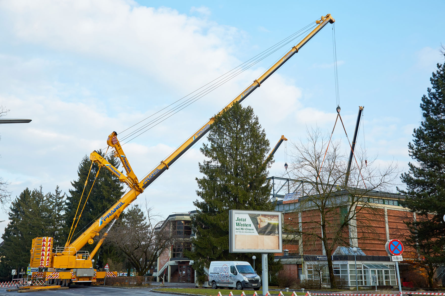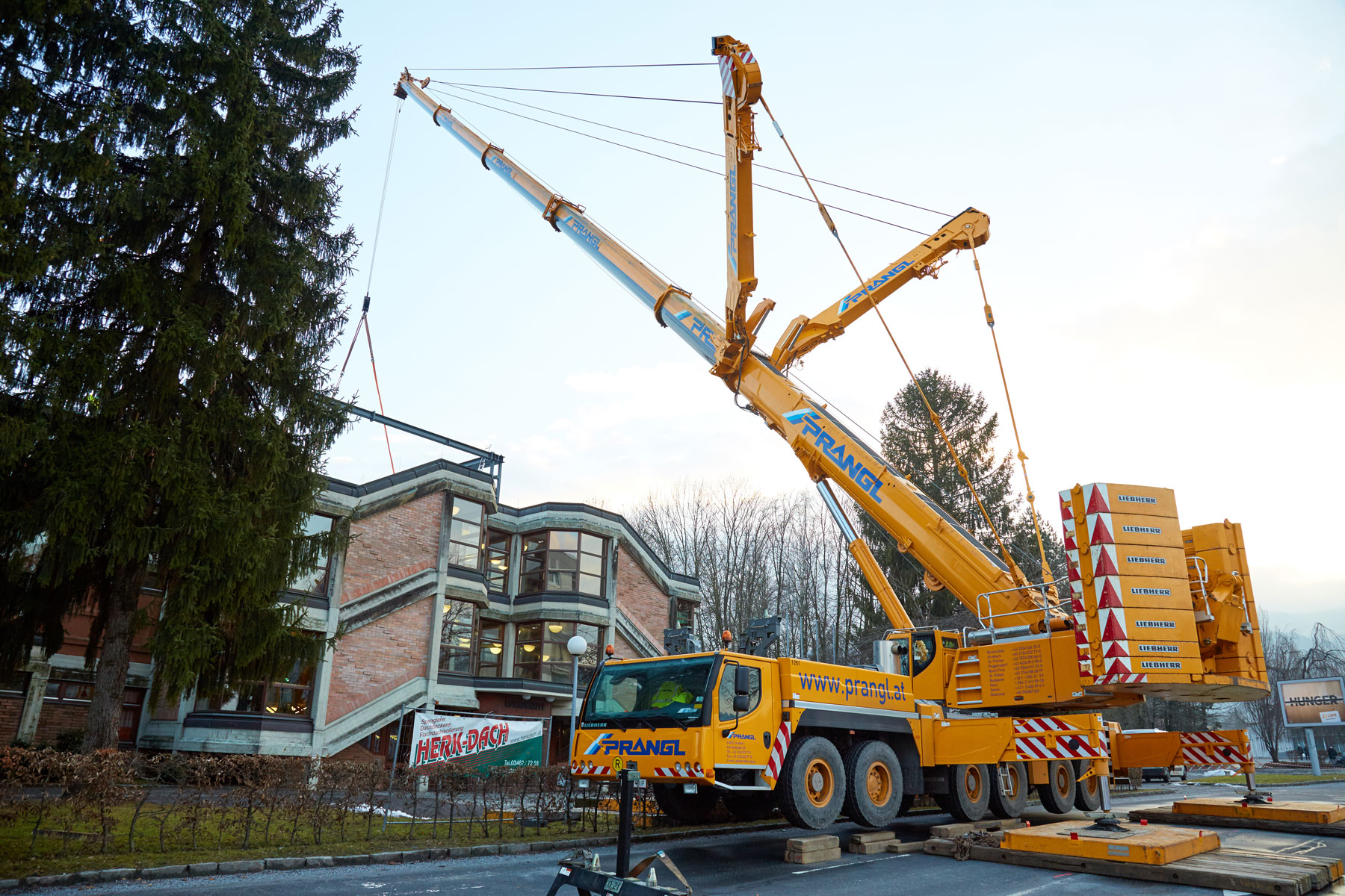 Um eine möglichst reibungslose Hebelogistik zu gewährleisten, wurden die Metallteile direkt auf dem gegenüberliegenden Parkplatz gefertigt und mithilfe des 350 Tonnen Mobilkrans auf den Stahlbetonstützen der Koralmhalle befestigt. Die ganze Aktion erfolgte binnen zwei Tagen. Unterstützt wurde der gesamte Hub von einem 55 Tonnen und einem 70 Tonnen Teleskopkran. Einmal mehr hat das gut eingespielte Prangl-Team dazu beigetragen, dass die Arbeiten zur vollsten Zufriedenheit des Auftraggebers und des Endkunden, der Stadtgemeinde Deutschlandsberg, durchgeführt wurden.