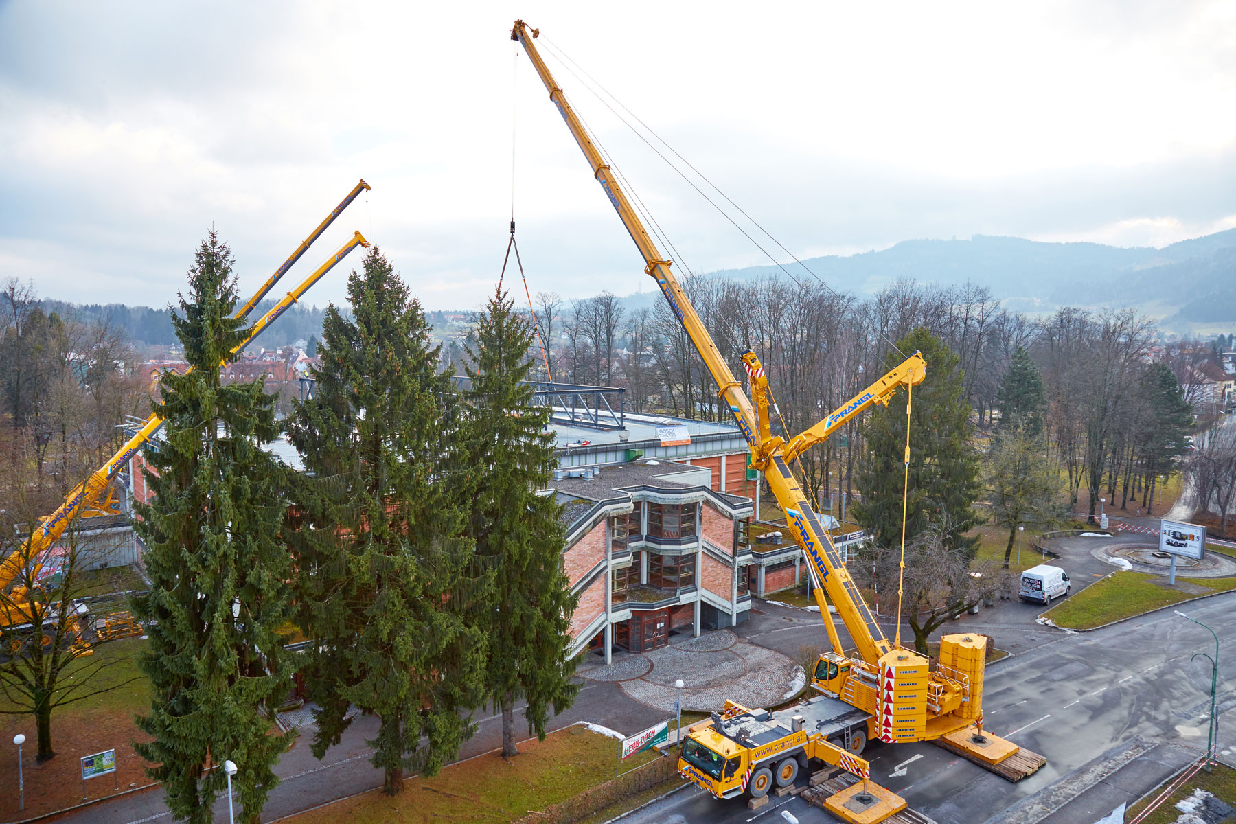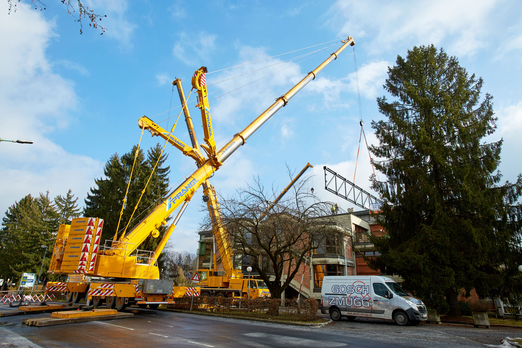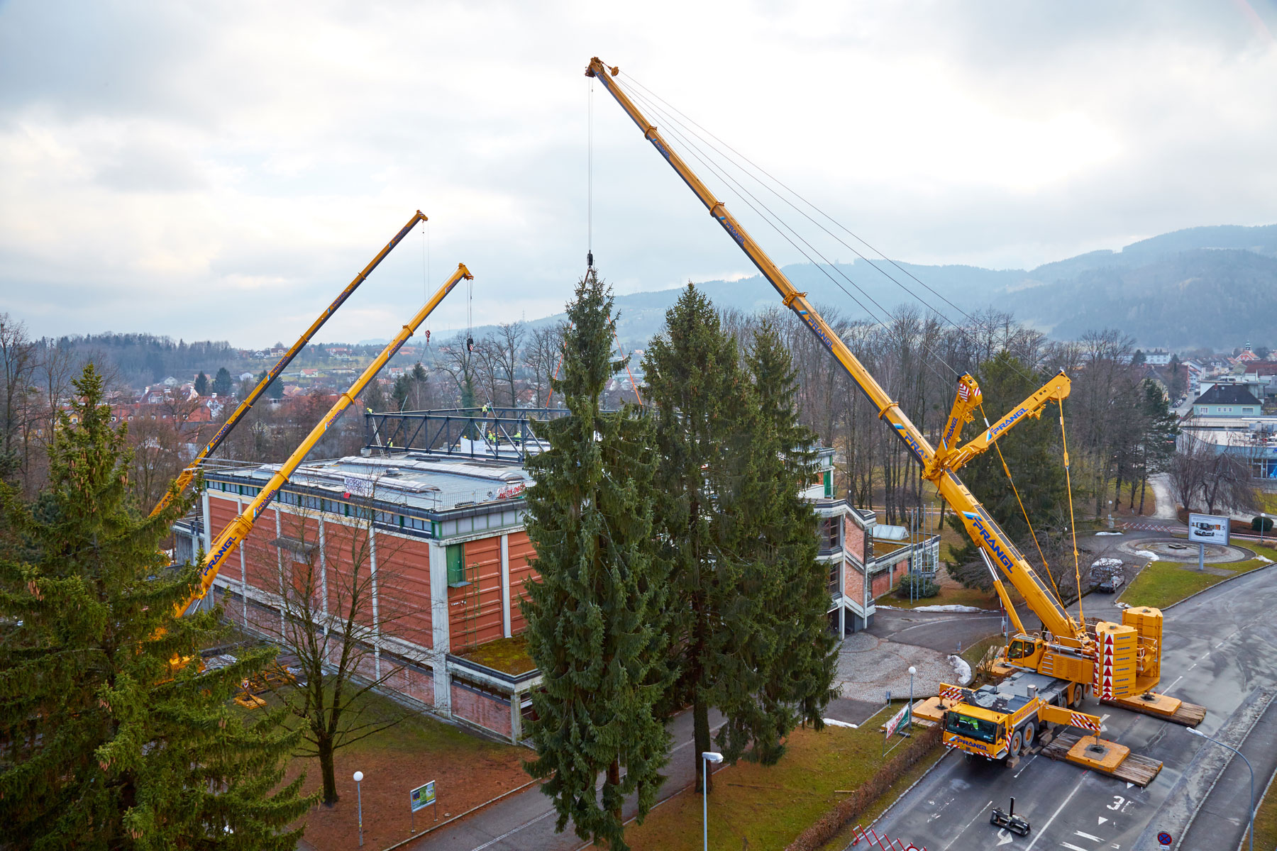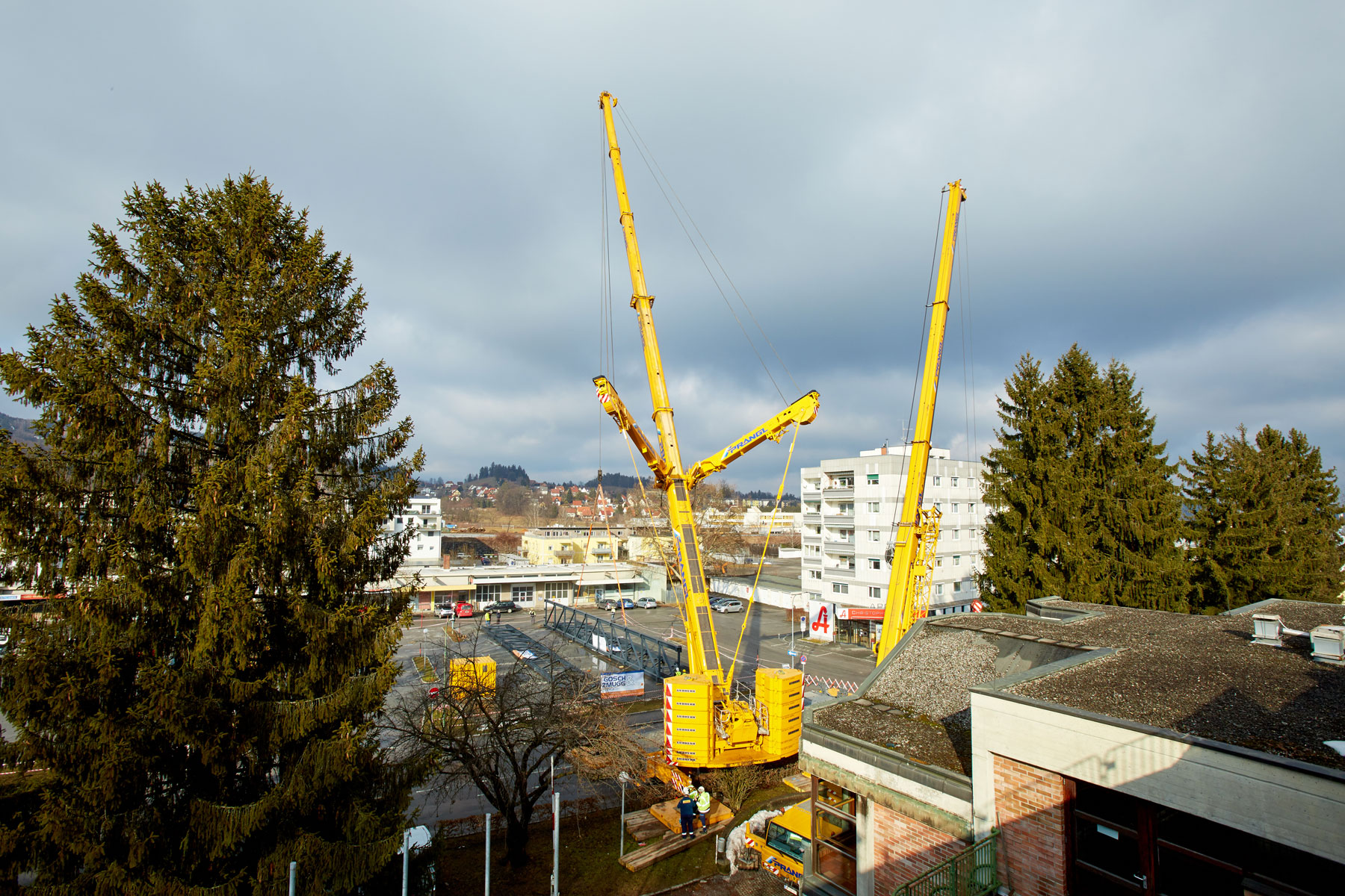 Um eine möglichst reibungslose Hebelogistik zu gewährleisten, wurden die Metallteile direkt auf dem gegenüberliegenden Parkplatz gefertigt und mithilfe des 350 Tonnen Mobilkrans auf den Stahlbetonstützen der Koralmhalle befestigt. Die ganze Aktion erfolgte binnen zwei Tagen. Unterstützt wurde der gesamte Hub von einem 55 Tonnen und einem 70 Tonnen Teleskopkran. Einmal mehr hat das gut eingespielte Prangl-Team dazu beigetragen, dass die Arbeiten zur vollsten Zufriedenheit des Auftraggebers und des Endkunden, der Stadtgemeinde Deutschlandsberg, durchgeführt wurden.