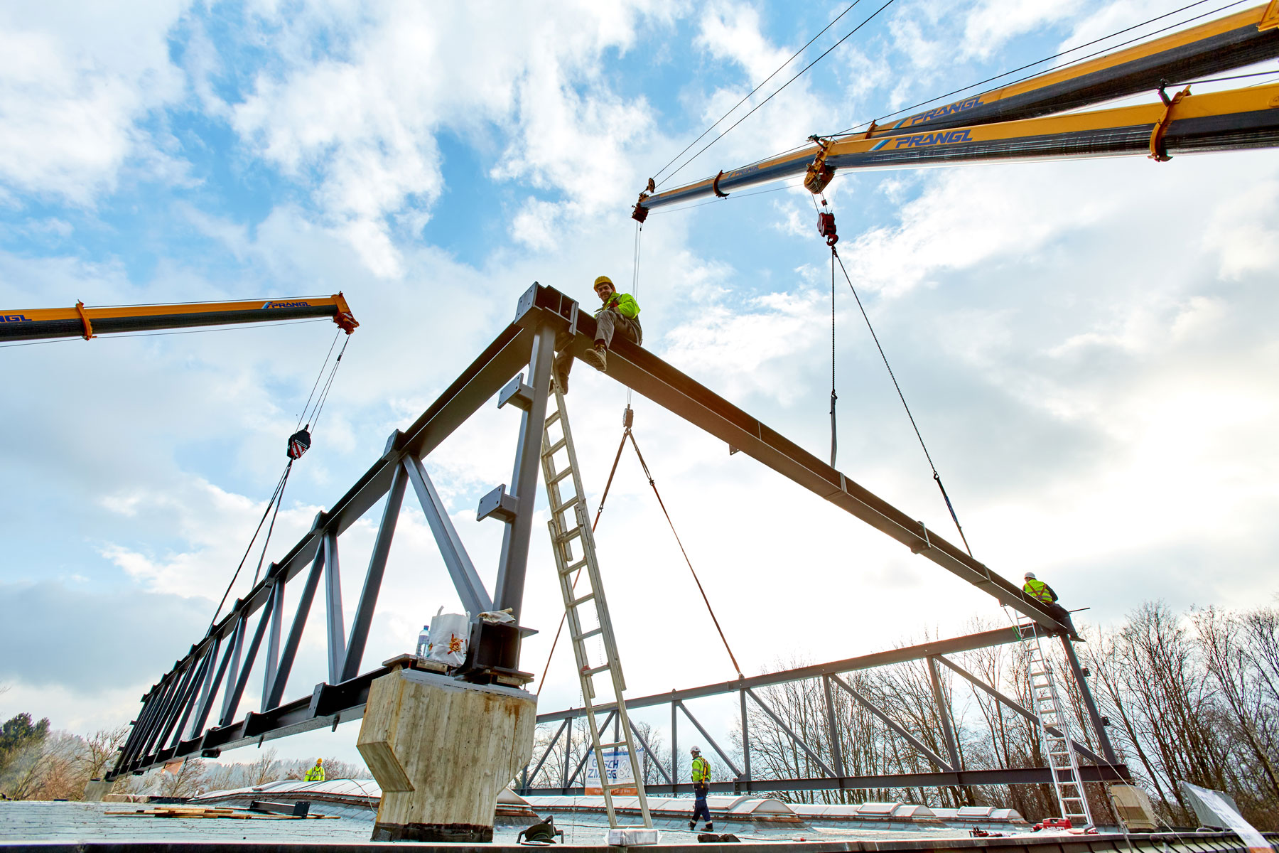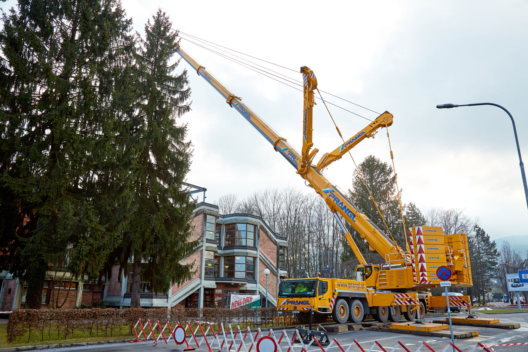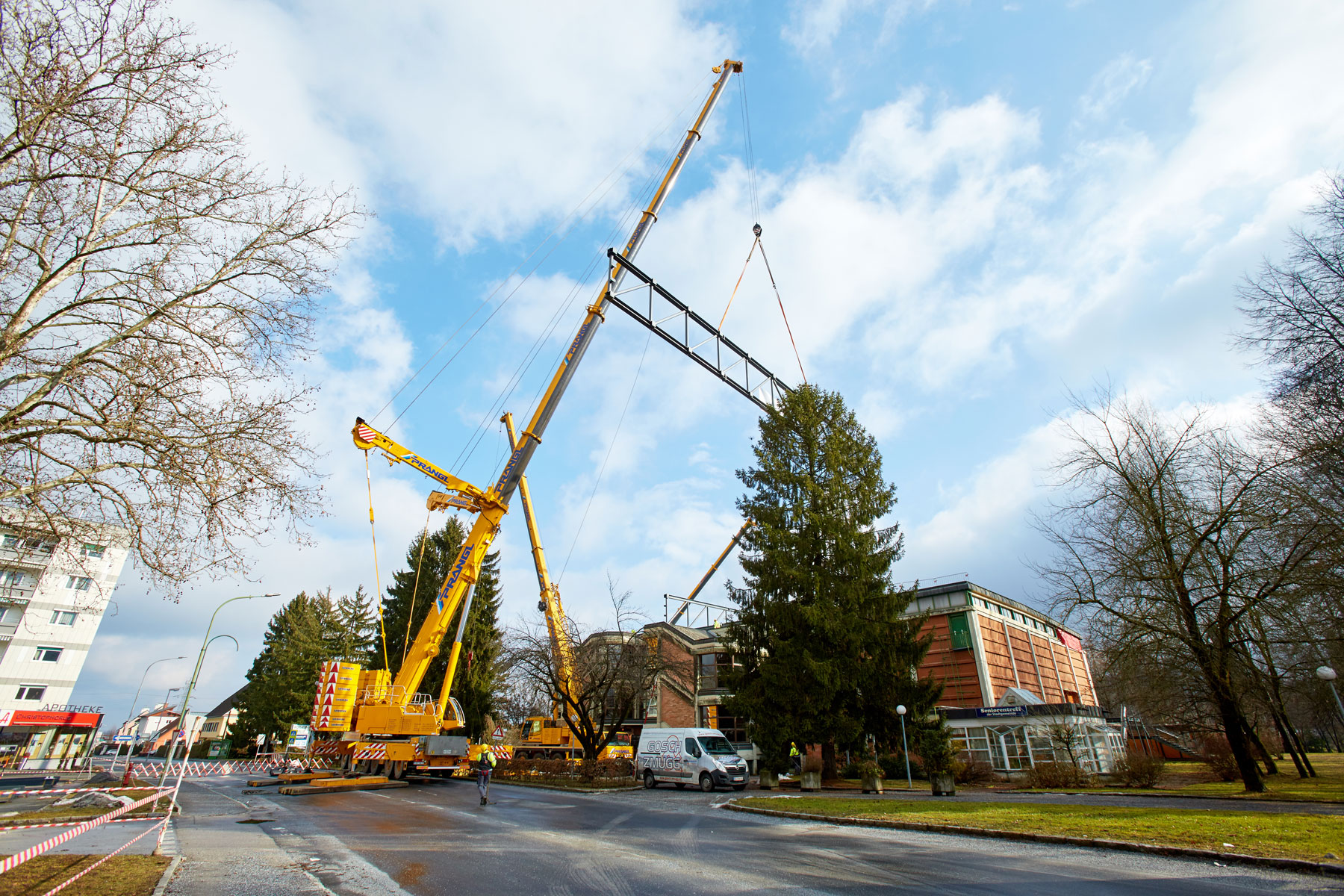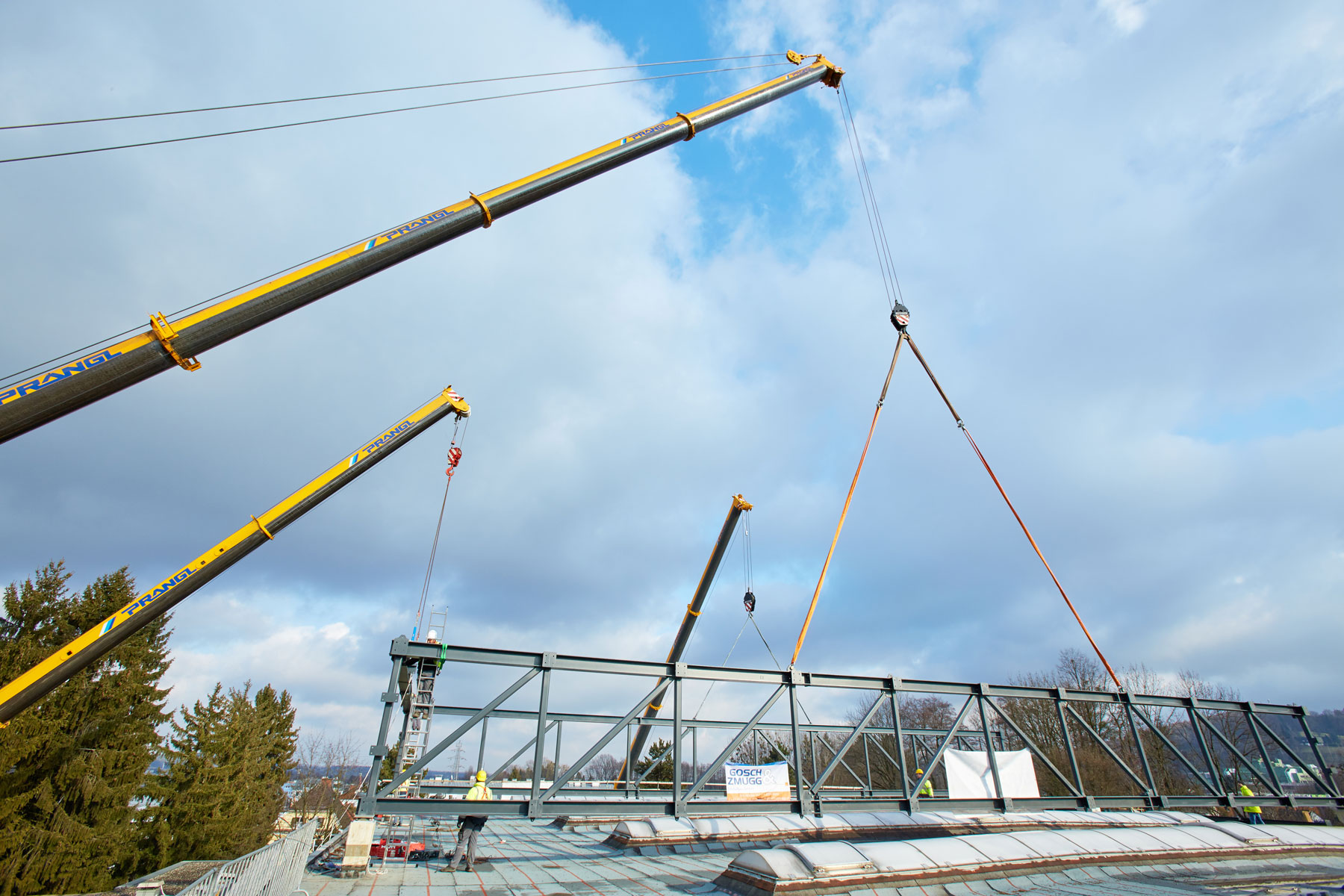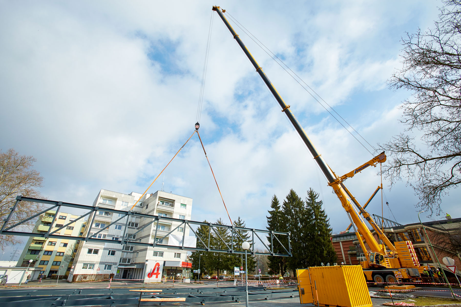Um eine möglichst reibungslose Hebelogistik zu gewährleisten, wurden die Metallteile direkt auf dem gegenüberliegenden Parkplatz gefertigt und mithilfe des 350 Tonnen Mobilkrans auf den Stahlbetonstützen der Koralmhalle befestigt. Die ganze Aktion erfolgte binnen zwei Tagen. Unterstützt wurde der gesamte Hub von einem 55 Tonnen und einem 70 Tonnen Teleskopkran. Einmal mehr hat das gut eingespielte Prangl-Team dazu beigetragen, dass die Arbeiten zur vollsten Zufriedenheit des Auftraggebers und des Endkunden, der Stadtgemeinde Deutschlandsberg, durchgeführt wurden.