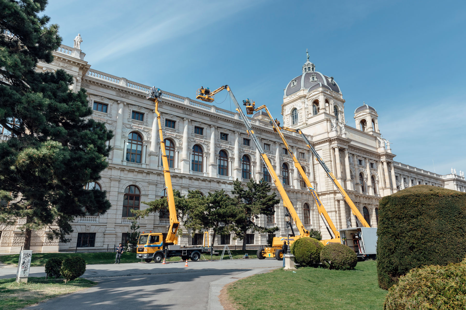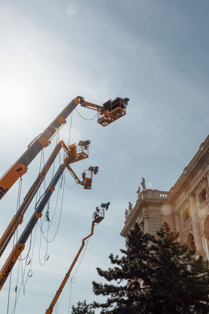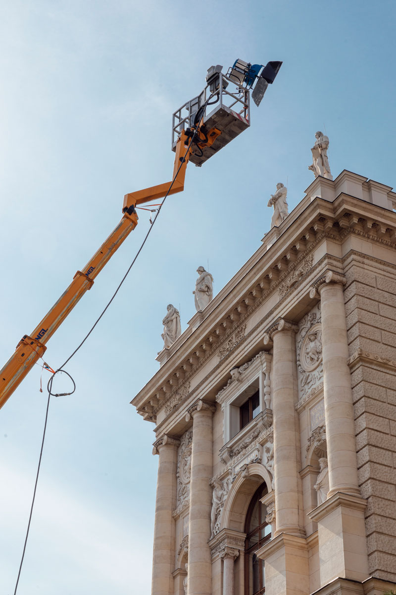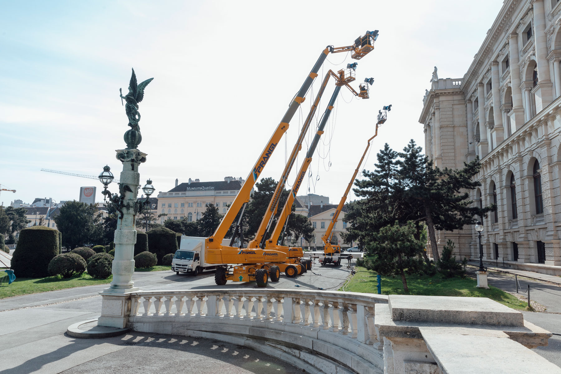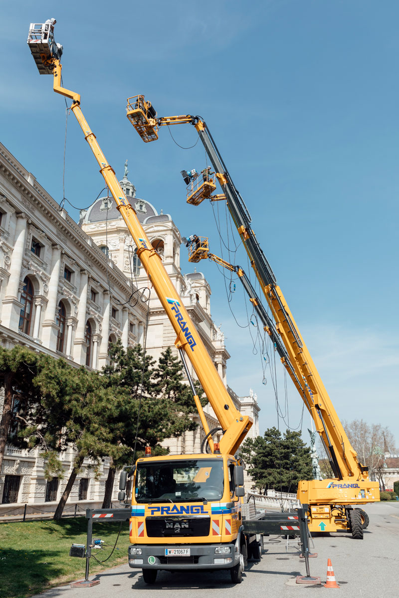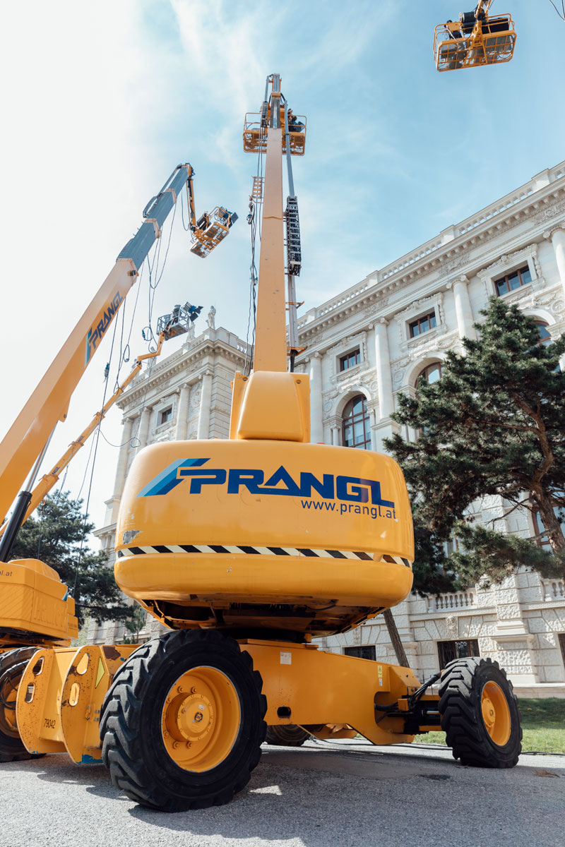 Über die Jahre hat sich Prangl die Expertise erarbeitet, welche Maschinen für welche Art der Dreharbeiten am besten geeignet sind. Für die zweite Episode von “Liebermann“ waren an sechs Drehorten 11 unterschiedliche Arbeitsbühnentypen im Einsatz. Alleine für den Einsatz vor dem Naturhistorischen Museum wurden 5 Geräte bereitgestellt: 3 Stück Teleskop-Arbeitsbühnen mit 34 Meter Arbeitshöhe, eine LKW-Arbeitsbühne mit 28 Meter und eine mit 33 Meter Arbeitshöhe. Die fachmännische Unterstützung des gesamten Prangl-Teams hat wieder einmal bestens geklappt, sodass alle Drehtage zur vollsten Zufriedenheit abgewickelt werden konnten.