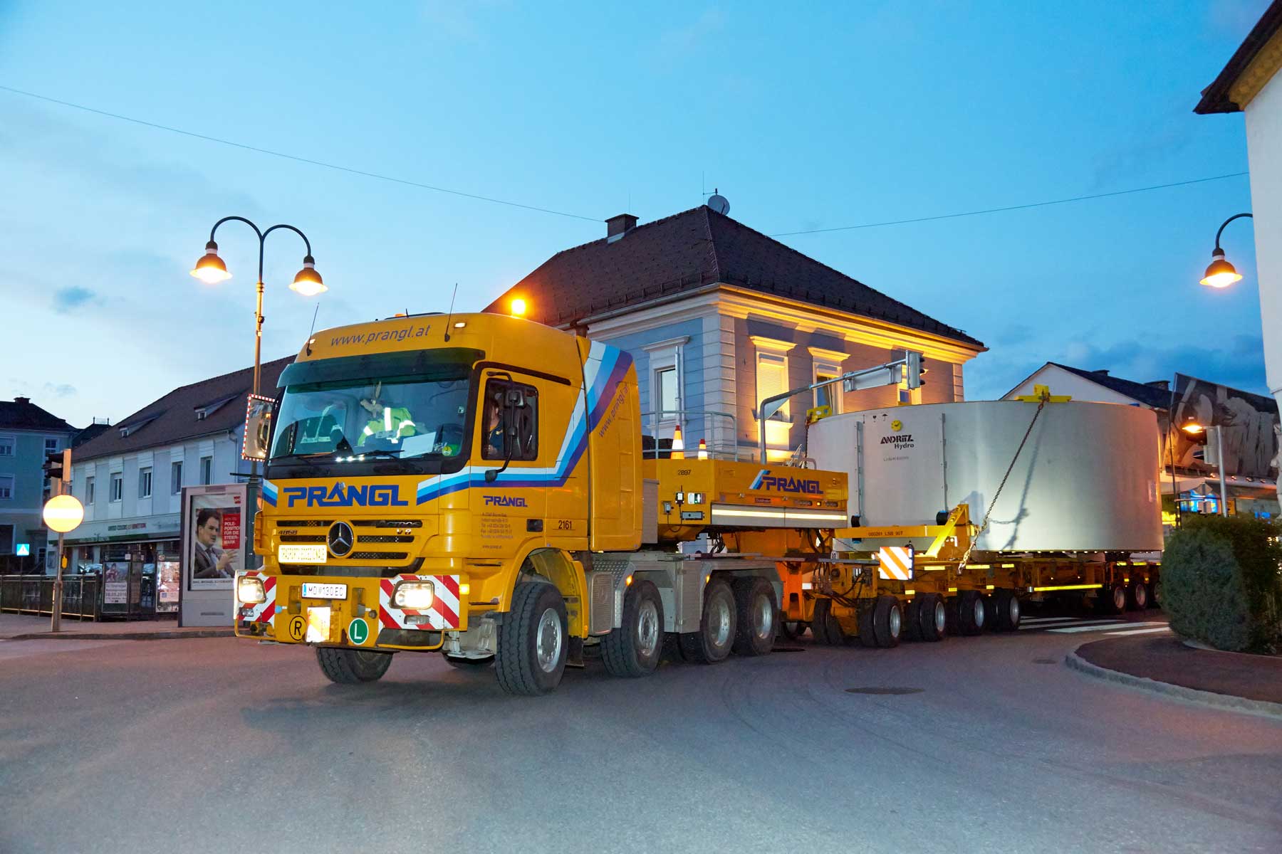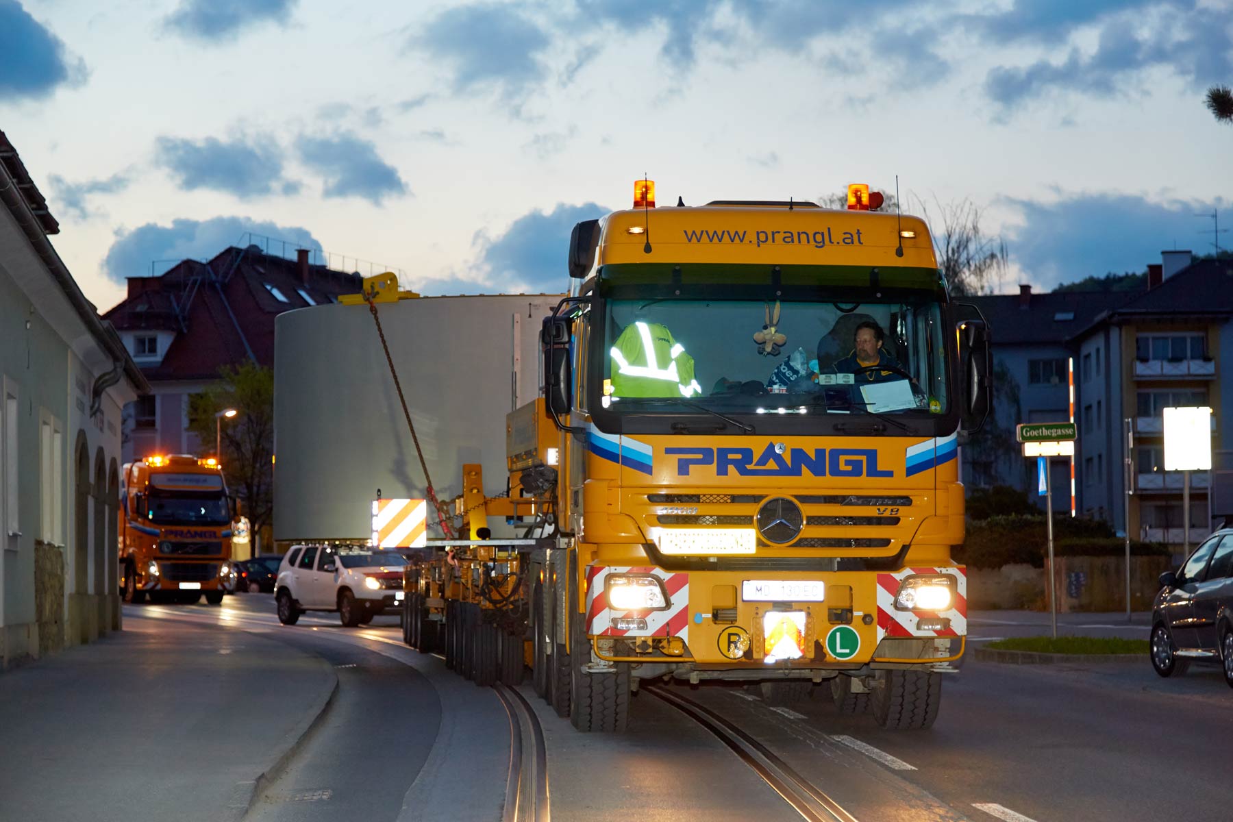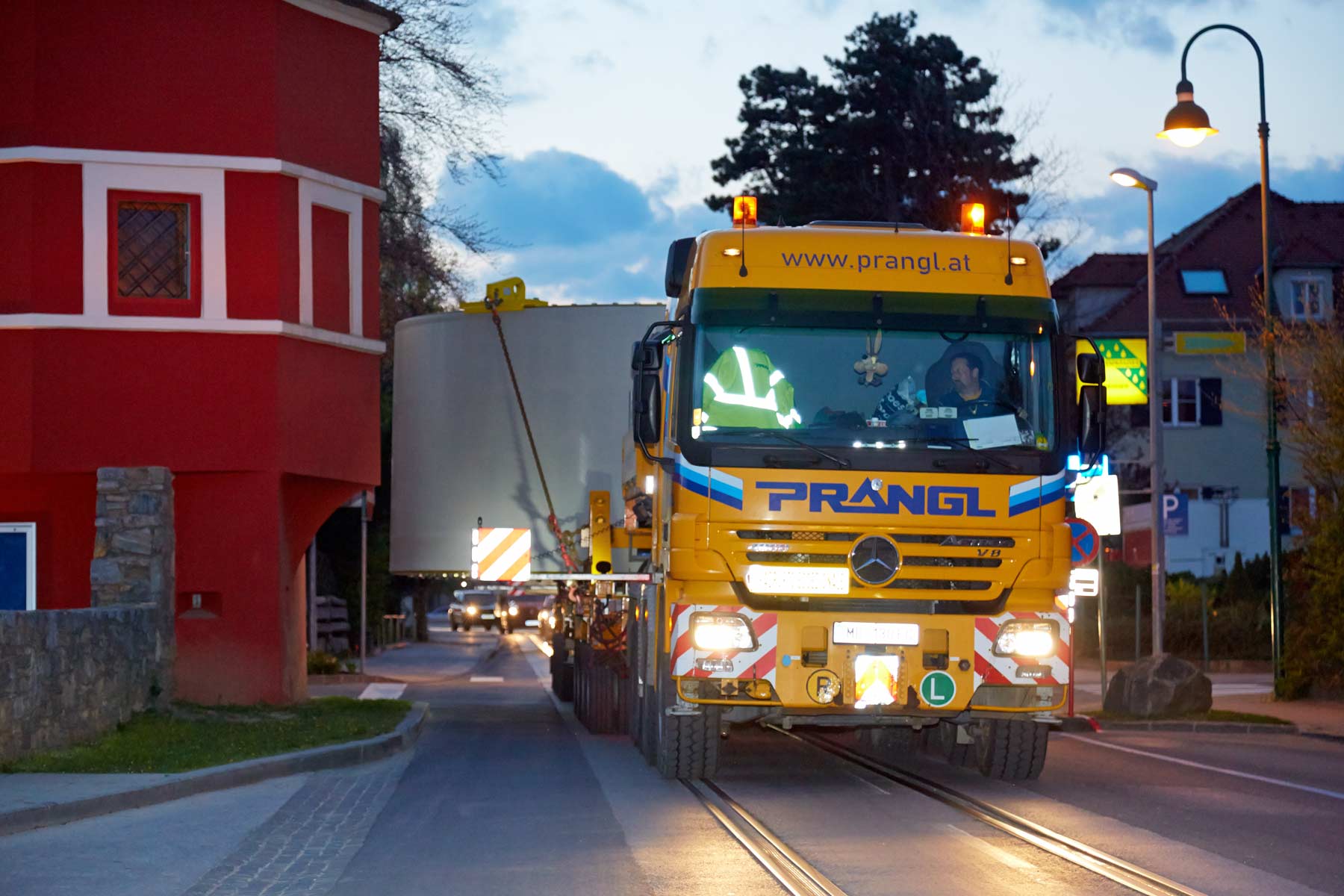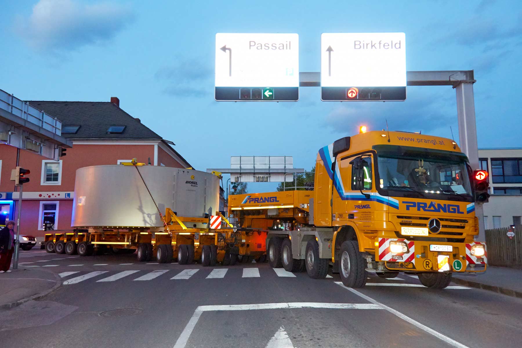 Die zwei mächtigen Anlagenbauteile waren vom Stadtgebiet Weiz zum Hafen Krems zu transportieren. Die Gesamtfahrzeugabmessungen mit einer Länge von 27 Meter, einer Breite von 6,80 Meter, einer Höhe von 4,50 Meter und einem Gesamtgewicht von 132 Tonnen sorgten dabei nicht nur bei den zahlreichen Zaungästen für einen imposanten Anblick, sondern stellte auch die Experten von Prangl vor eine interessante Herausforderung.