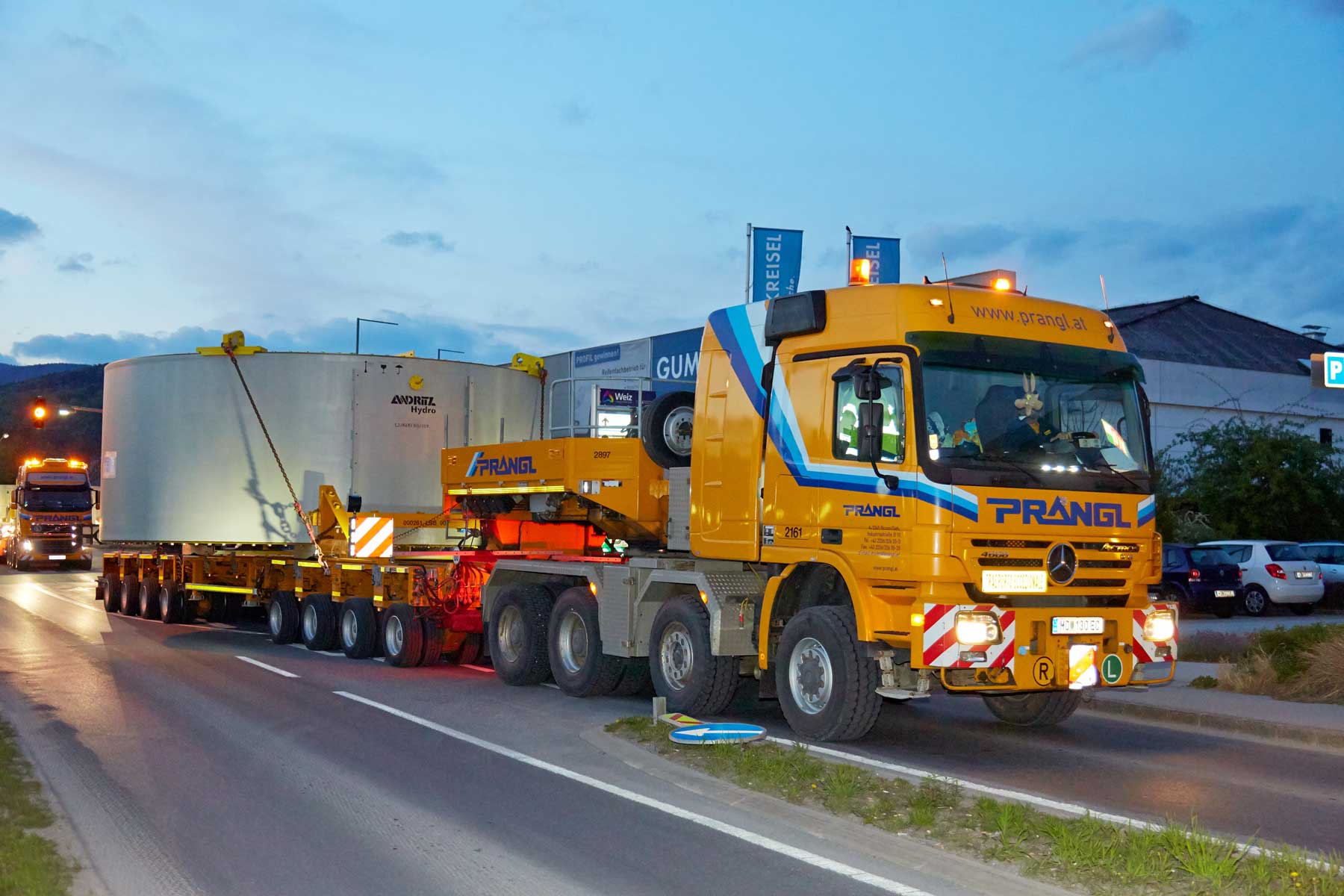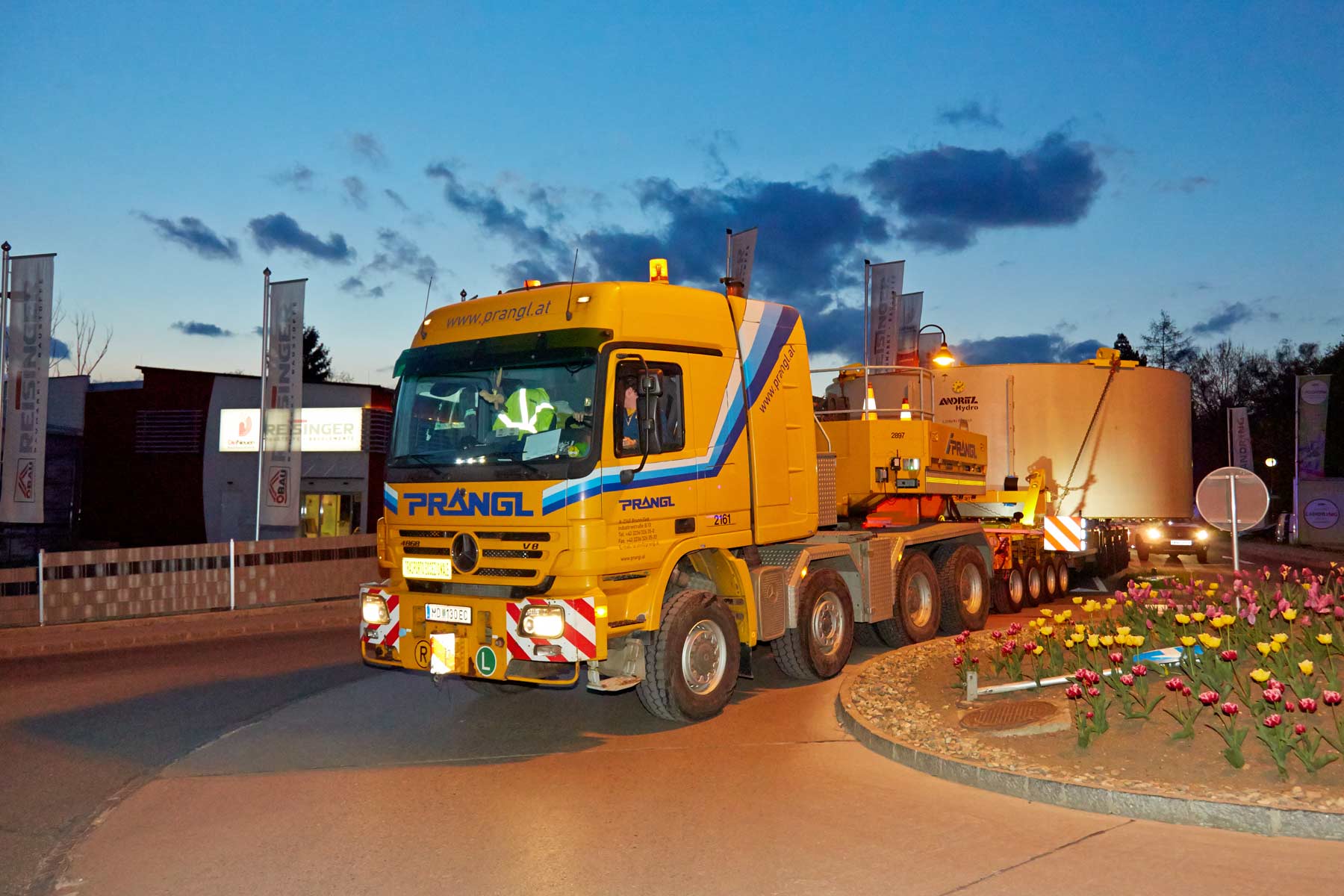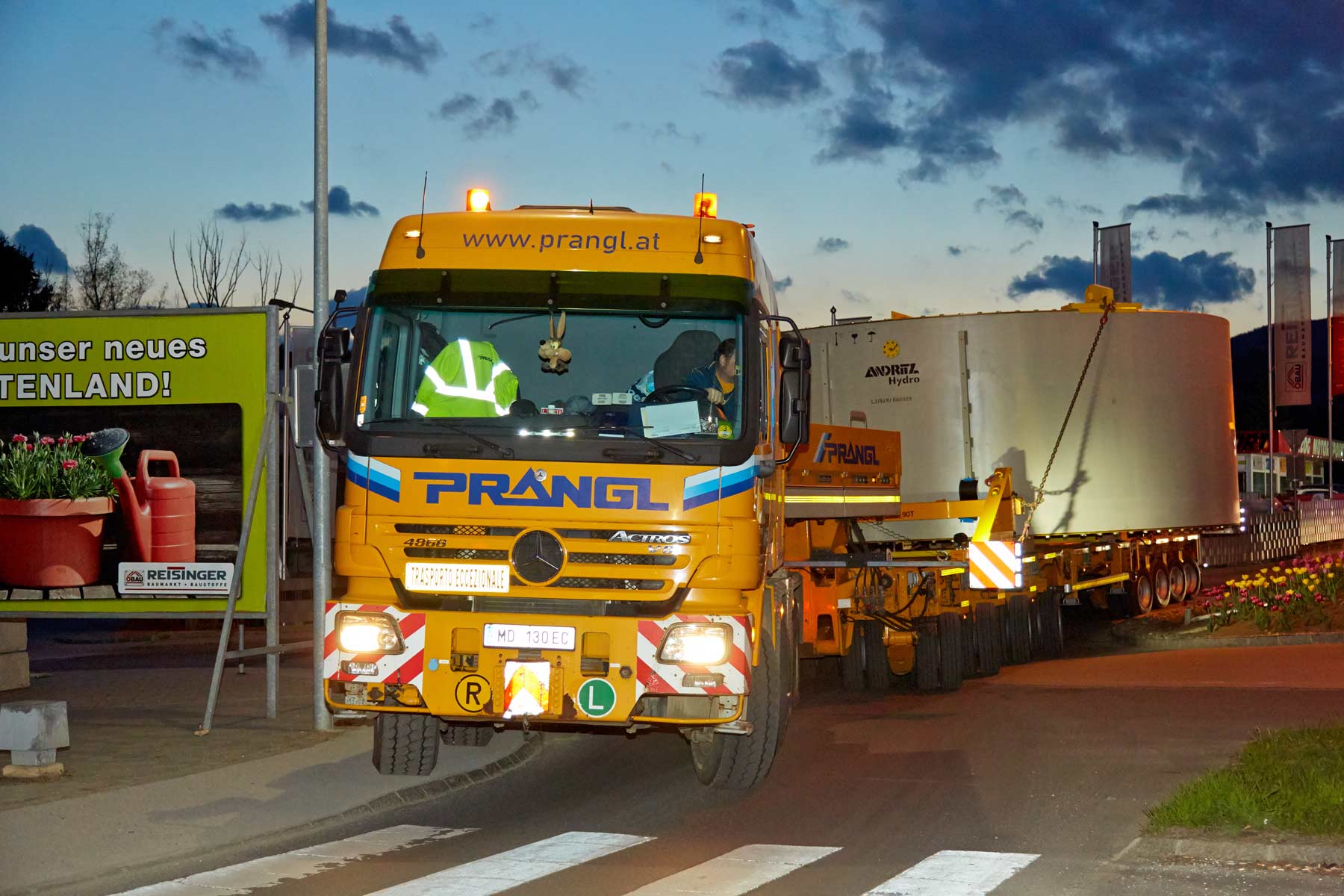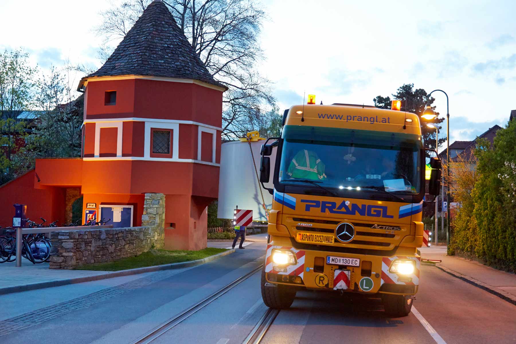 Die zwei mächtigen Anlagenbauteile waren vom Stadtgebiet Weiz zum Hafen Krems zu transportieren. Die Gesamtfahrzeugabmessungen mit einer Länge von 27 Meter, einer Breite von 6,80 Meter, einer Höhe von 4,50 Meter und einem Gesamtgewicht von 132 Tonnen sorgten dabei nicht nur bei den zahlreichen Zaungästen für einen imposanten Anblick, sondern stellte auch die Experten von Prangl vor eine interessante Herausforderung.