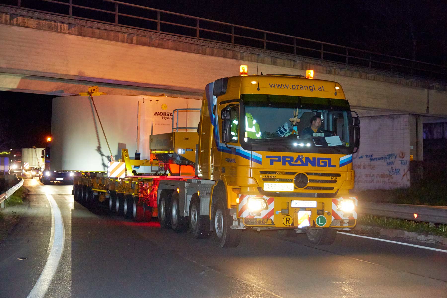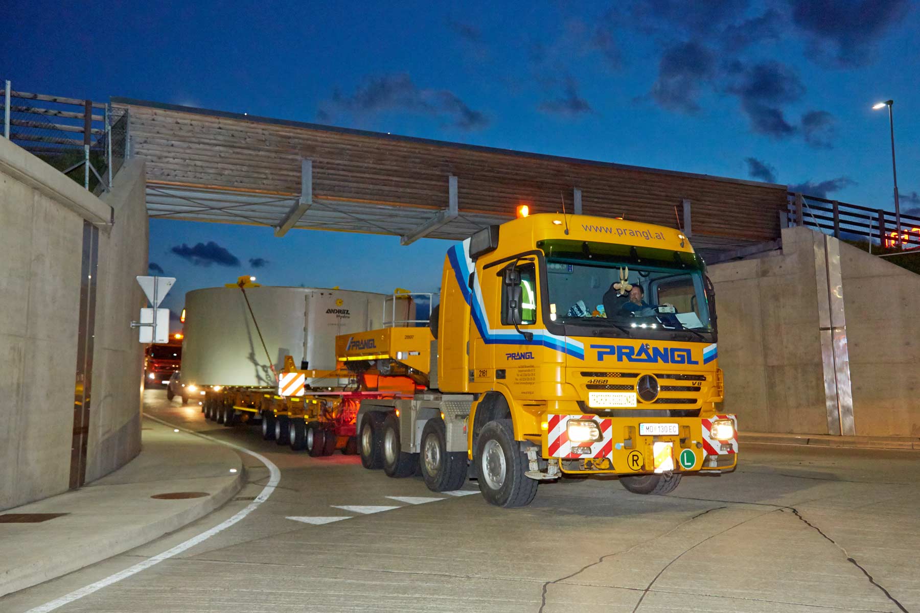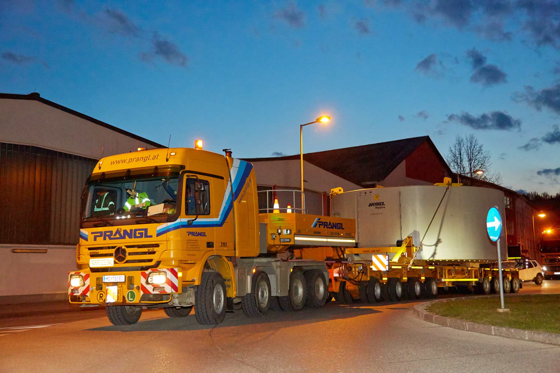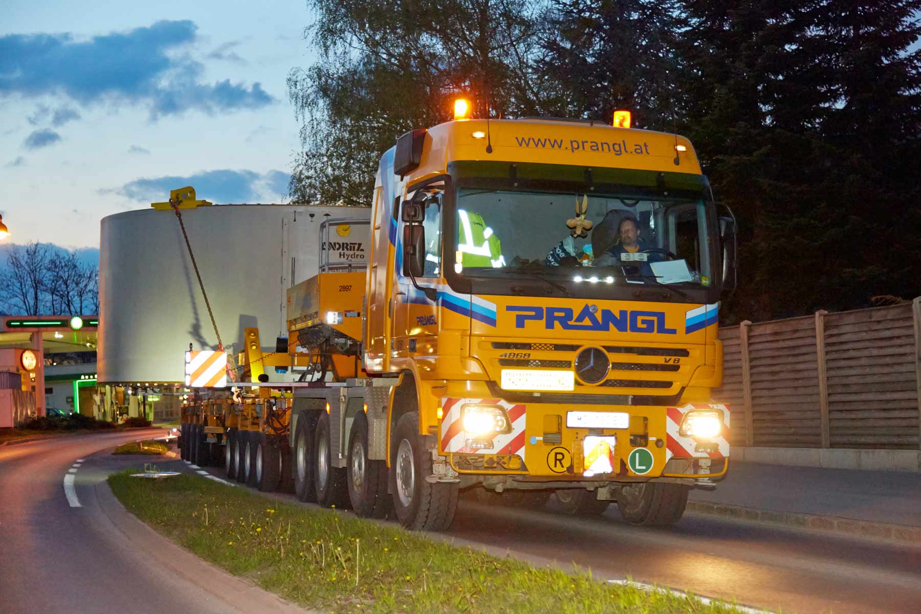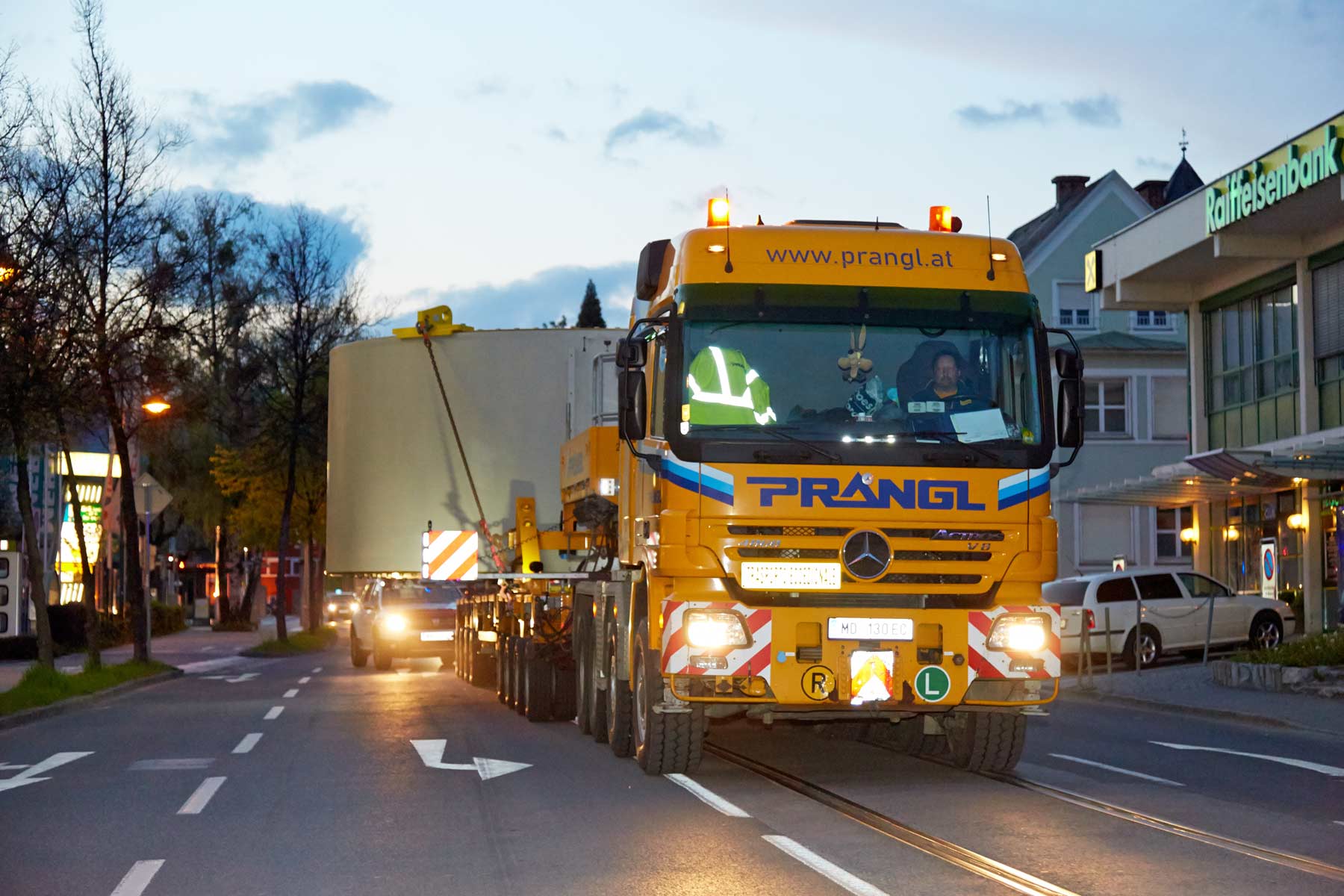 Die zwei mächtigen Anlagenbauteile waren vom Stadtgebiet Weiz zum Hafen Krems zu transportieren. Die Gesamtfahrzeugabmessungen mit einer Länge von 27 Meter, einer Breite von 6,80 Meter, einer Höhe von 4,50 Meter und einem Gesamtgewicht von 132 Tonnen sorgten dabei nicht nur bei den zahlreichen Zaungästen für einen imposanten Anblick, sondern stellte auch die Experten von Prangl vor eine interessante Herausforderung.