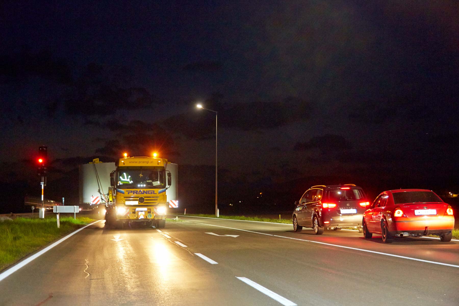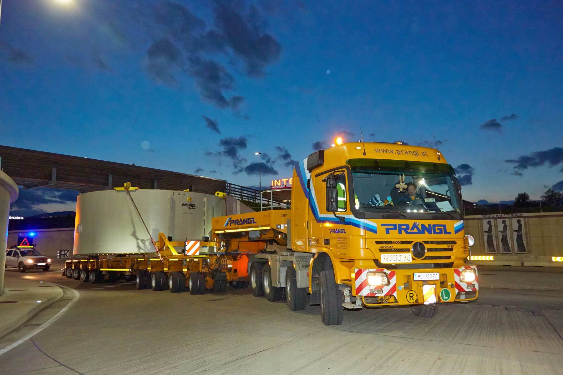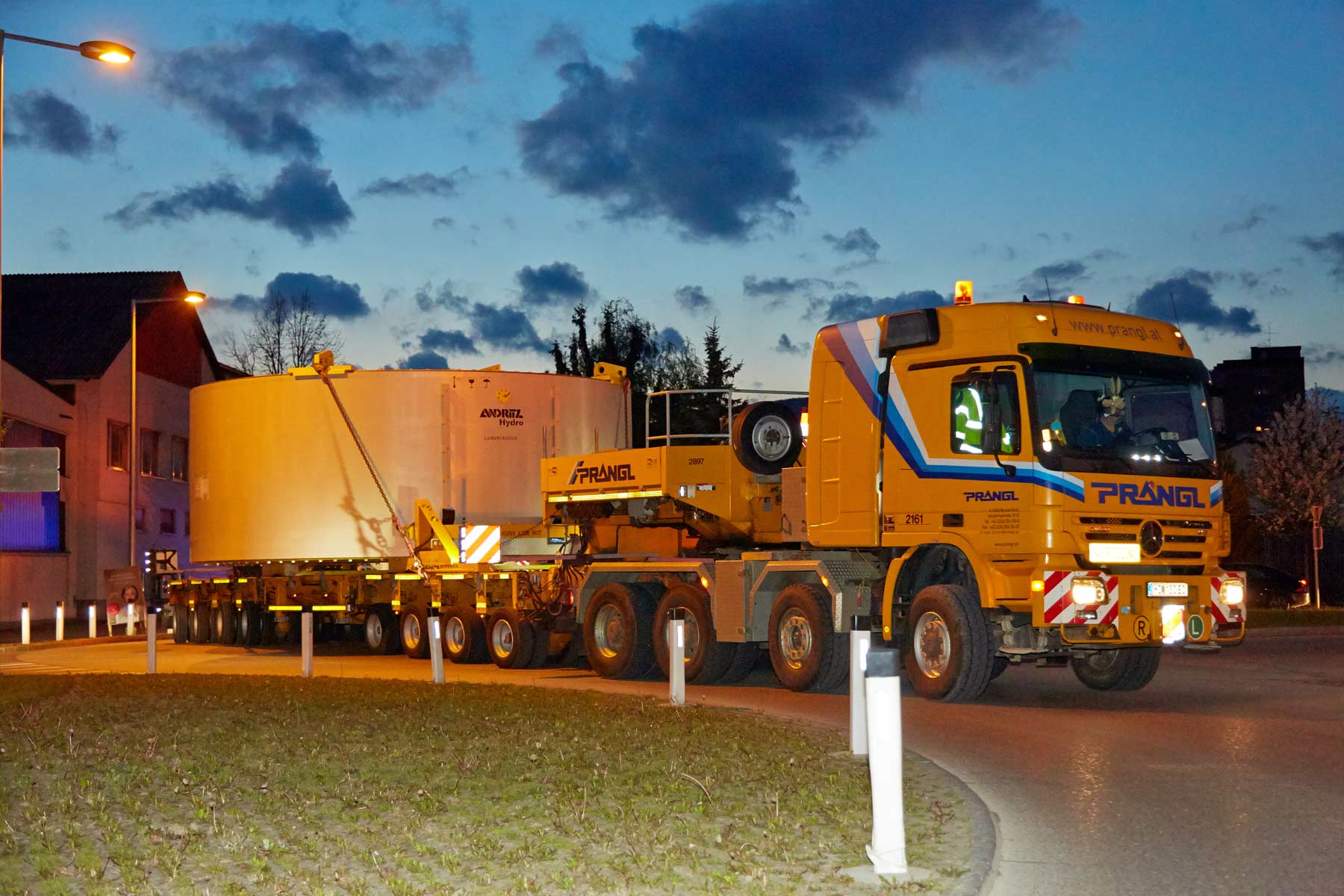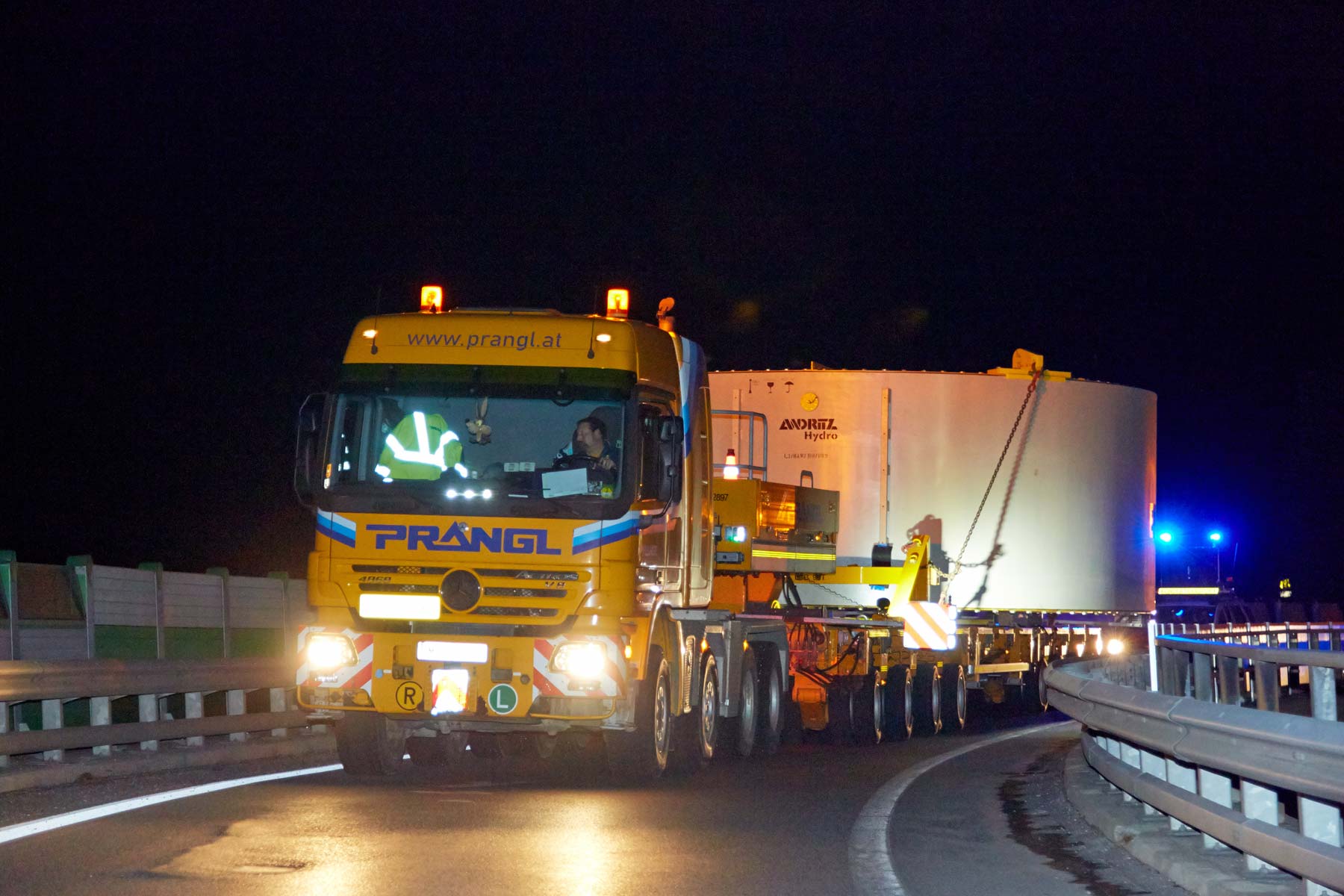 Die zwei mächtigen Anlagenbauteile waren vom Stadtgebiet Weiz zum Hafen Krems zu transportieren. Die Gesamtfahrzeugabmessungen mit einer Länge von 27 Meter, einer Breite von 6,80 Meter, einer Höhe von 4,50 Meter und einem Gesamtgewicht von 132 Tonnen sorgten dabei nicht nur bei den zahlreichen Zaungästen für einen imposanten Anblick, sondern stellte auch die Experten von Prangl vor eine interessante Herausforderung.