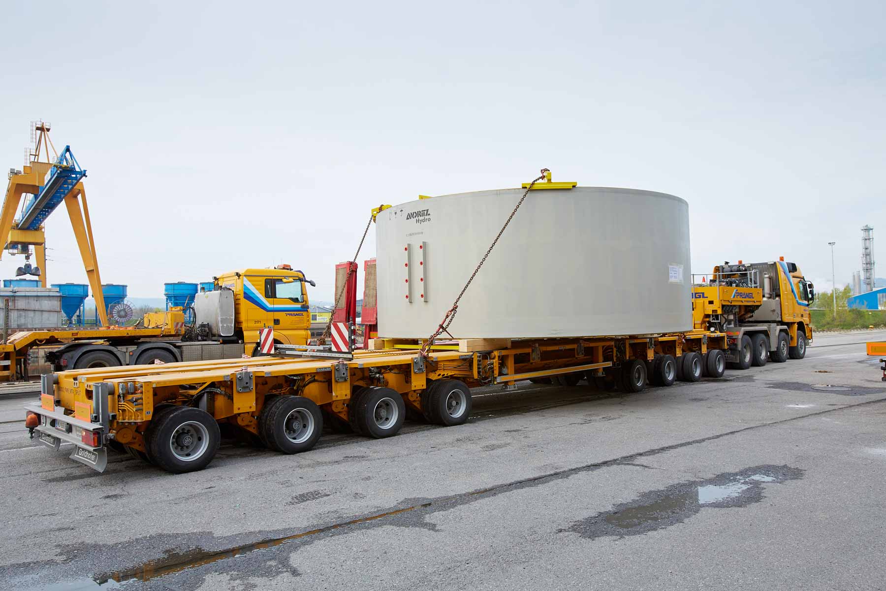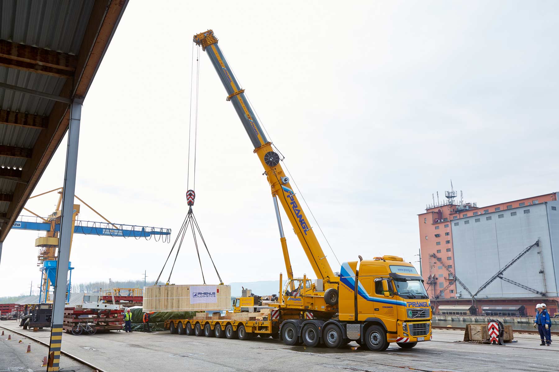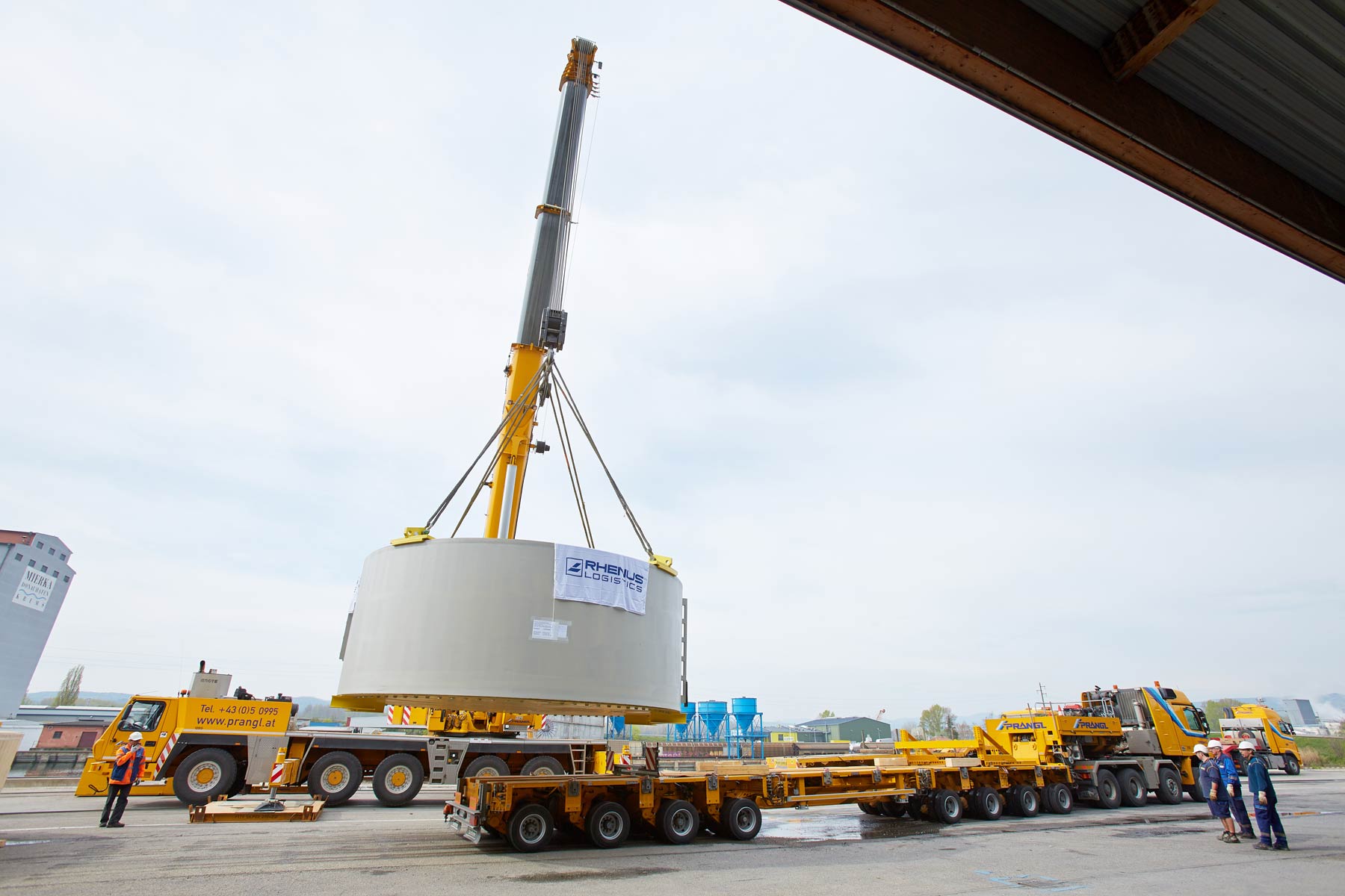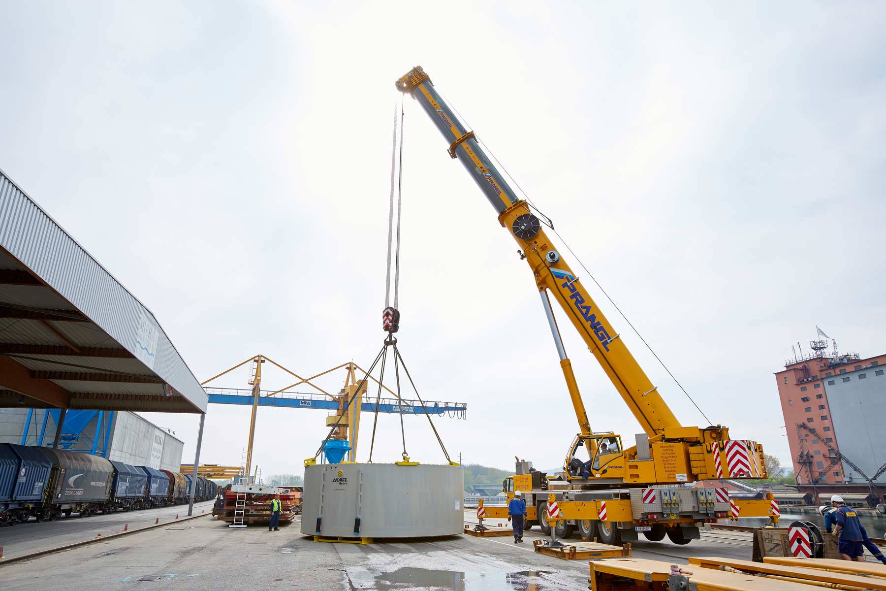 Besonders die Durchfahrt durch die teilweise engen Kurven im Stadtkern von Weiz sowie einige Baustellen im Autobahnbereich der A2 forderten auch den erfahrenen Chauffeuren ihr ganzes Können ab. Aufgrund der akribischen Transportplanung im Vorfeld sowie der perfekten Zusammenarbeit des eingespielten Prangl-Teams vor Ort stellten auch diese Situationen keine Probleme dar. Die beiden Sondertransporte trafen planmäßig nach ca. siebenstündiger Fahrzeit im Konvoi am Hafen ein. Dort wurden sie bereits von einem 220 Tonnen Teleskopkran erwartet, der die beiden Bauteile fachmännisch und unter größter Sorgfalt entlud.