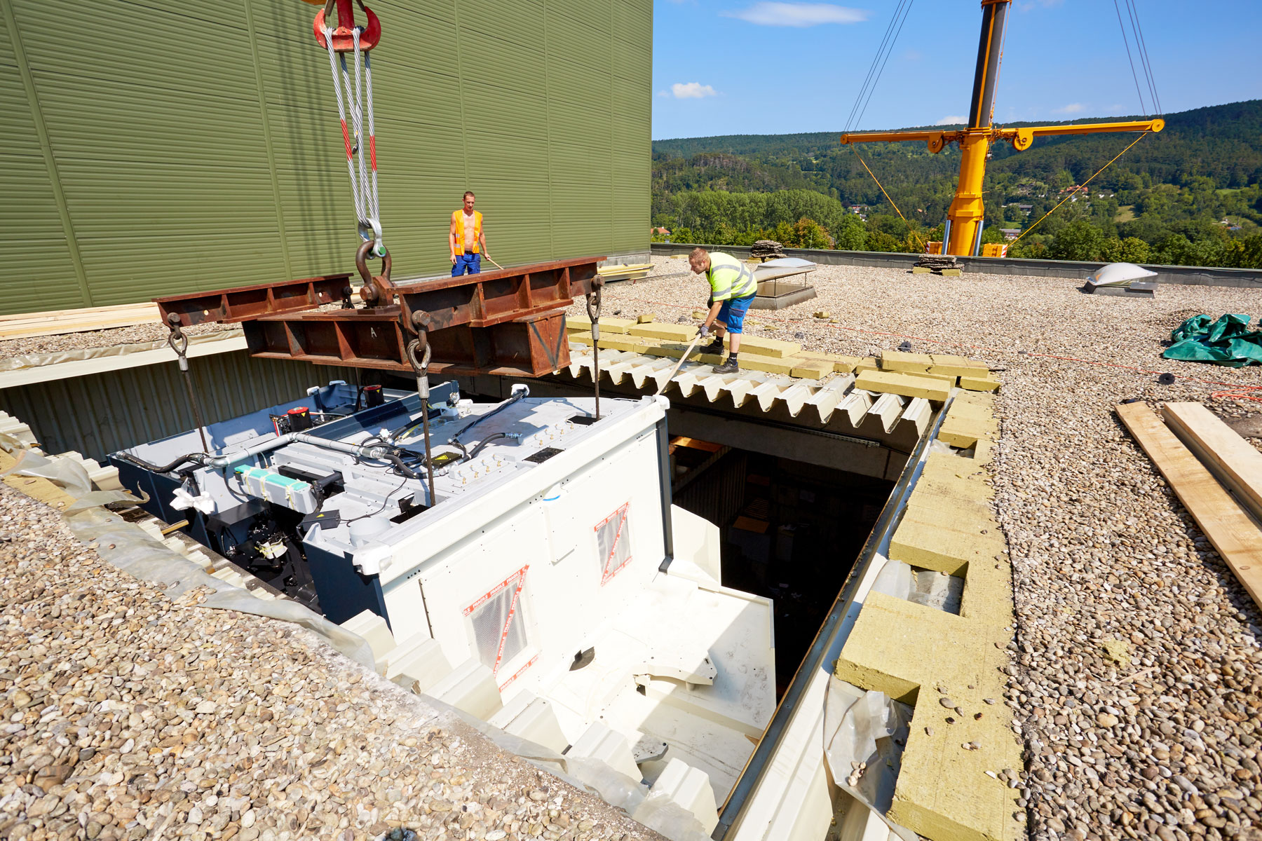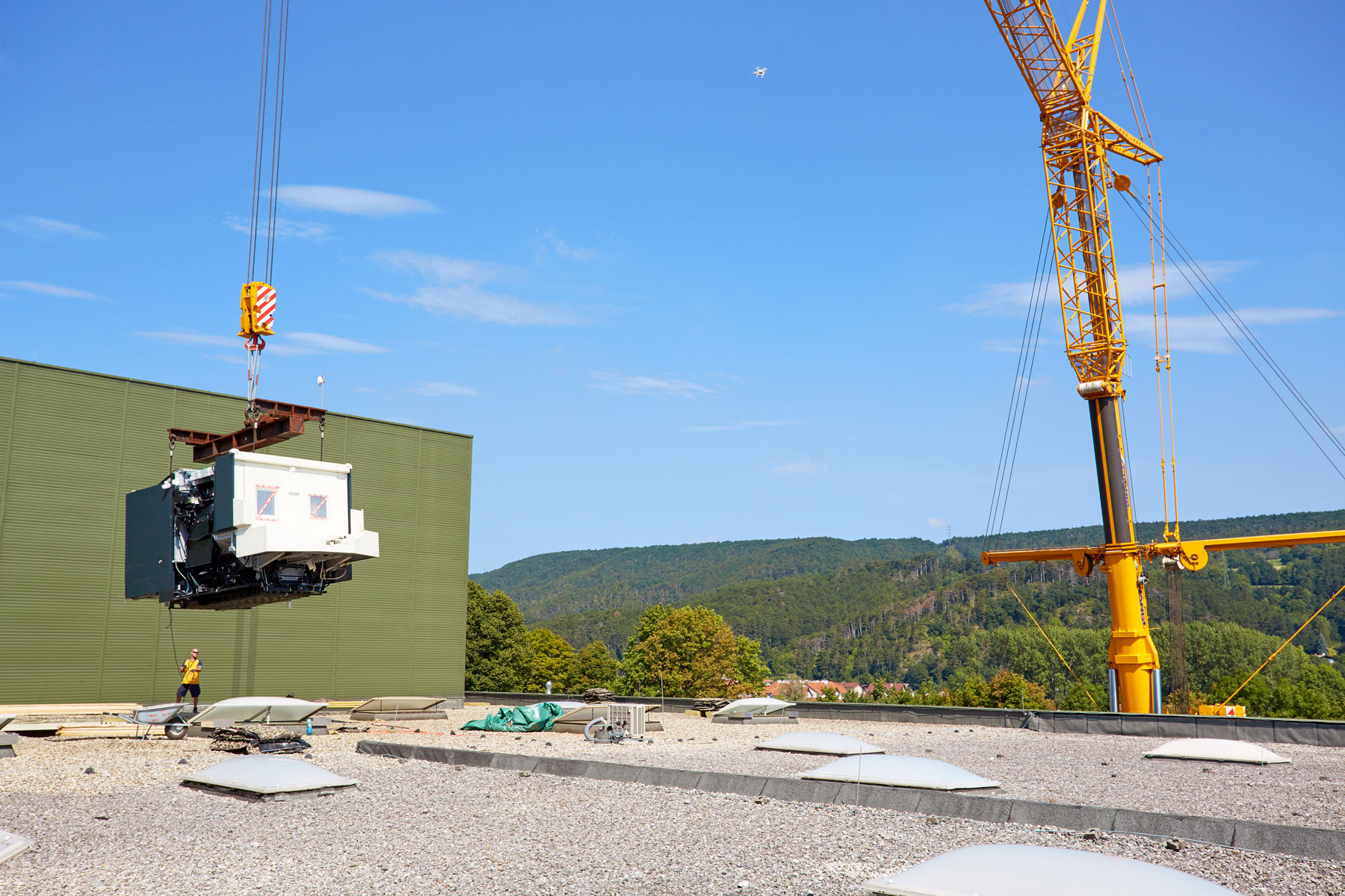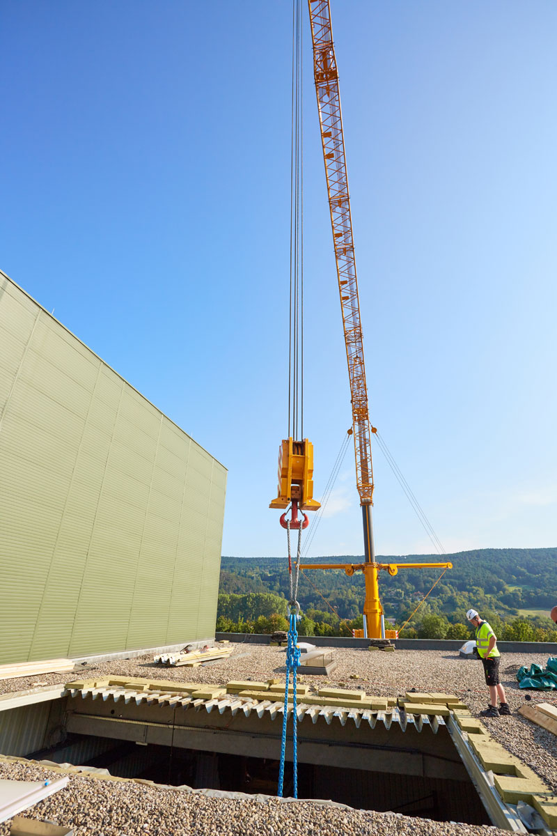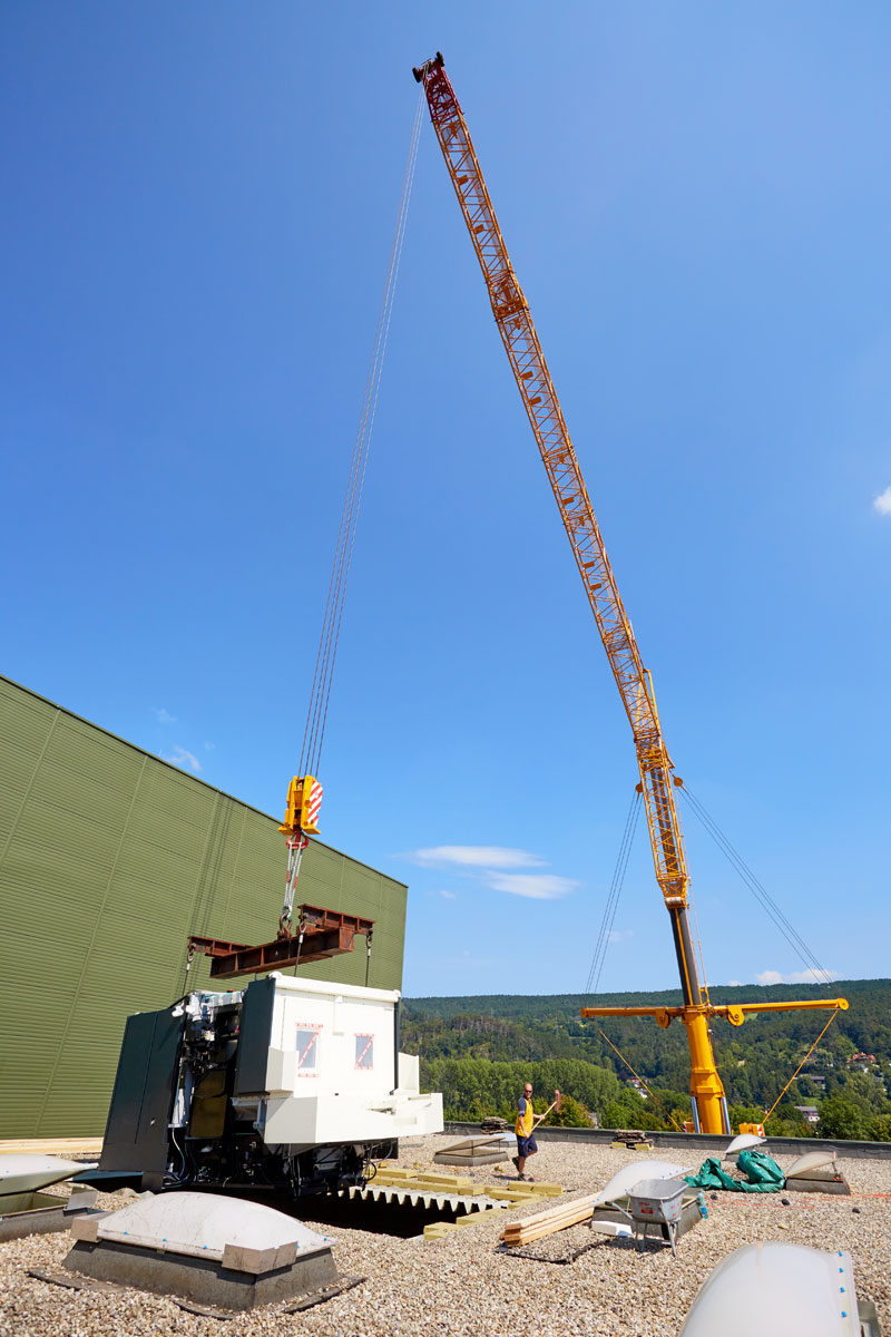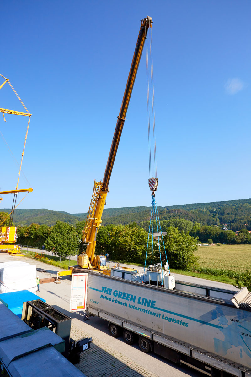 Die einzig verbleibende Lösung war das Einheben über das Dach. Zu diesem Zweck wurde ein 20 m² großes Loch in das Hallendach geschnitten. Aufgabe des Kranfahrers war es nun das teure Gut sorgfältig durch die Öffnung einzuheben. Aufgrund der großen seitlichen Ausladung von 58 Meter und einem Hubgewicht von 29 Tonnen (Maschine und Heberahmen) war die sinnvollste und wirtschaftlichste Maschine der PTK 1000, ein 1000 Tonnen Teleskopkran.