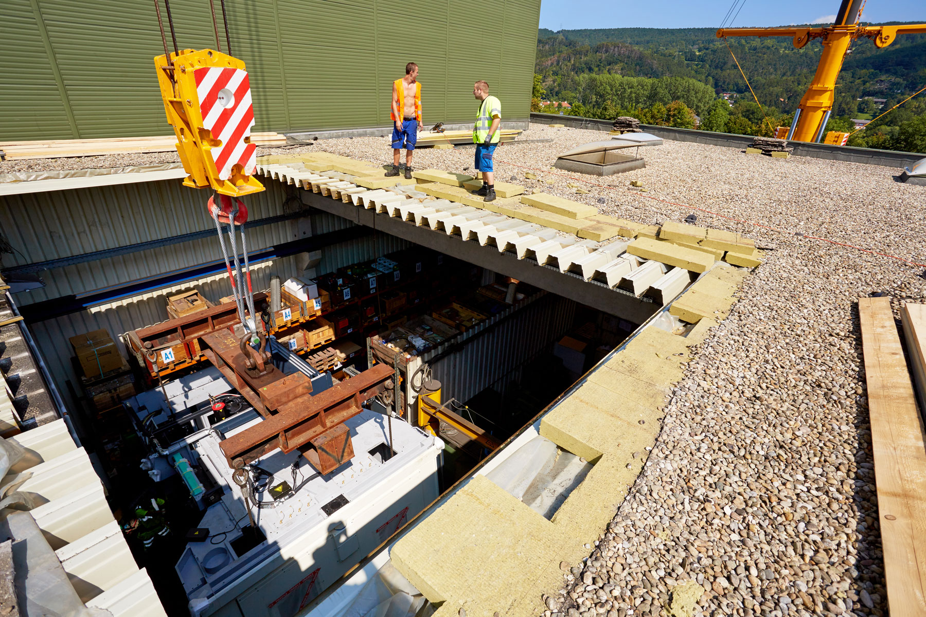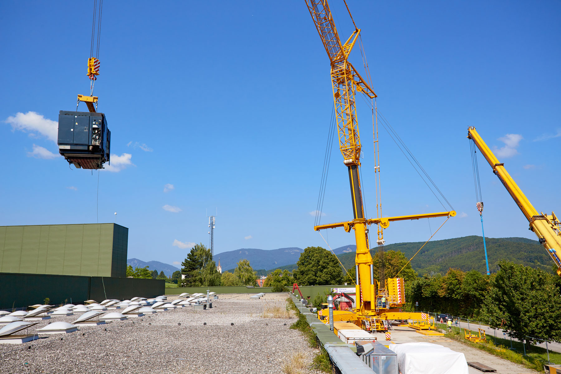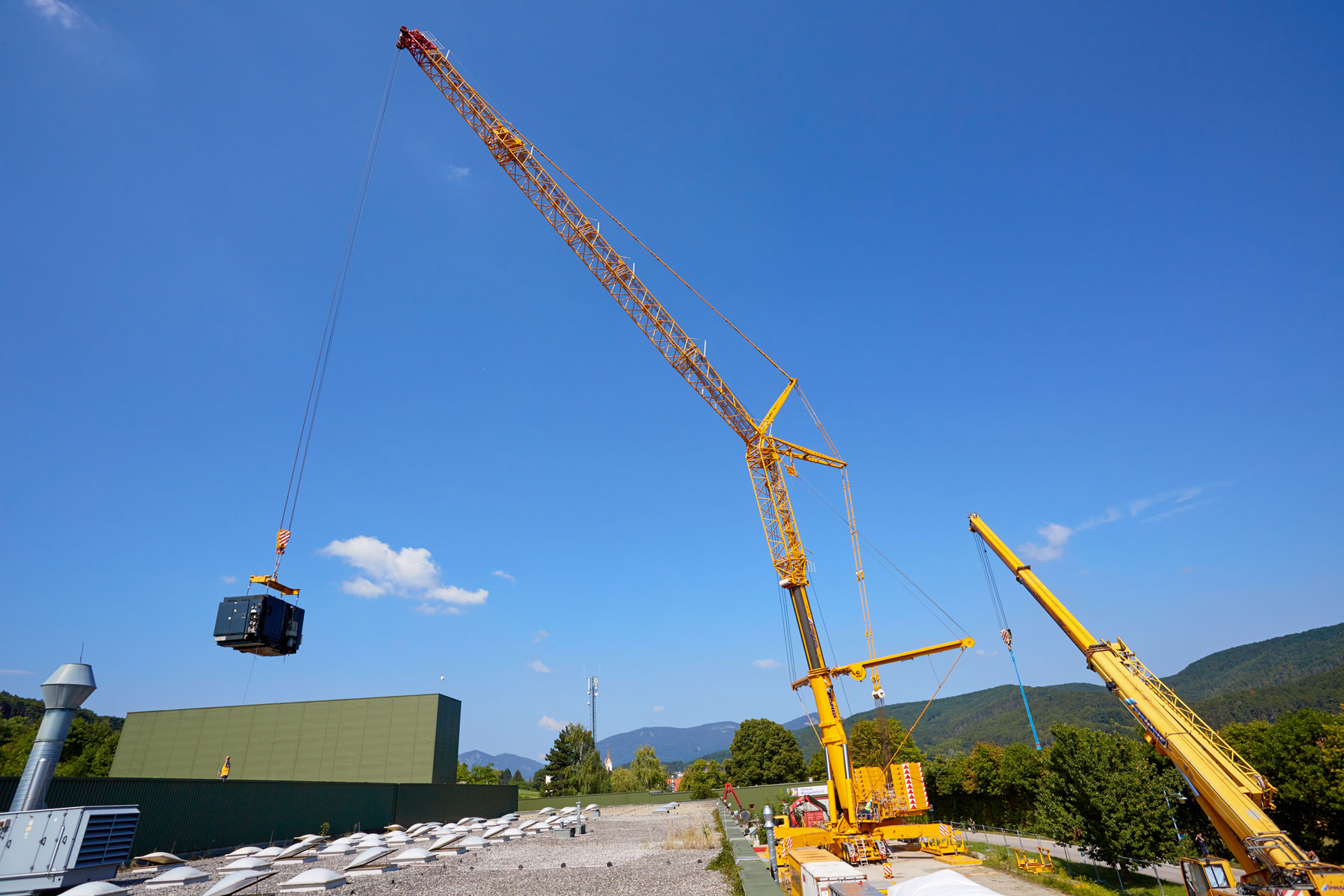 Österreichs stärkster Teleskopkran wurde mit einer Systemlänge von 93,2 Meter aufgebaut und brachte in Summe 422 Tonnen auf die Waage. Ganz wesentlich für den Einsatz war die genaue Stellfläche des gelben Giganten als auch die exakte Position der Dachöffnung. Dies alles wurde vom Prangl-Engineering ausgearbeitet und dem Kunden zur Umsetzung vorgelegt. Nachdem alle Maßnahmen vorzüglich umgesetzt wurden, konnte der Hub einwandfrei durchgeführt werden.