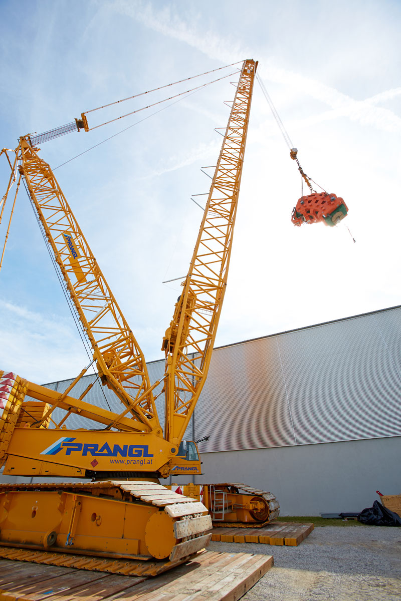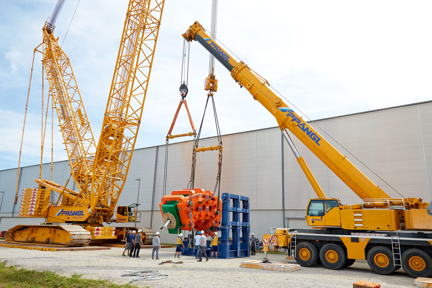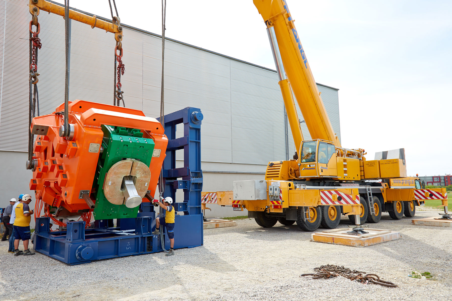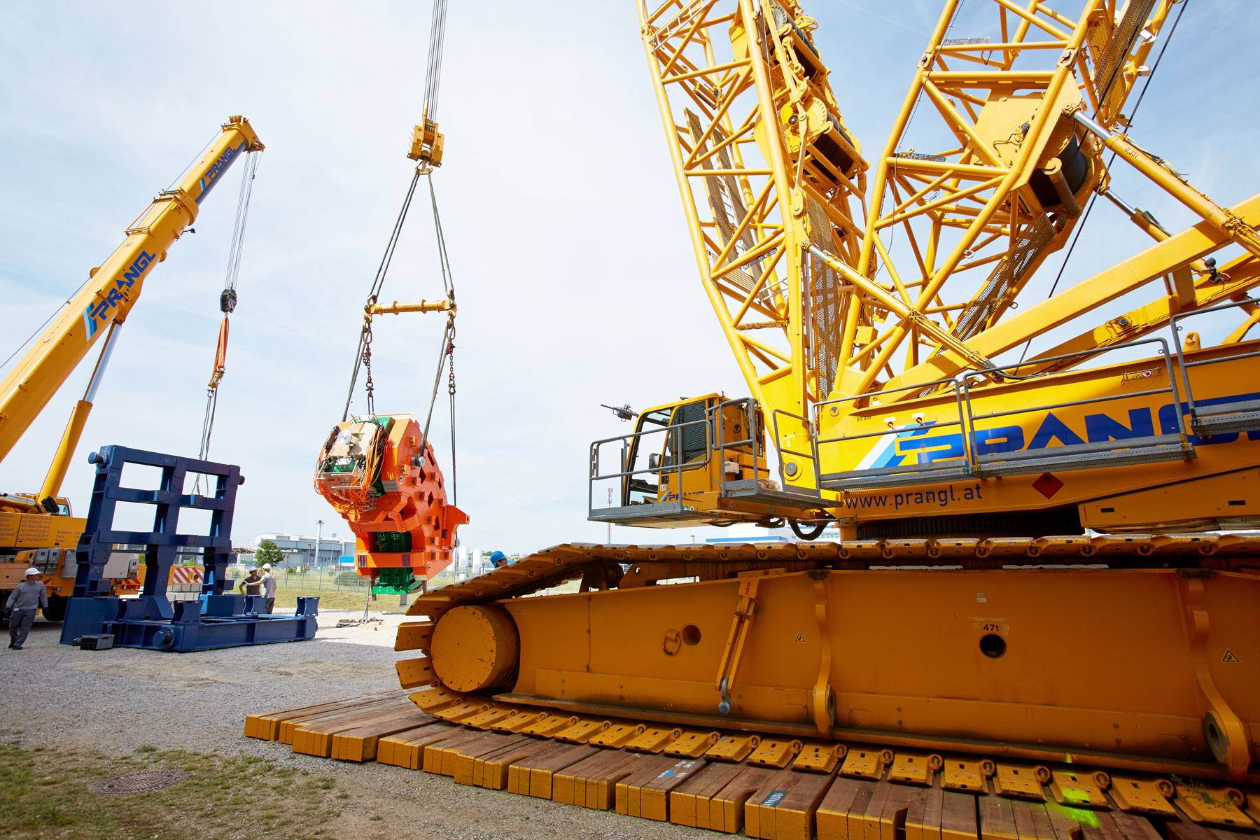 Nach dem endgültigen Zusammenbau wurde der Magnet von beiden Kränen wieder “zurückgedreht“ und schlussendlich mit dem 600 Tonnen Raupenkran durch die im Dach befindliche Einbringungsöffnung eingehoben. Wie bereits beim Ersthub klappte auch diesmal alles reibungslos. Die Vor-Ort-Kenntnisse, die präzise Planung und die gute Umsetzung durch alle Beteiligten machte auch dieses heikle Projekt zu einem vollen Erfolg.