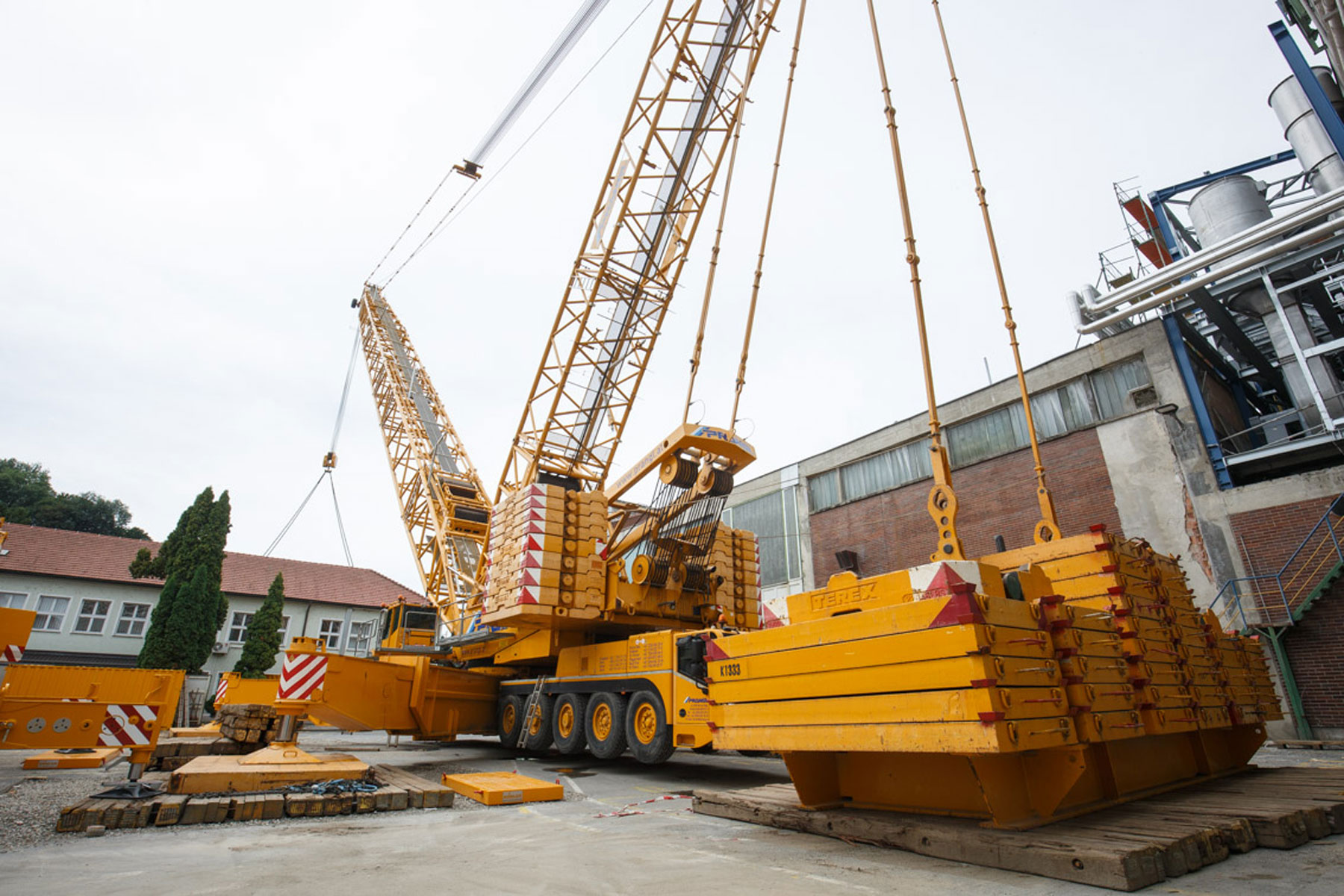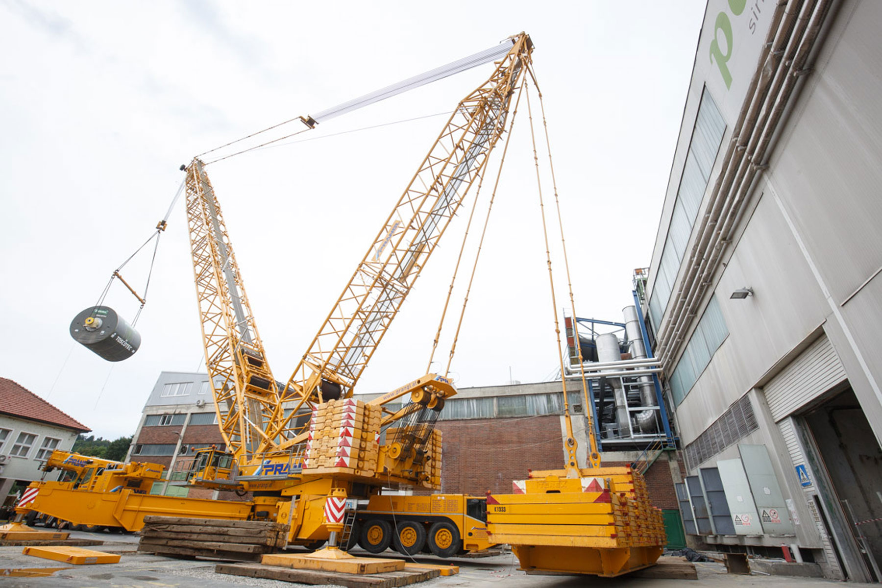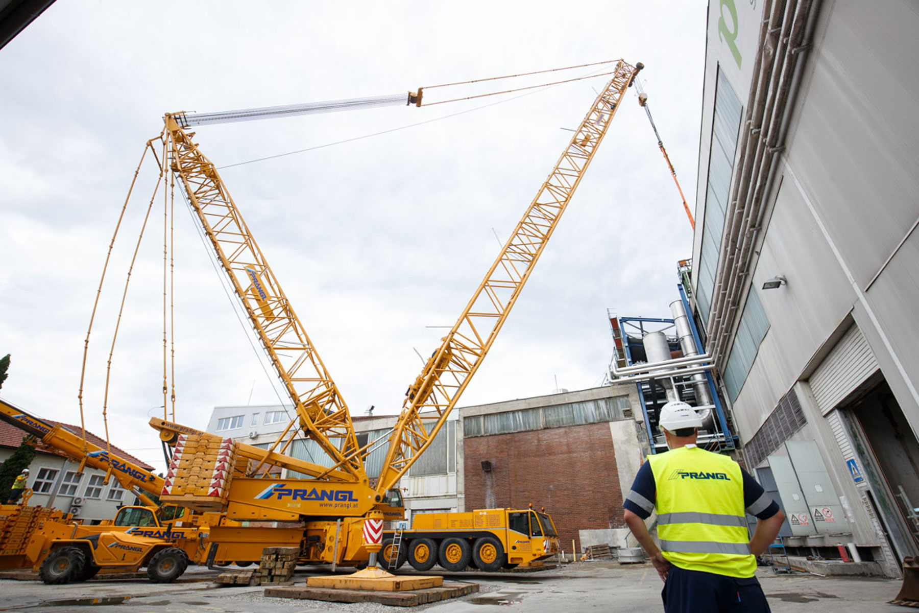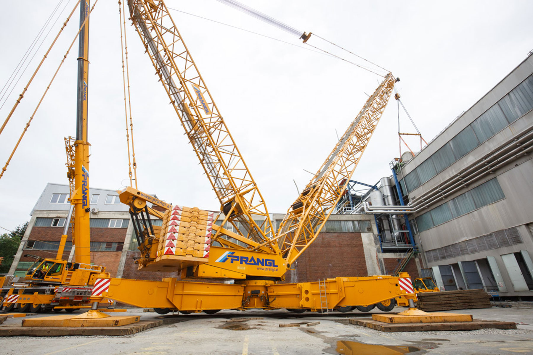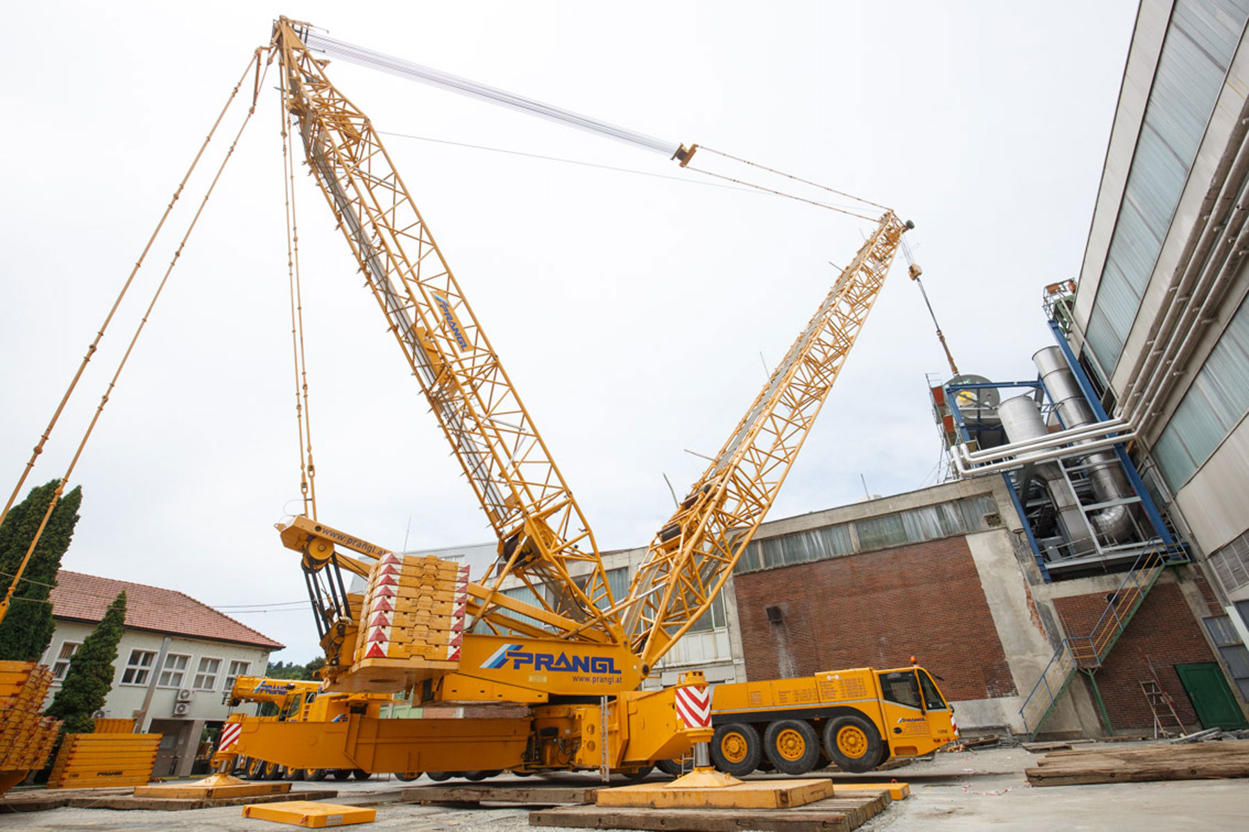 An dem fast 150 Jahre alten Produktionsstandort herrschten besonders beengte Platzverhältnisse, weswegen ein spezielles Engineering erforderlich war: Das Prangl-Team konnte mit einem 600 Tonnen Gittermastkran – er hat die enorme seitliche Reichweite von 43 Meter – die beste technische Lösung bieten. Mit einem Gesamtgewicht von 1.044 Tonnen wurde der Kran in mitten des engen Innenhofs platziert. Zum Aufbau des gelben Giganten war zusätzlich ein neuer 110 Tonnen Teleskopkran notwendig. Dank der guten Zusammenarbeit des slowenischen und des österreichischen Prangl-Teams erfolgte der Aufbau problemlos.