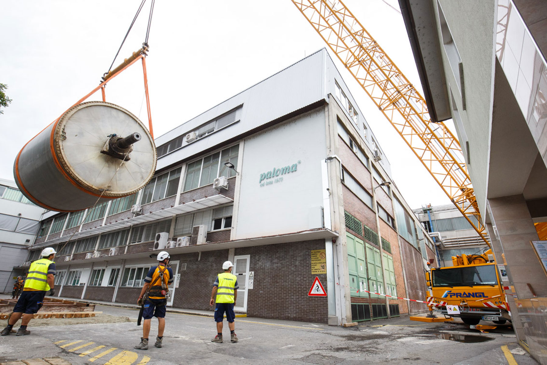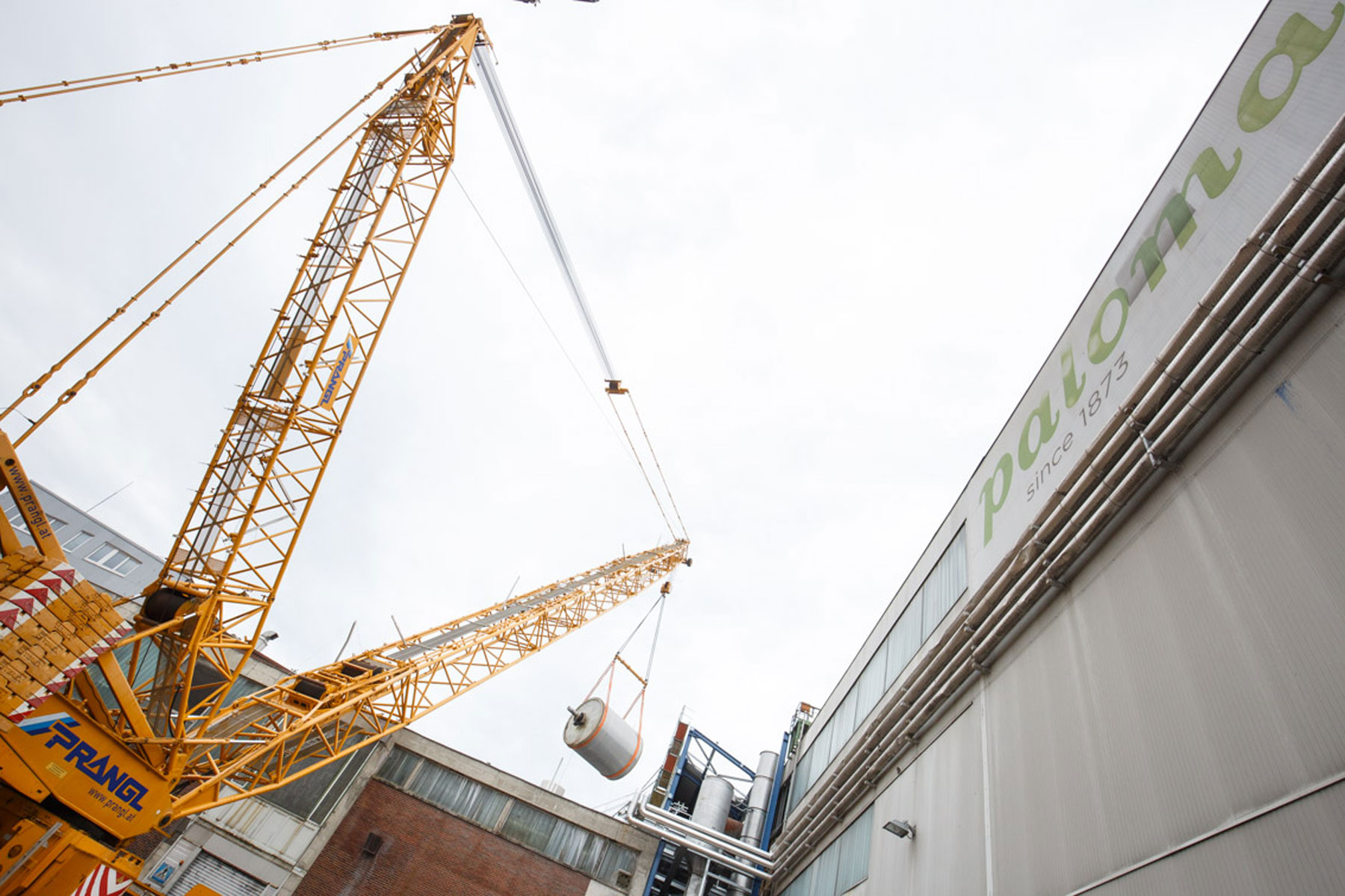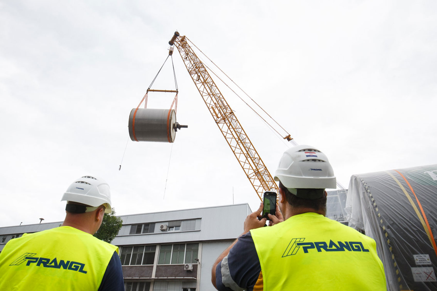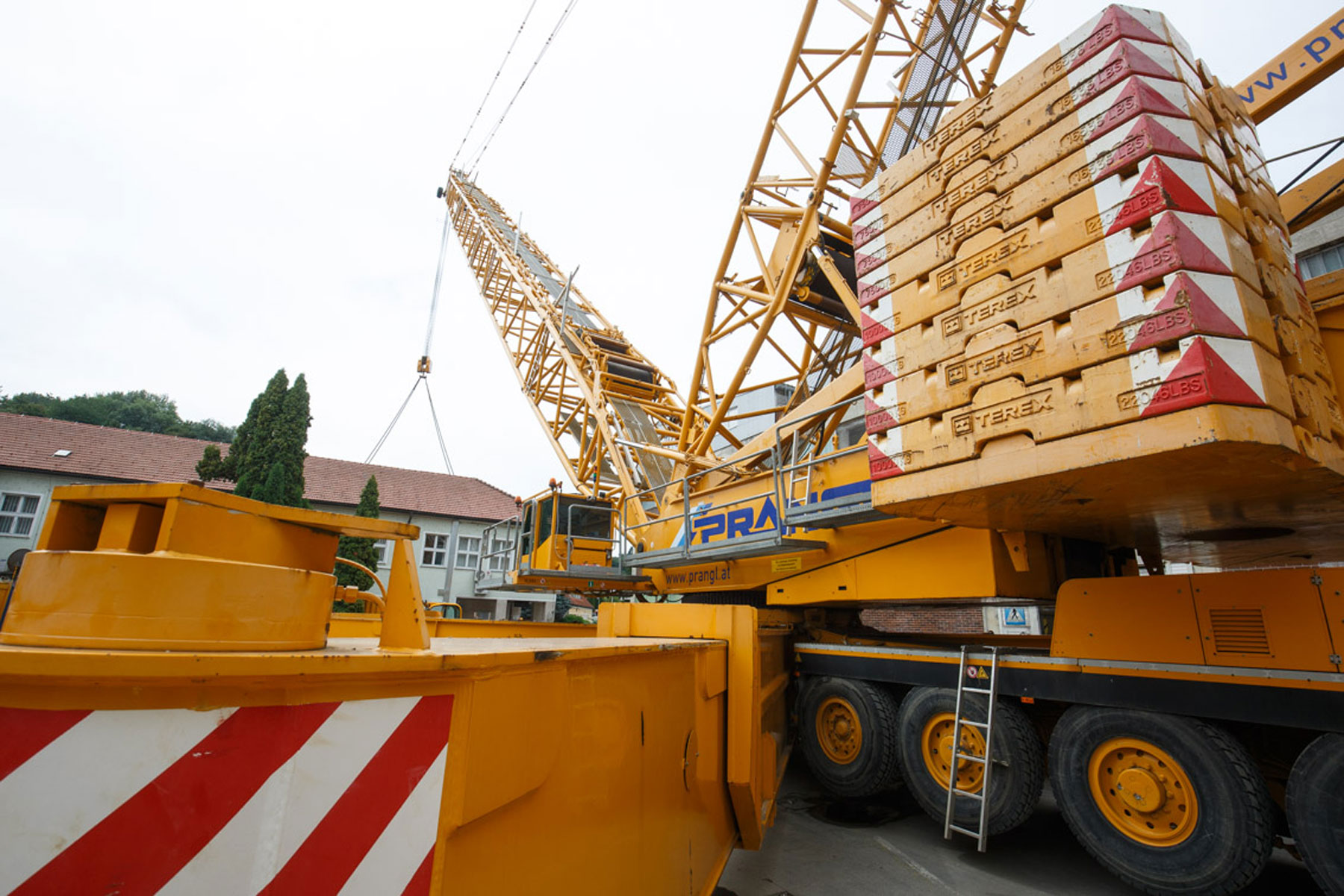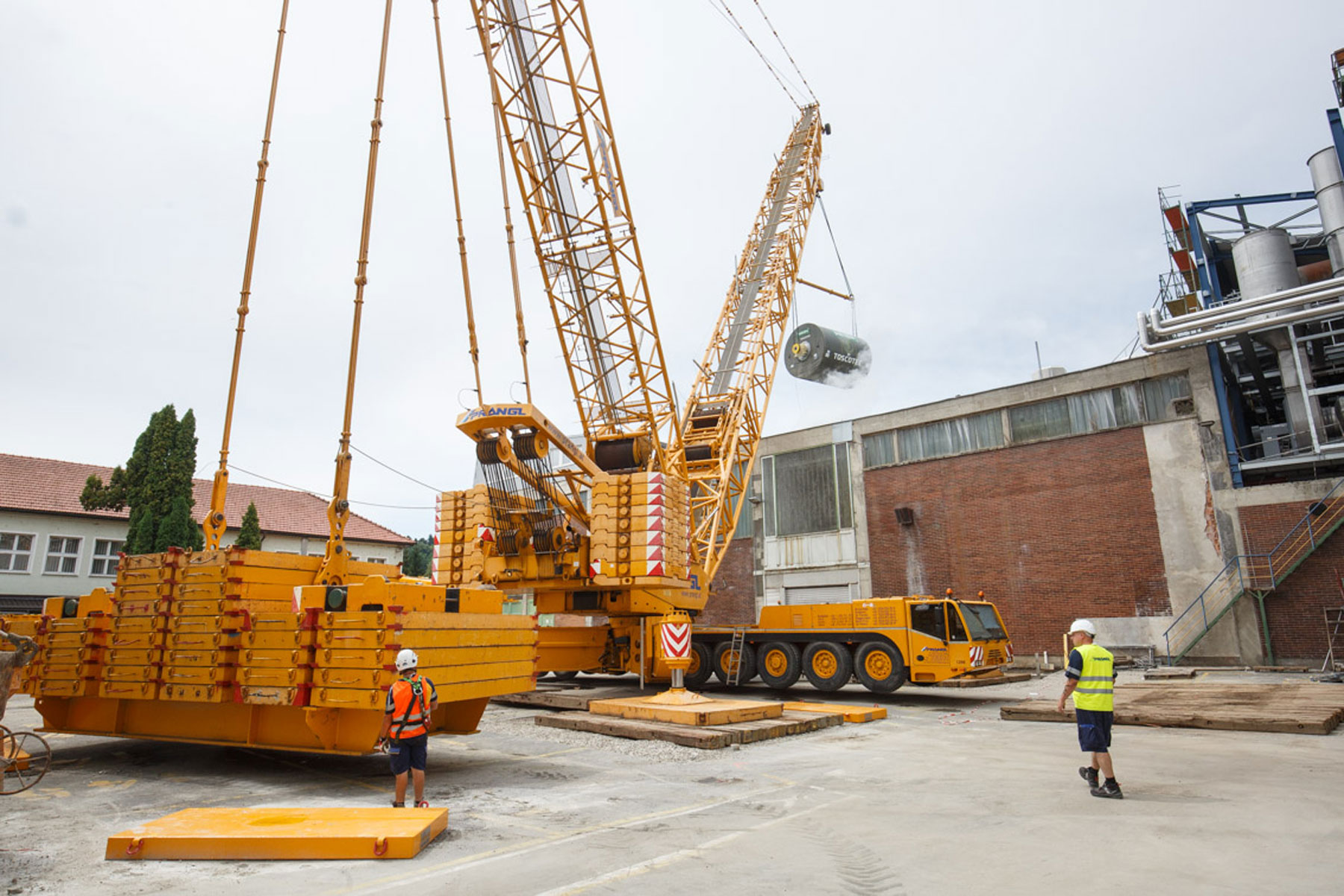 An dem fast 150 Jahre alten Produktionsstandort herrschten besonders beengte Platzverhältnisse, weswegen ein spezielles Engineering erforderlich war: Das Prangl-Team konnte mit einem 600 Tonnen Gittermastkran – er hat die enorme seitliche Reichweite von 43 Meter – die beste technische Lösung bieten. Mit einem Gesamtgewicht von 1.044 Tonnen wurde der Kran in mitten des engen Innenhofs platziert. Zum Aufbau des gelben Giganten war zusätzlich ein neuer 110 Tonnen Teleskopkran notwendig. Dank der guten Zusammenarbeit des slowenischen und des österreichischen Prangl-Teams erfolgte der Aufbau problemlos.
