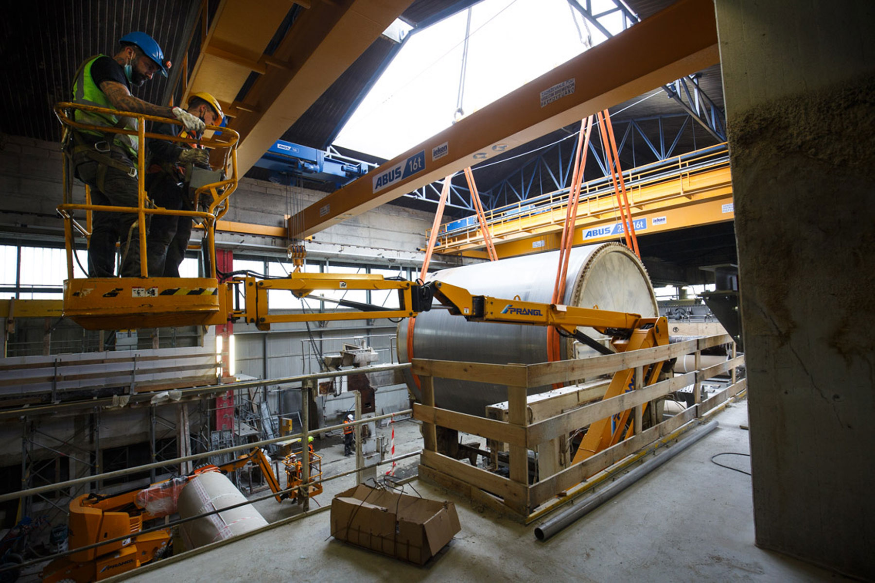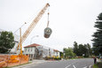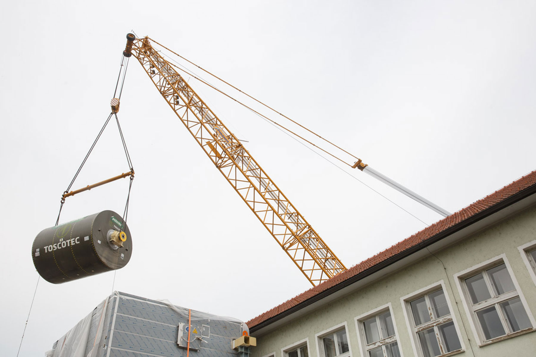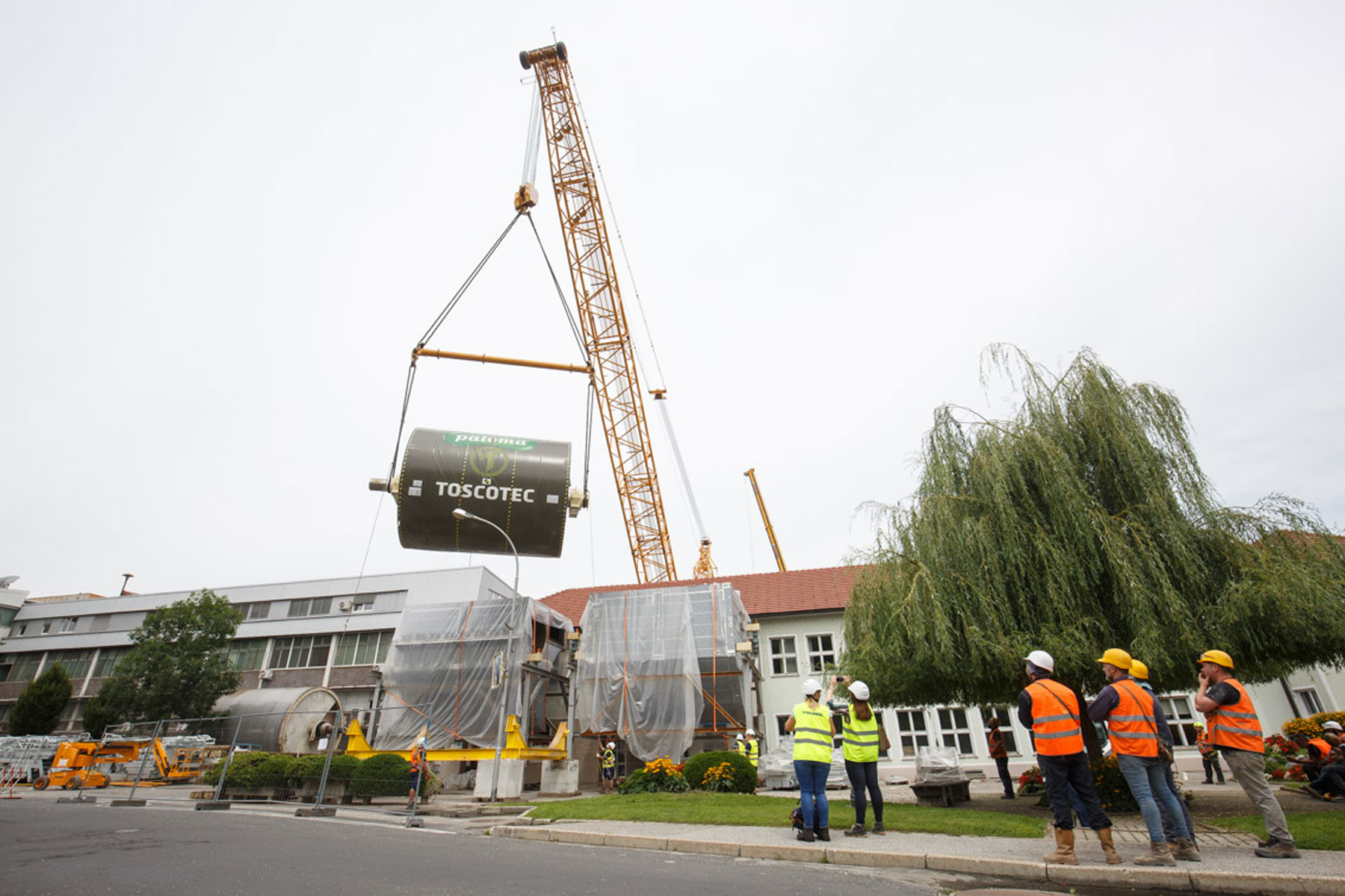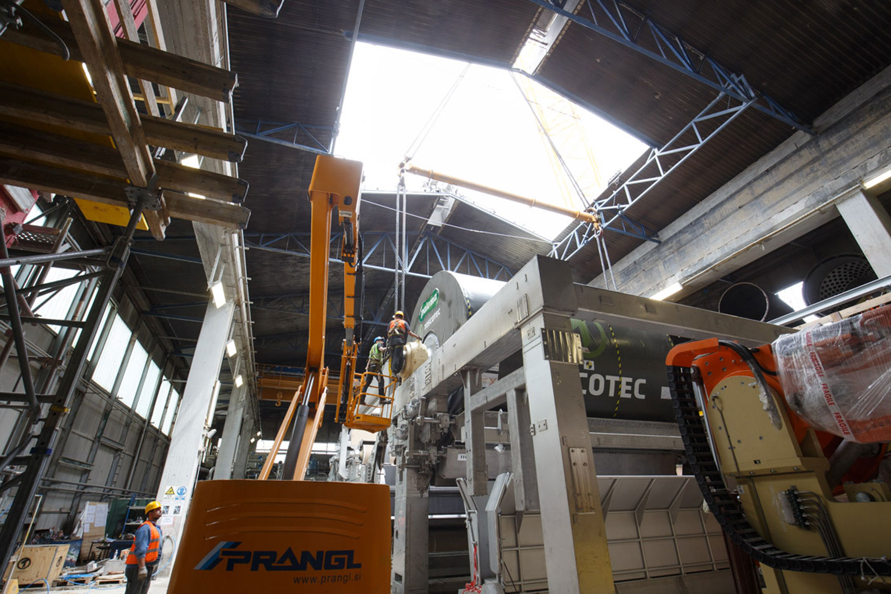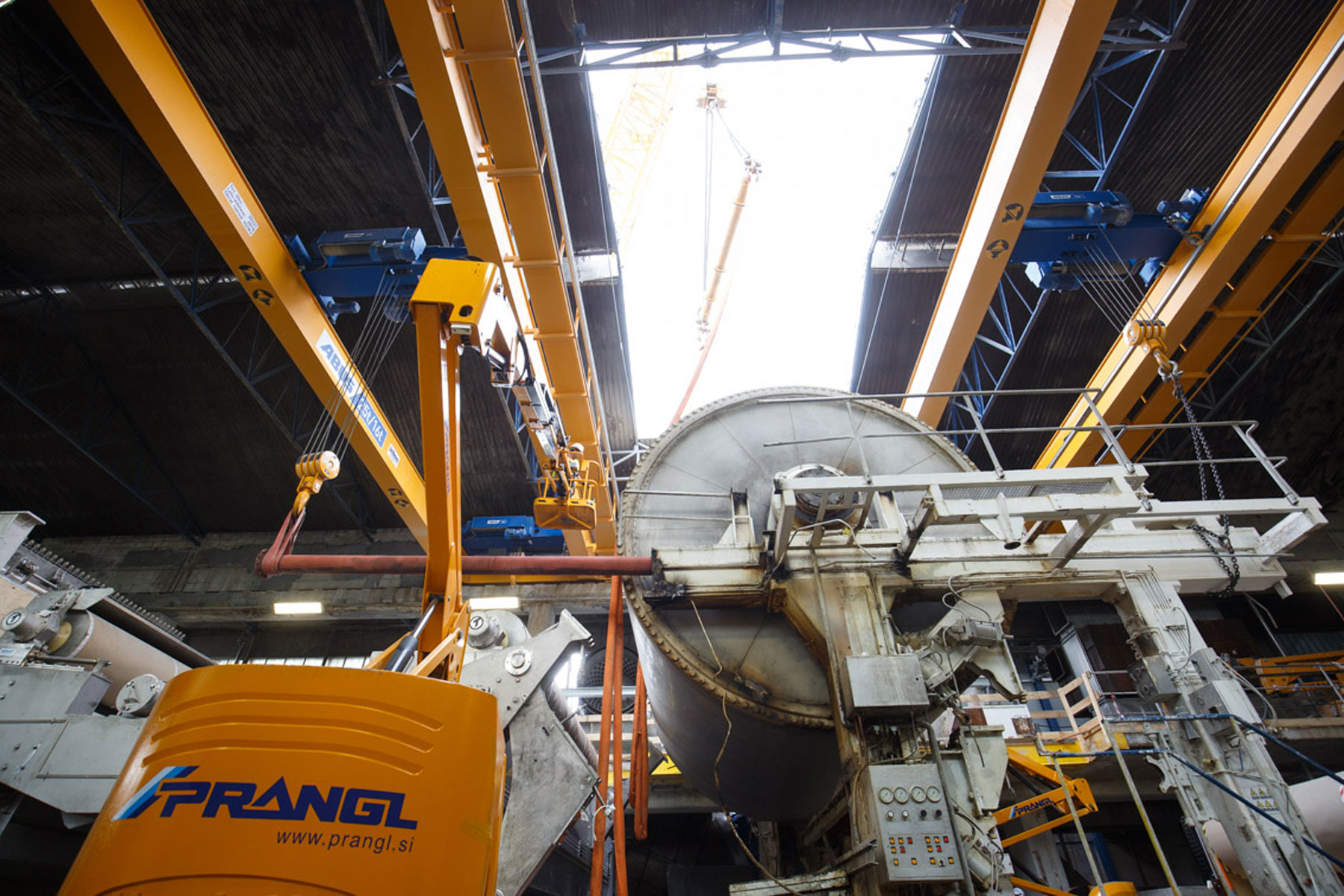 An dem fast 150 Jahre alten Produktionsstandort herrschten besonders beengte Platzverhältnisse, weswegen ein spezielles Engineering erforderlich war: Das Prangl-Team konnte mit einem 600 Tonnen Gittermastkran – er hat die enorme seitliche Reichweite von 43 Meter – die beste technische Lösung bieten. Mit einem Gesamtgewicht von 1.044 Tonnen wurde der Kran in mitten des engen Innenhofs platziert. Zum Aufbau des gelben Giganten war zusätzlich ein neuer 110 Tonnen Teleskopkran notwendig. Dank der guten Zusammenarbeit des slowenischen und des österreichischen Prangl-Teams erfolgte der Aufbau problemlos.