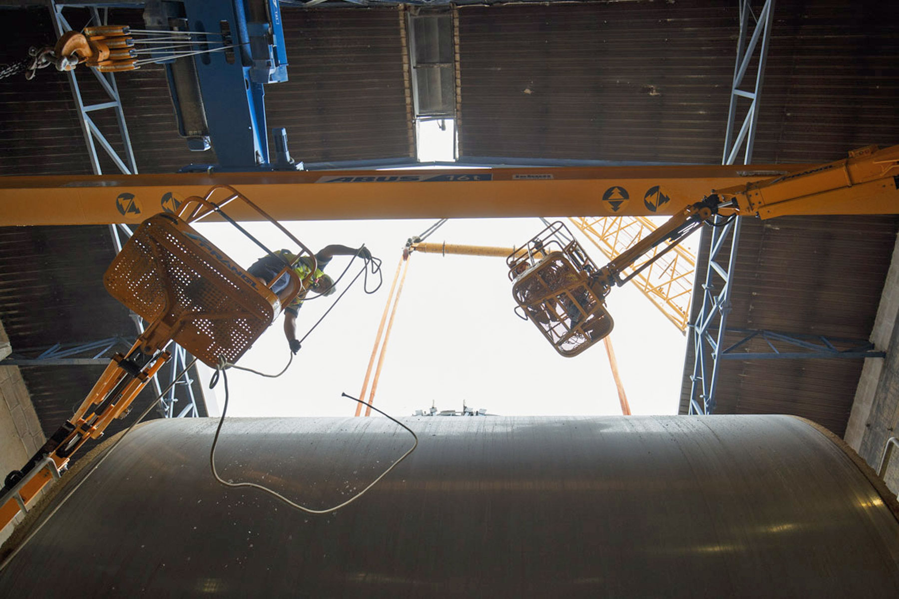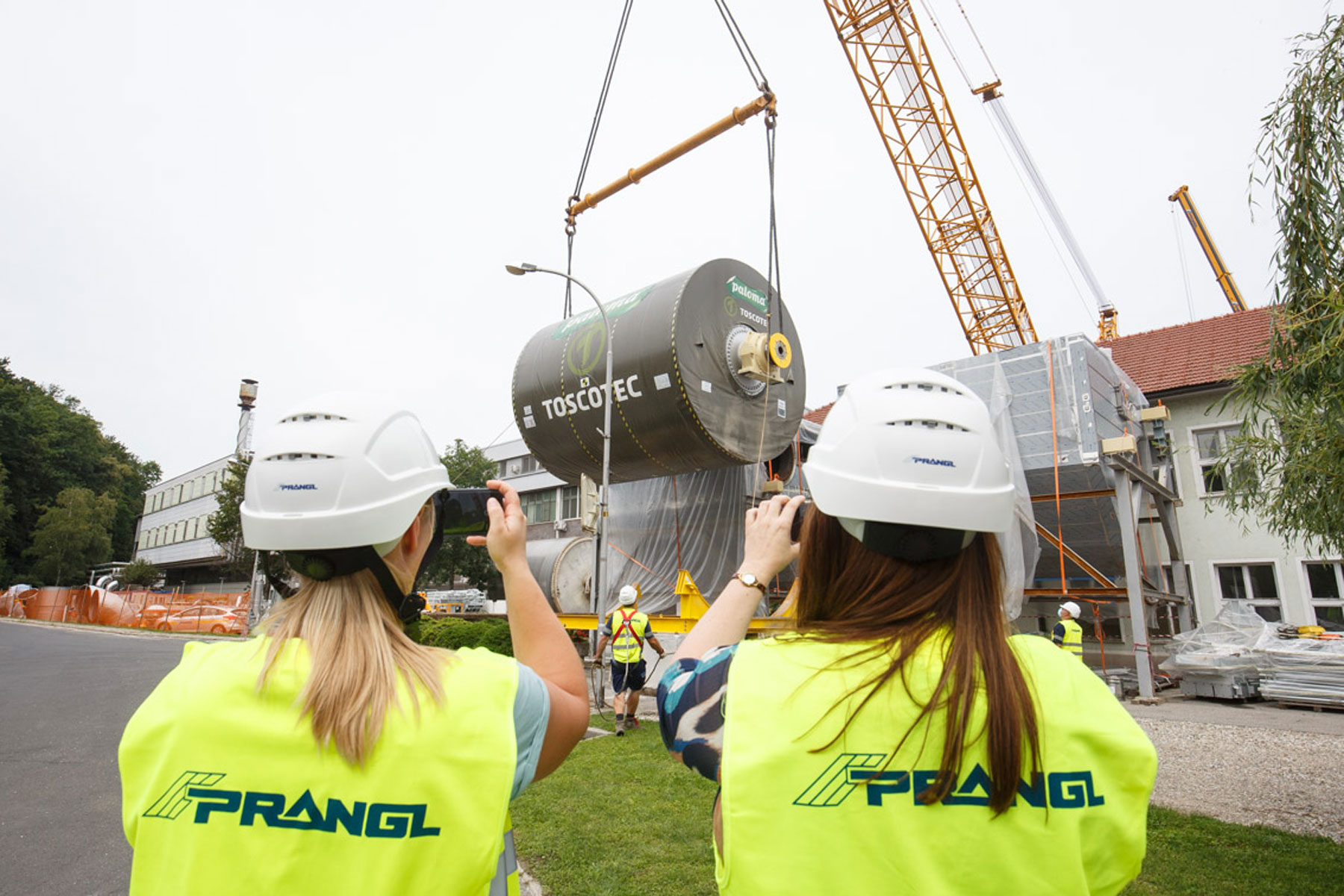 Prangl ist international als Komplettanbieter bekannt. So orderte der Auftraggeber auch das gesamte Zusatzequipment für die Montage vom gelben Spezialisten. Neben den beiden Mobilkranen waren noch fünf Hubstapler, ein Teleskopstapler, fünf Gelenk-Arbeitsbühnen und fünf Scheren-Arbeitsbühne vor Ort. Mit dieser umfangreichen Betreuung konnte sichergestellt werden, dass alle nötigen Voraussetzungen für ein erfolgreiches Aus- und Einheben gegeben waren.