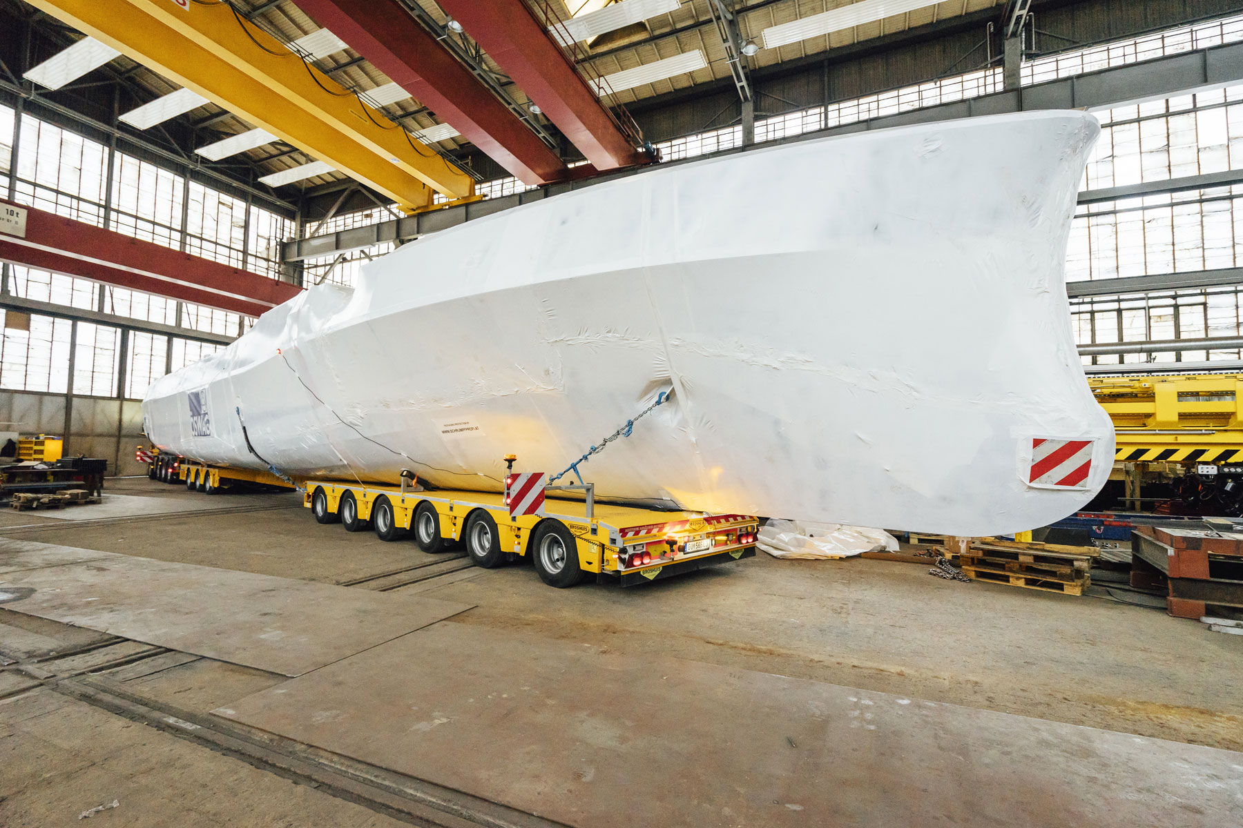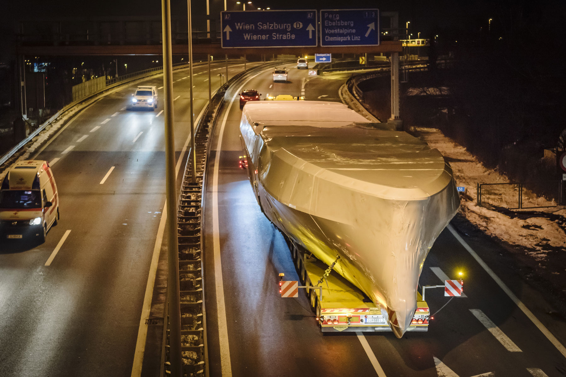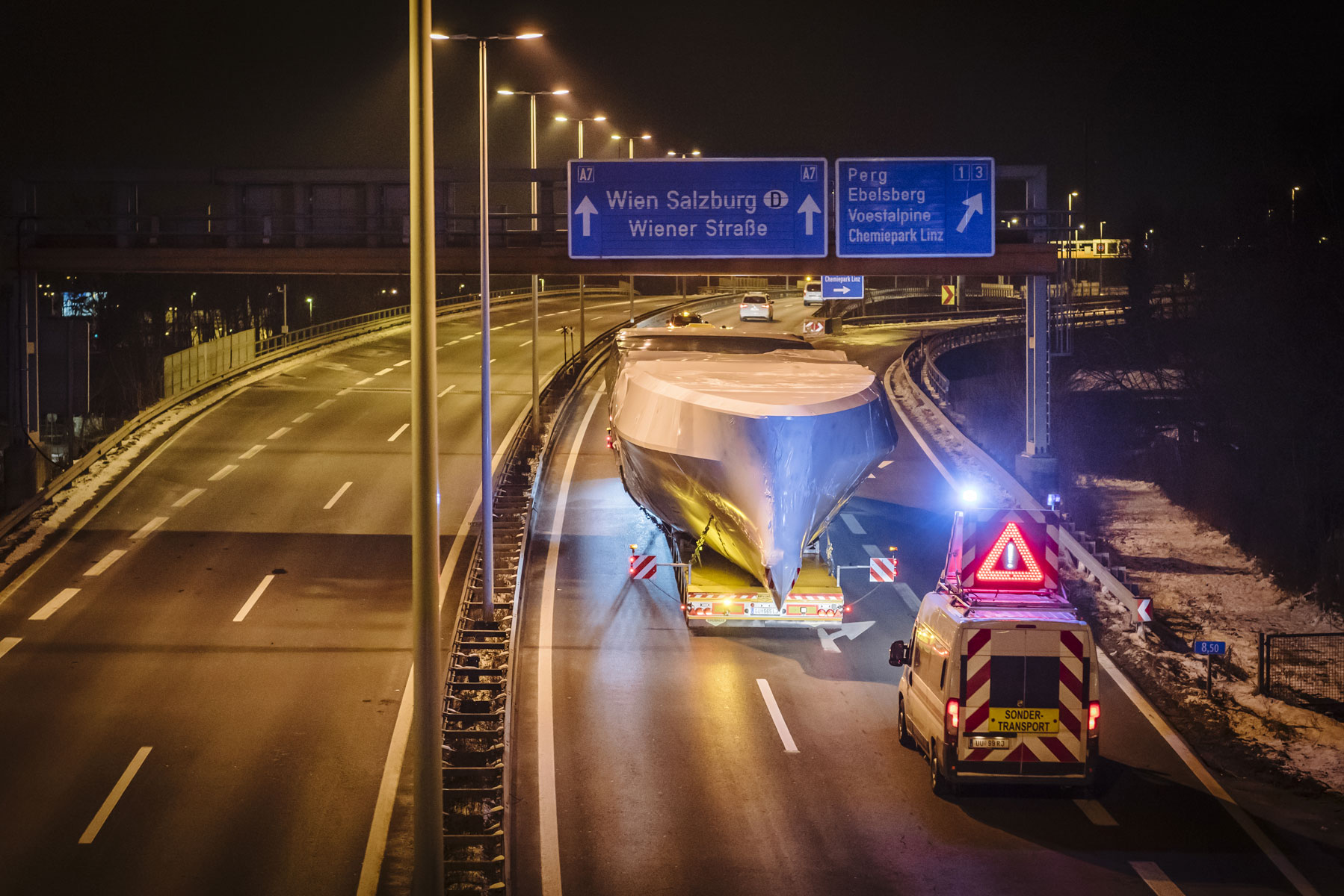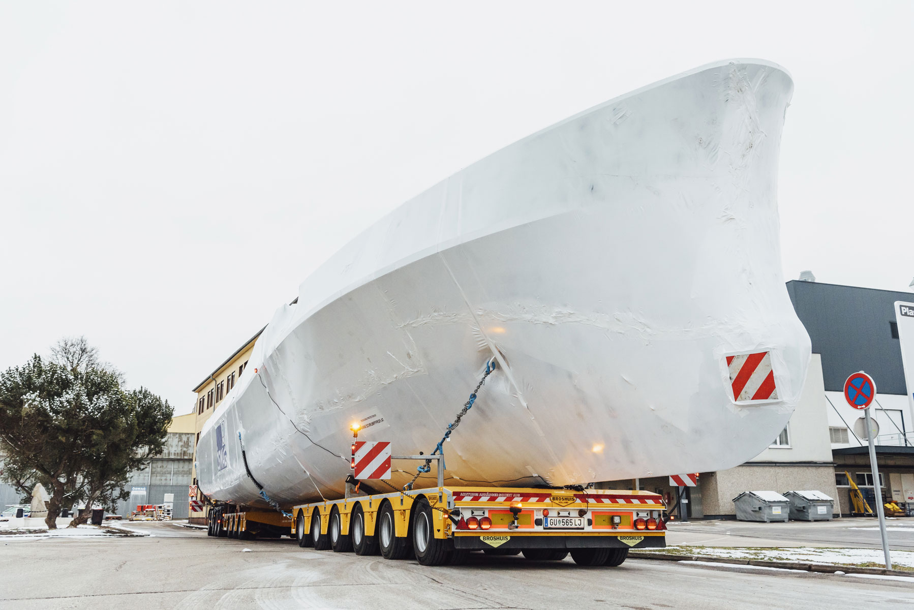 Der 30 Meter lange Rumpf des Ausflugschiffs wurde in der Fertigungshalle auf die Schwertransportgarnitur verhoben. Aufgrund der massiven Proportionen ergaben sich Transportabmessungen von 38 Meter Länge, 5,3 Meter Breite und ein Gesamtgewicht von 104 Tonnen. Das “nur“ 25 Meter lange Oberdeck brachte samt Transport-Equipment auch noch 40 Tonnen auf die Waage. Zu guter Letzt mussten auch noch Steuerhaus, Antrieb und allfälliges Zubehör angeliefert werden. In Summe wurden drei Transporte benötigt, um alle Teile an den Bestimmungsort zu bringen.