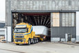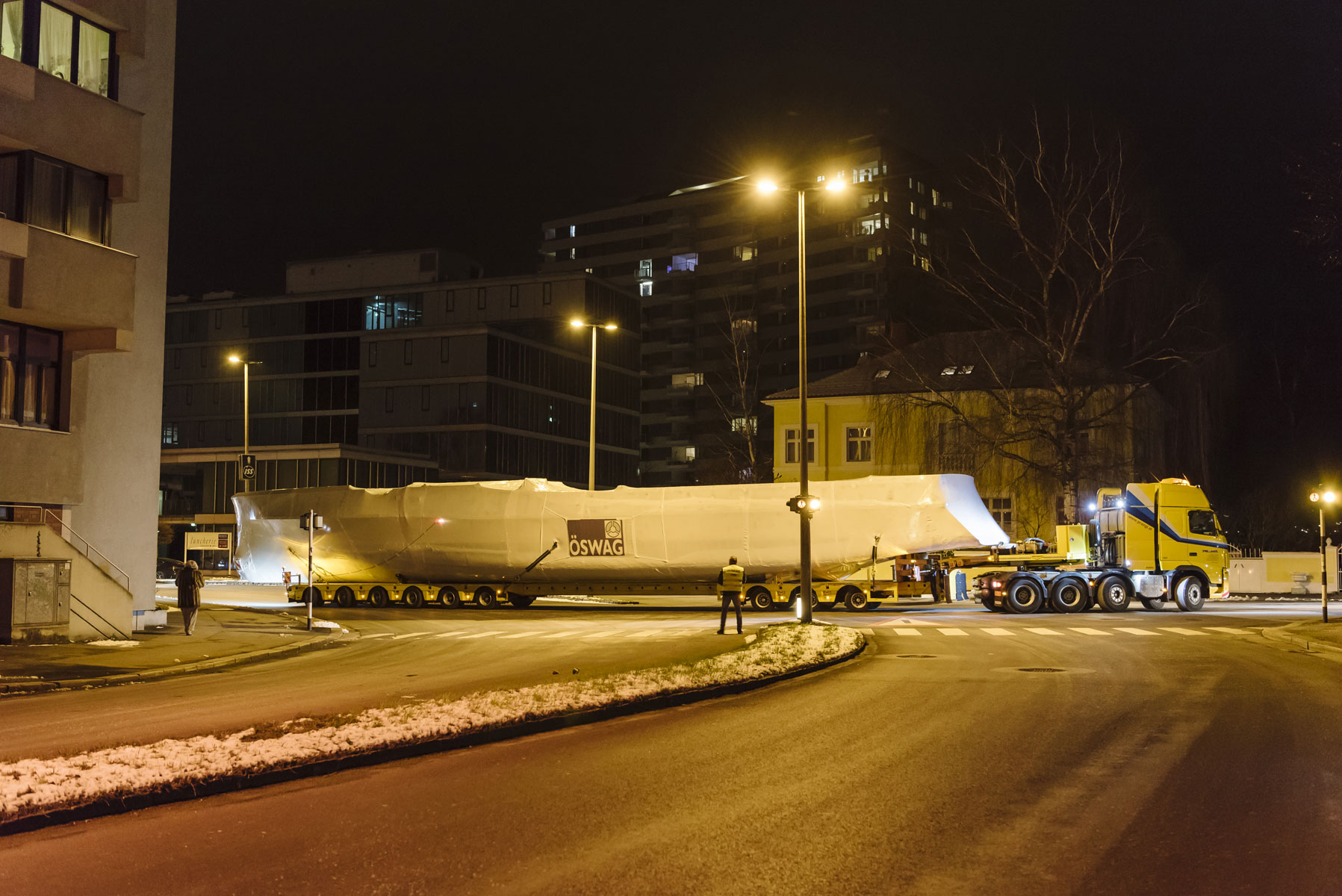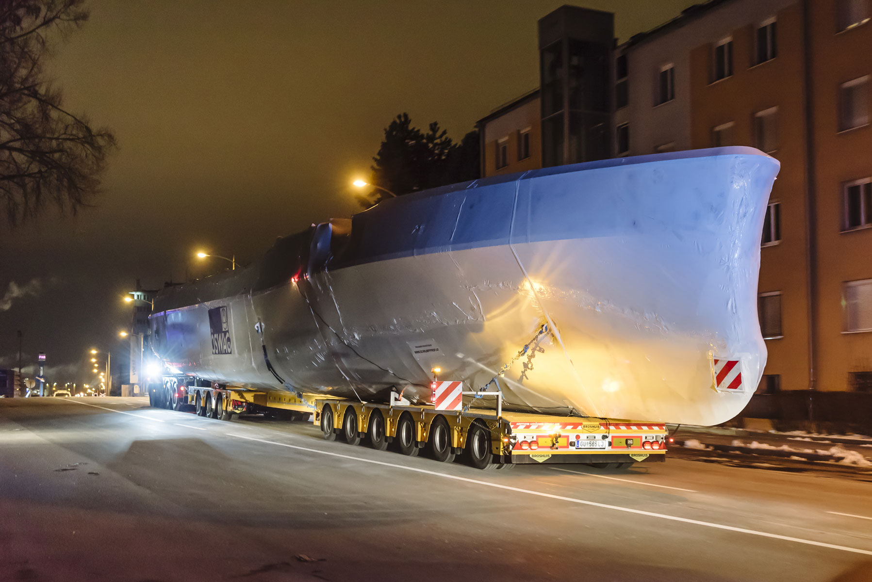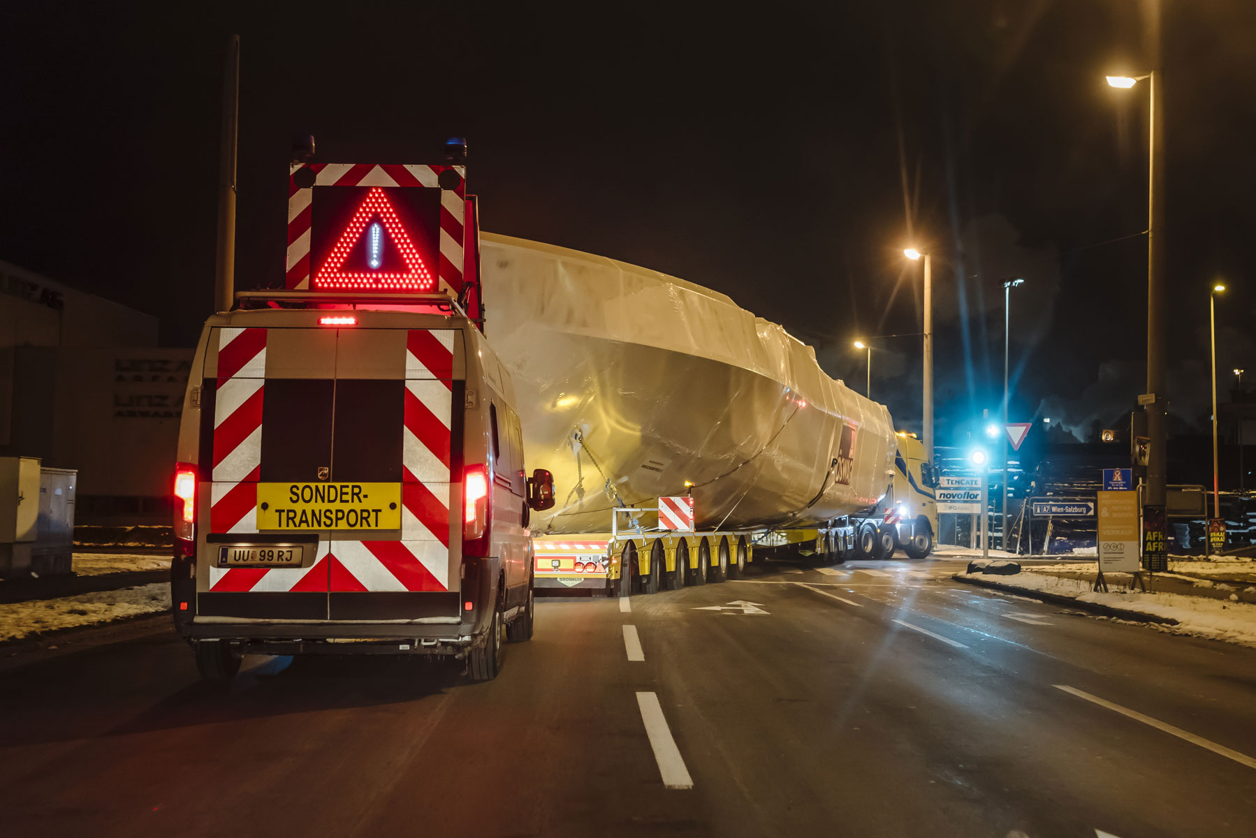 Der 30 Meter lange Rumpf des Ausflugschiffs wurde in der Fertigungshalle auf die Schwertransportgarnitur verhoben. Aufgrund der massiven Proportionen ergaben sich Transportabmessungen von 38 Meter Länge, 5,3 Meter Breite und ein Gesamtgewicht von 104 Tonnen. Das “nur“ 25 Meter lange Oberdeck brachte samt Transport-Equipment auch noch 40 Tonnen auf die Waage. Zu guter Letzt mussten auch noch Steuerhaus, Antrieb und allfälliges Zubehör angeliefert werden. In Summe wurden drei Transporte benötigt, um alle Teile an den Bestimmungsort zu bringen.