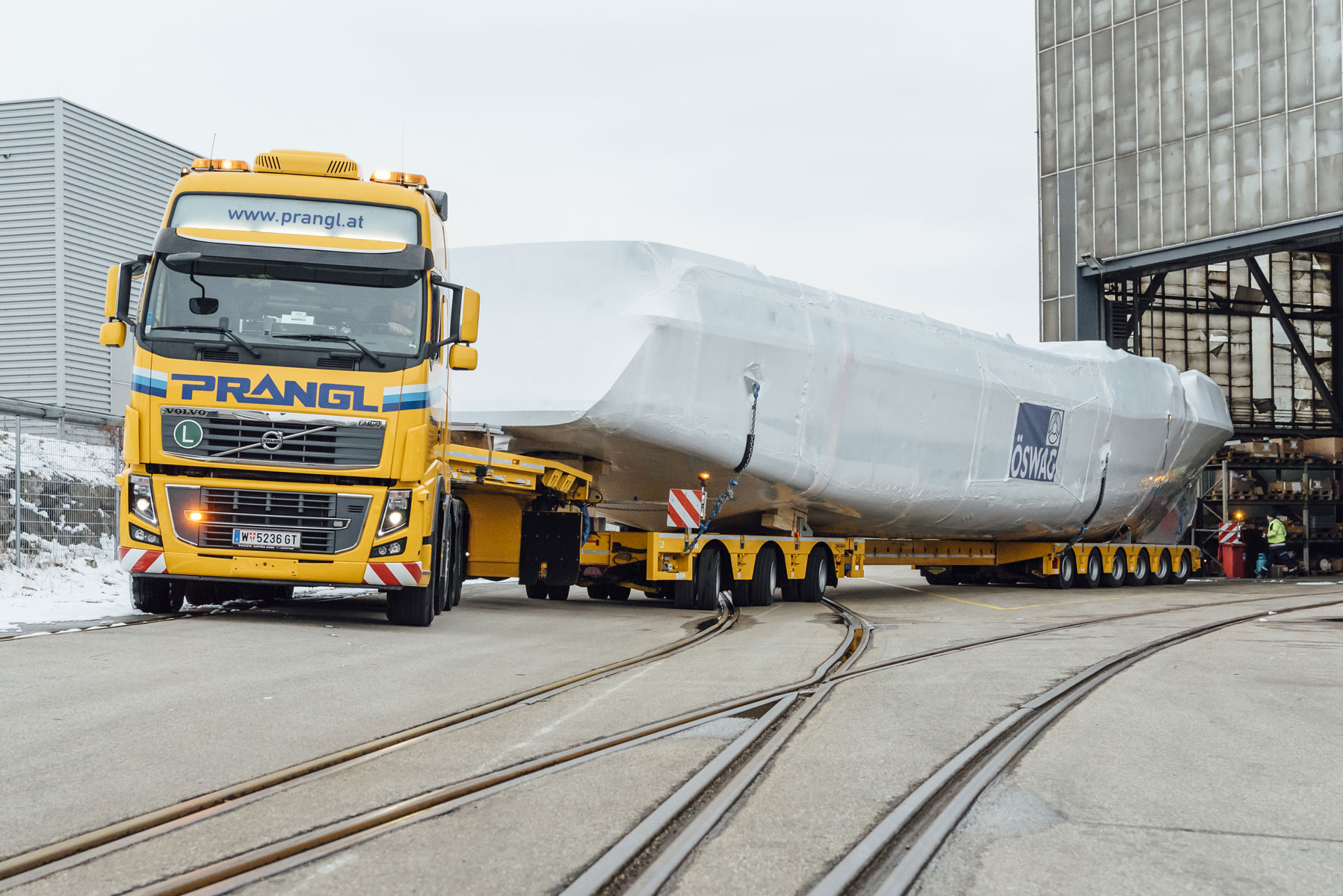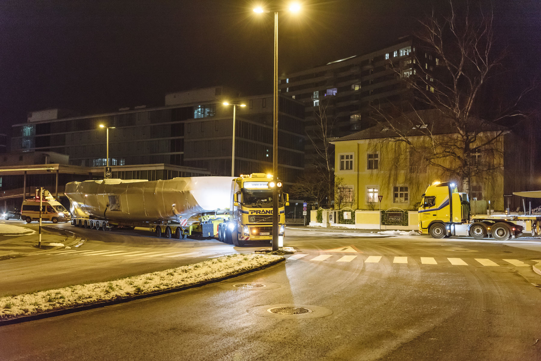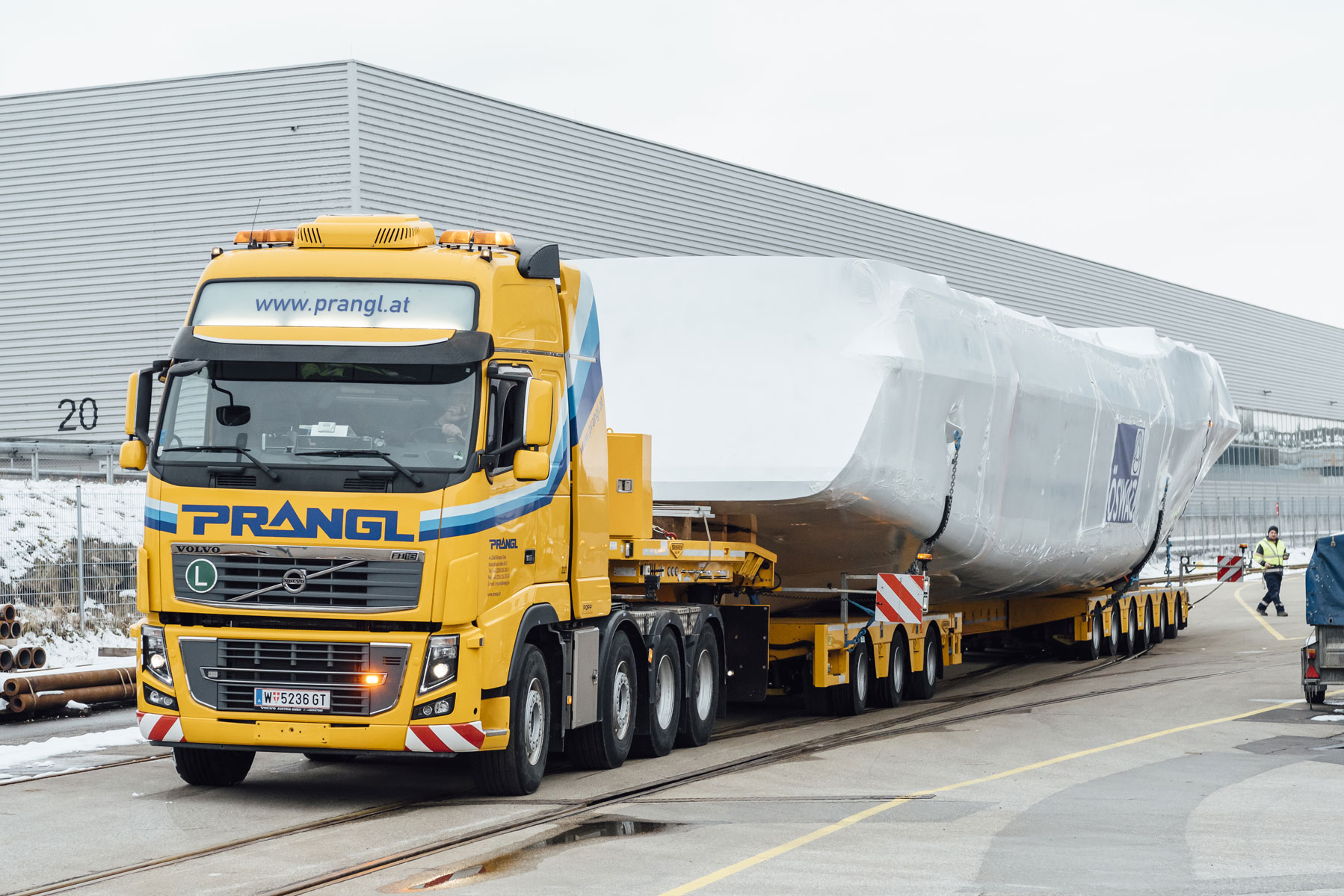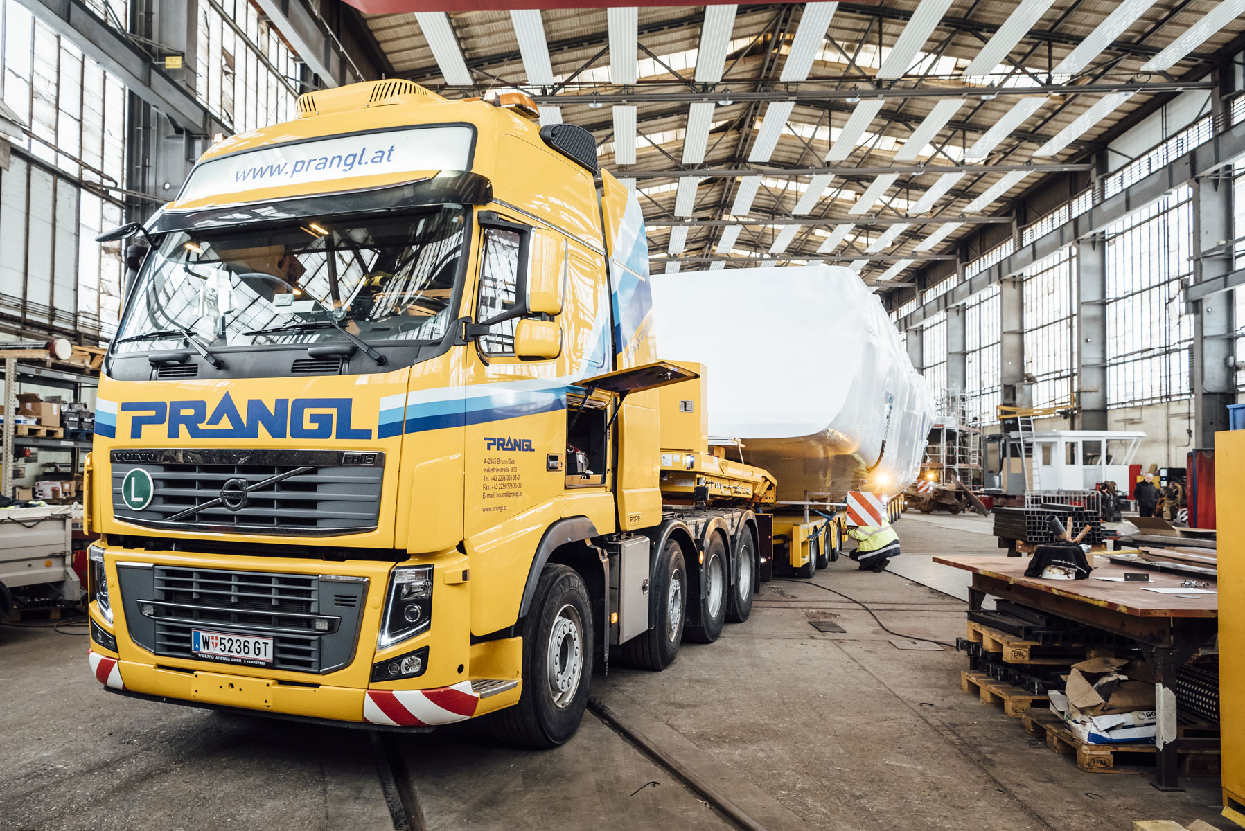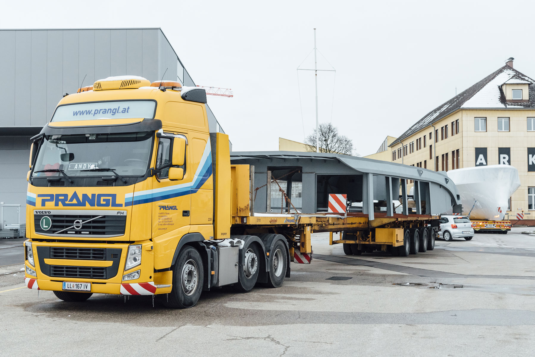 Das größte Element, der Schiffsrumpf wurde mit einer 4-Achs-Zugmaschine und einem 9-Achs-Tiefbettsattel transportiert. Das Oberdeck und das Steuerhaus samt Antrieb und Zubehör wurden mit 3-Achs Zugmaschinen und 4-Achs-Plateusattel gefahren. Nicht die ganze Strecke konnte im Konvoi absolviert werden. Aufgrund der großen Abmessungen wurde eine Konvoifahrt nicht überall genehmigt. Teilweise mussten die drei Transportfahrzeuge sogar unterschiedliche Routen nehmen. Trotzdem behielten die Experten von Prangl den Überblick. Dank der gründlichen Vorplanung konnte das gesamte Projekt zeitgerecht und zur vollsten Zufriedenheit aller Beteiligten abgewickelt werden.