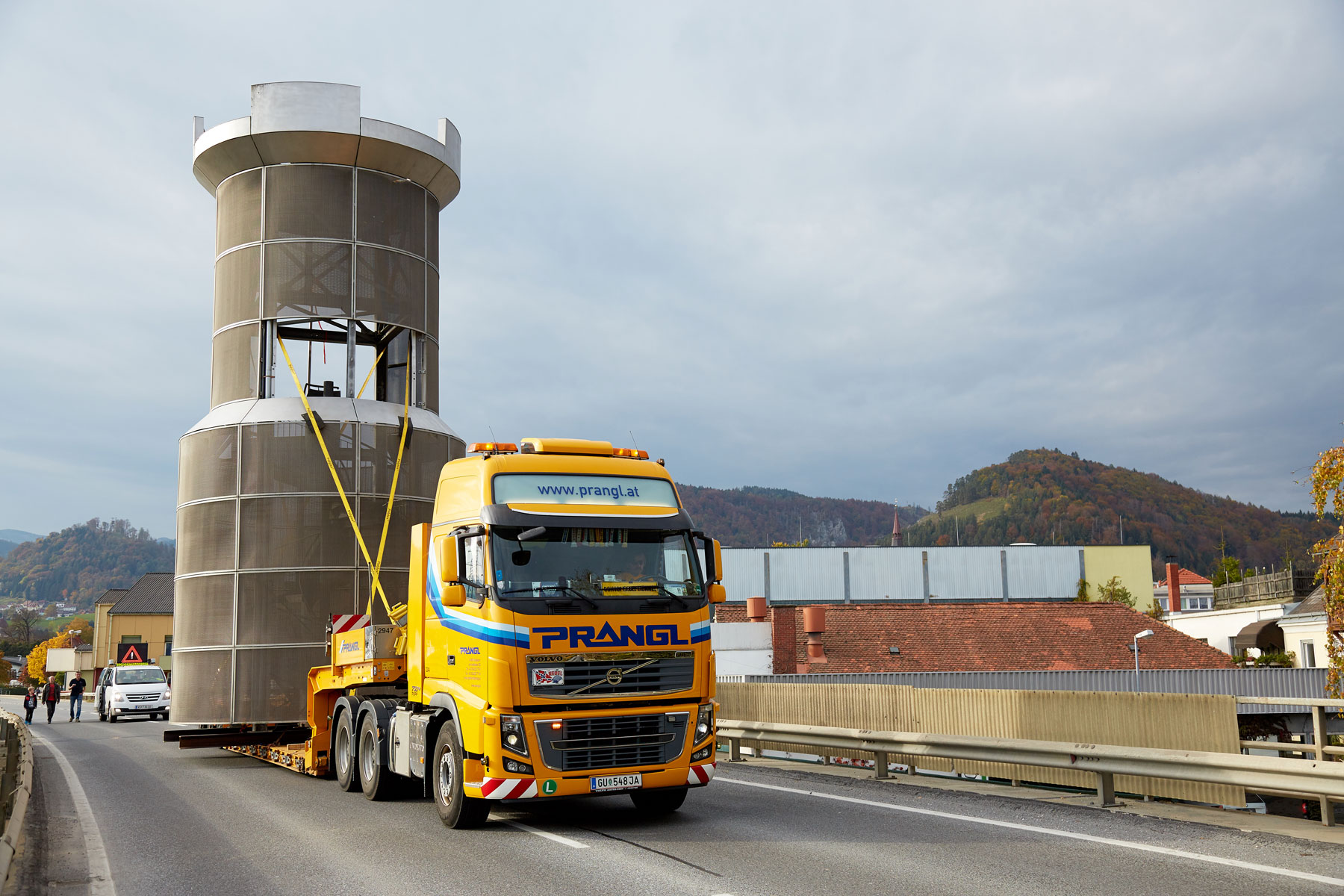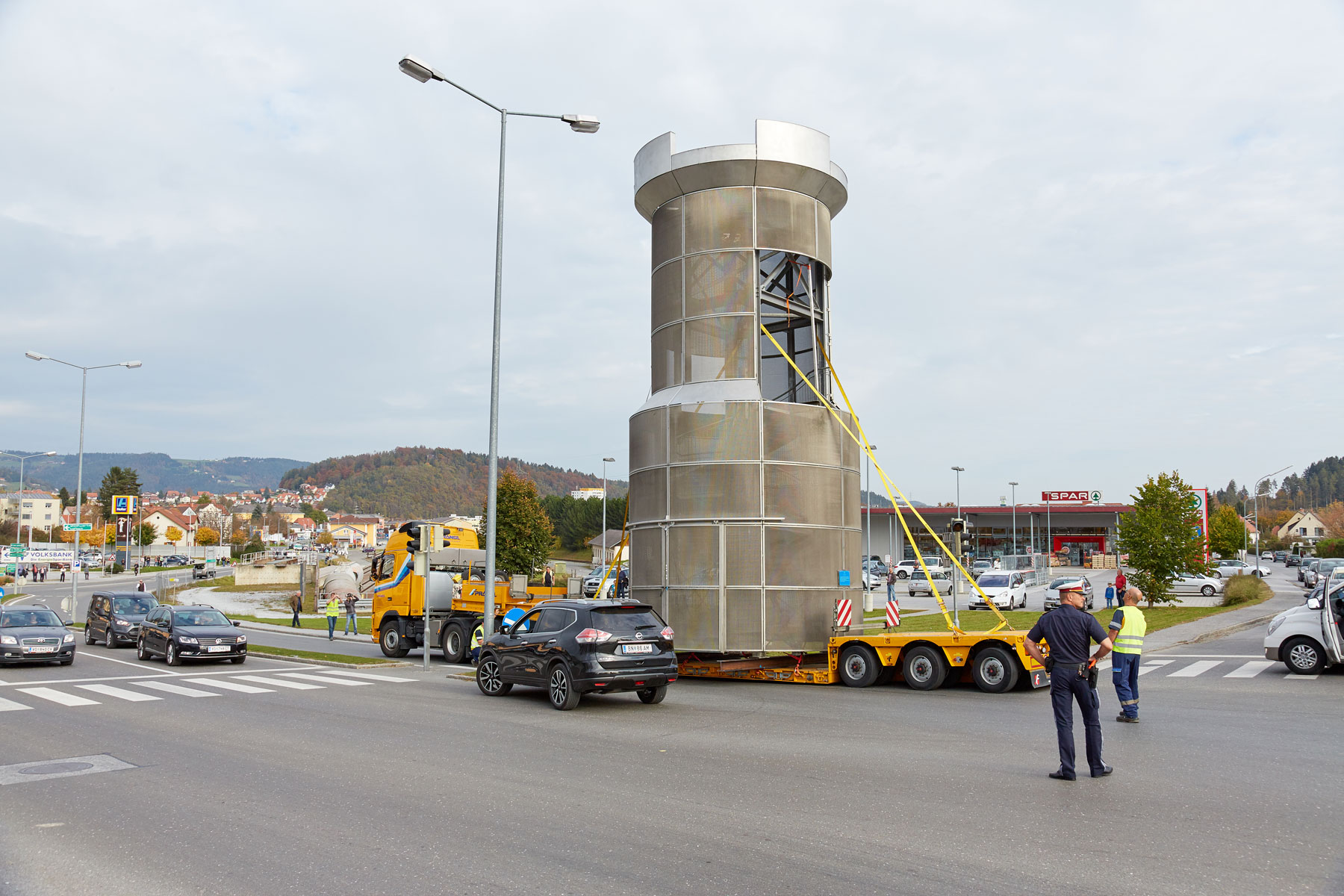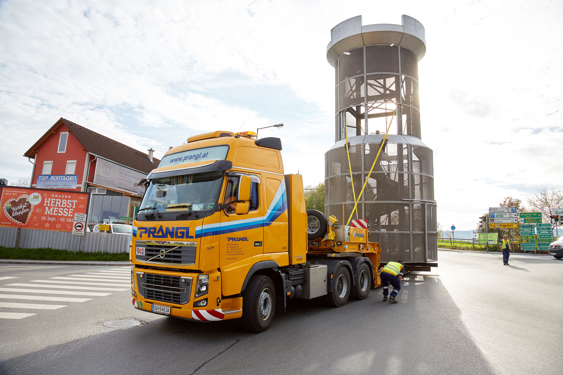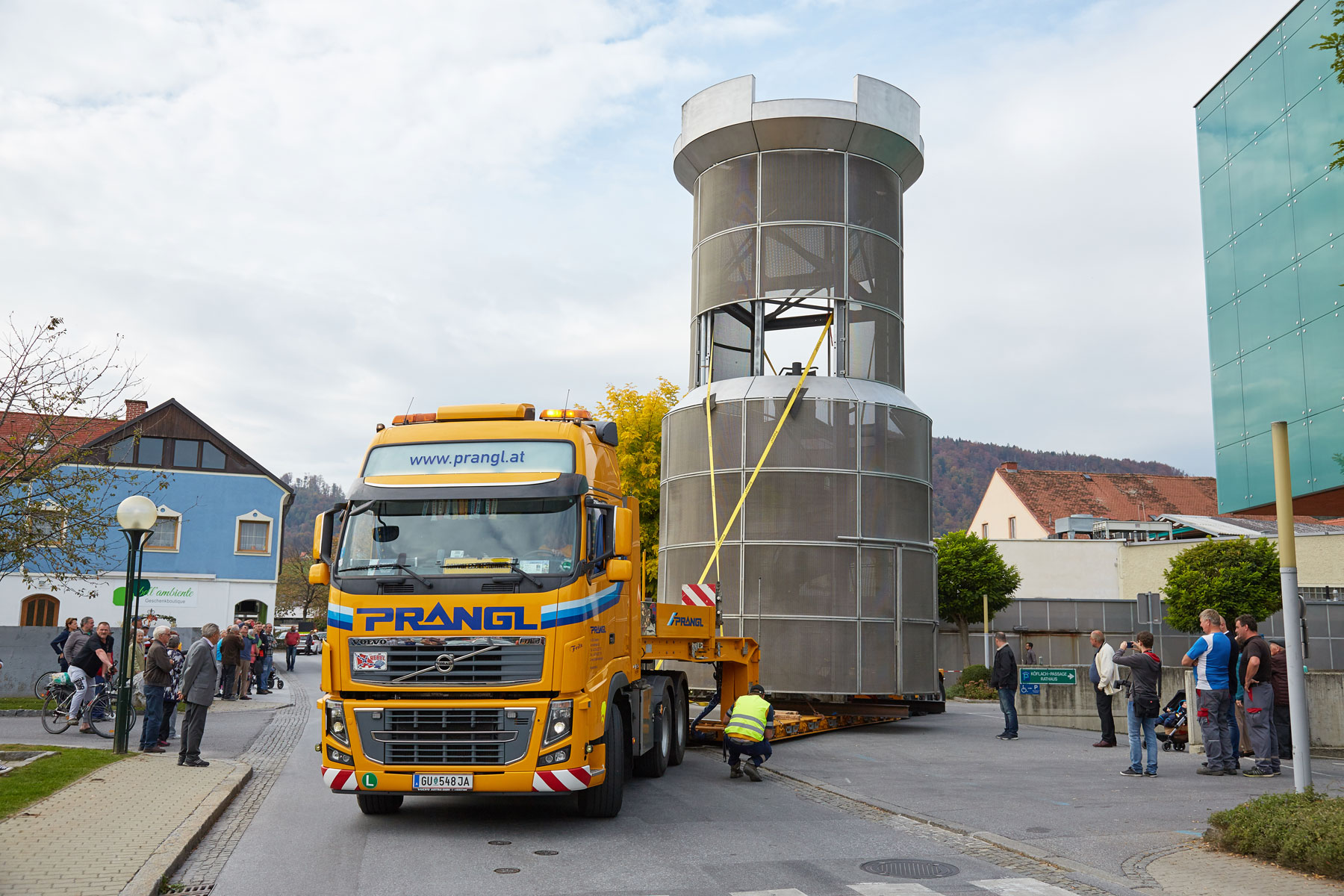Die steirische Stadtgemeinde Köflach hat ein neues Wahrzeichen bekommen. Der Stadtturm, der bis dahin seinen Platz neben dem Rathaus hatte, wurde in das Zentrum eines Kreisverkehrs der B70 an der Stadteinfahrt verlegt. Für den Sondertransport als auch die Hebearbeiten wurde Prangl exklusiv beauftragt.