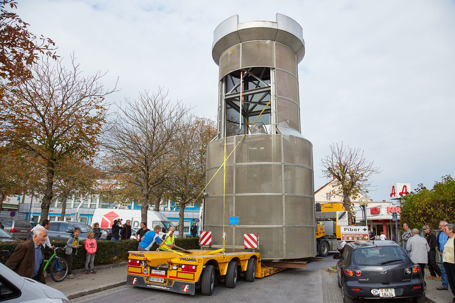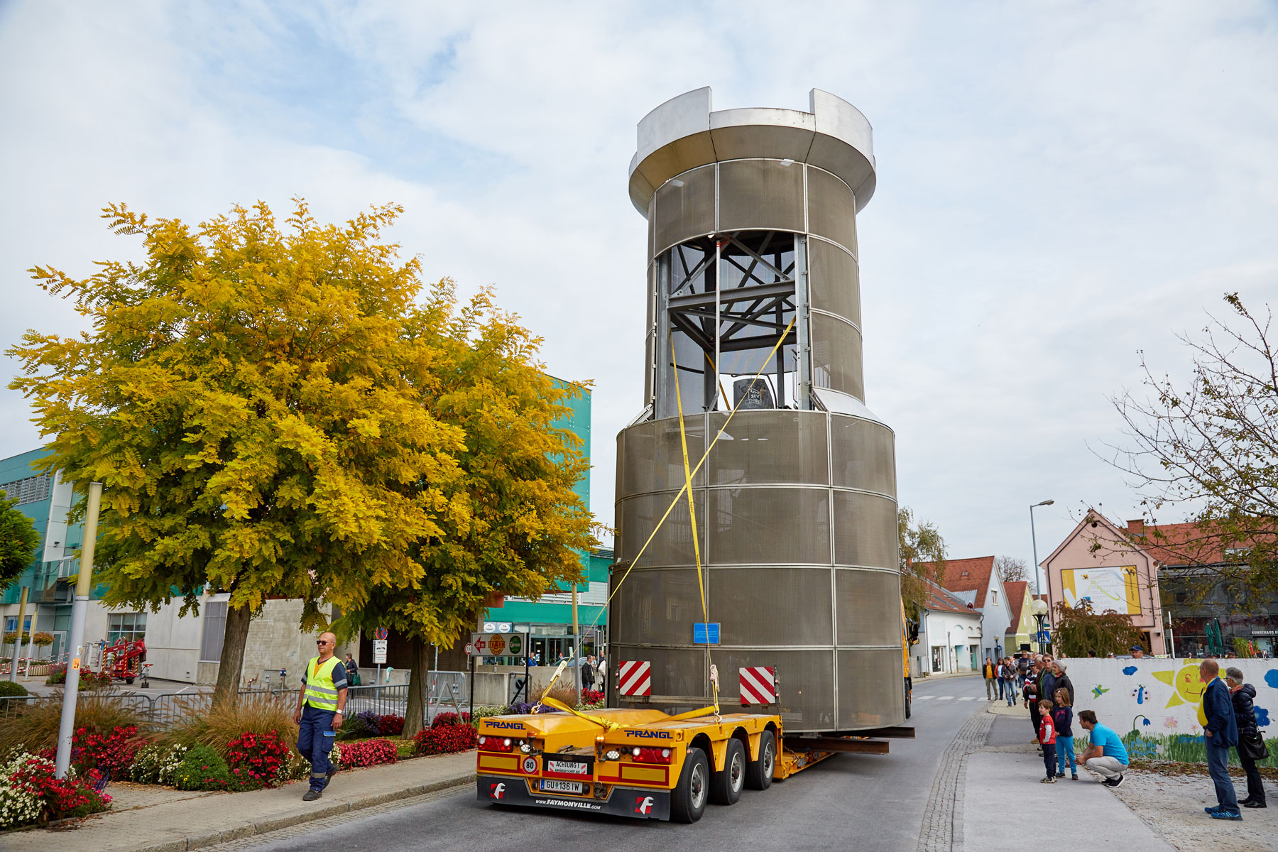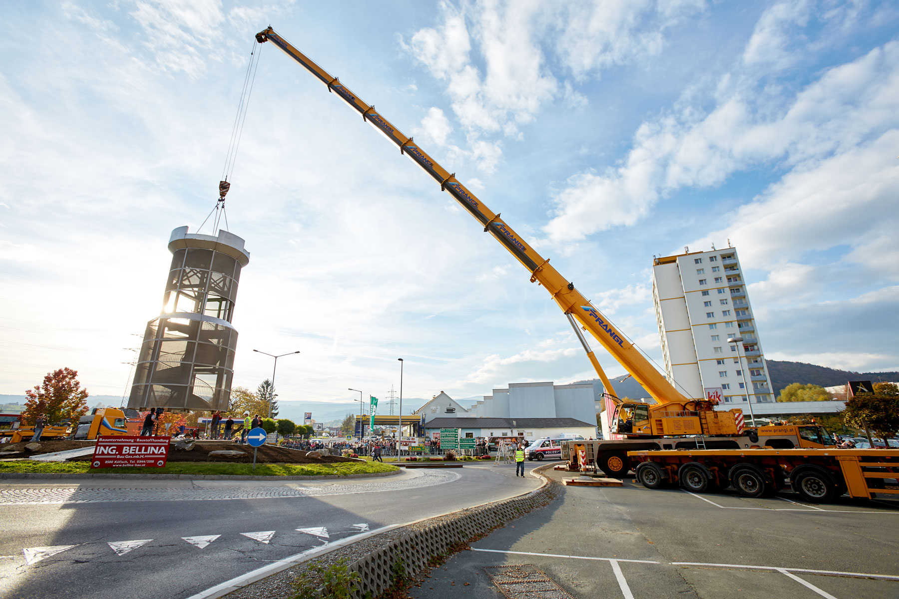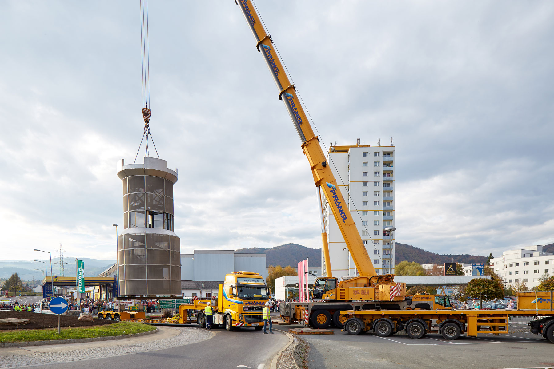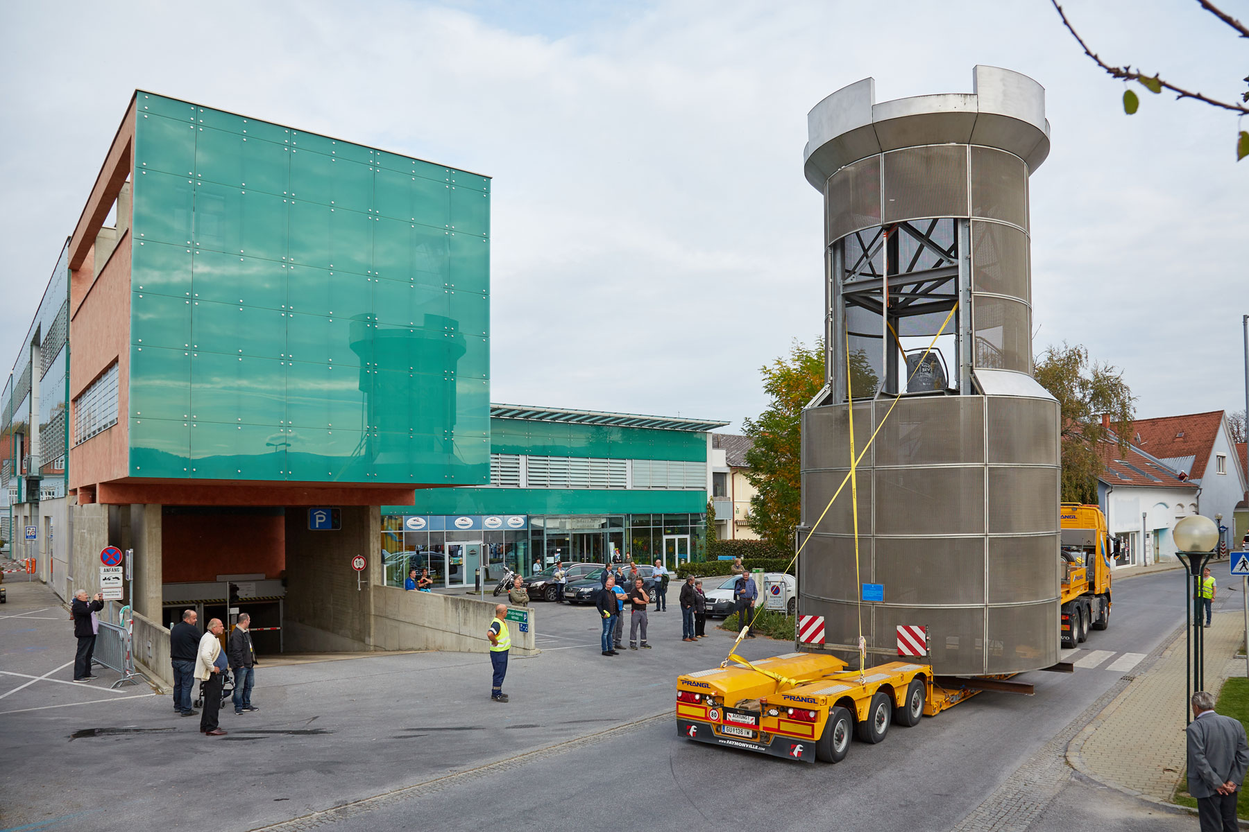 Sehr viele Zaungäste begleiteten den Turm auf dem Weg zu seinem neuen, repräsentativen Platz. Und unter großem Medien- und Zuschauerinteresse wurde das Köflacher Wahrzeichen dann auch schließlich mit einem 200 Tonnen Teleskopkran sicher in die Mitte des Kreisverkehrs gehoben. Einmal mehr hat sich gezeigt, welche Vorteile das schnittstellenfreie One-Stop-Shopping von Prangl bringt.