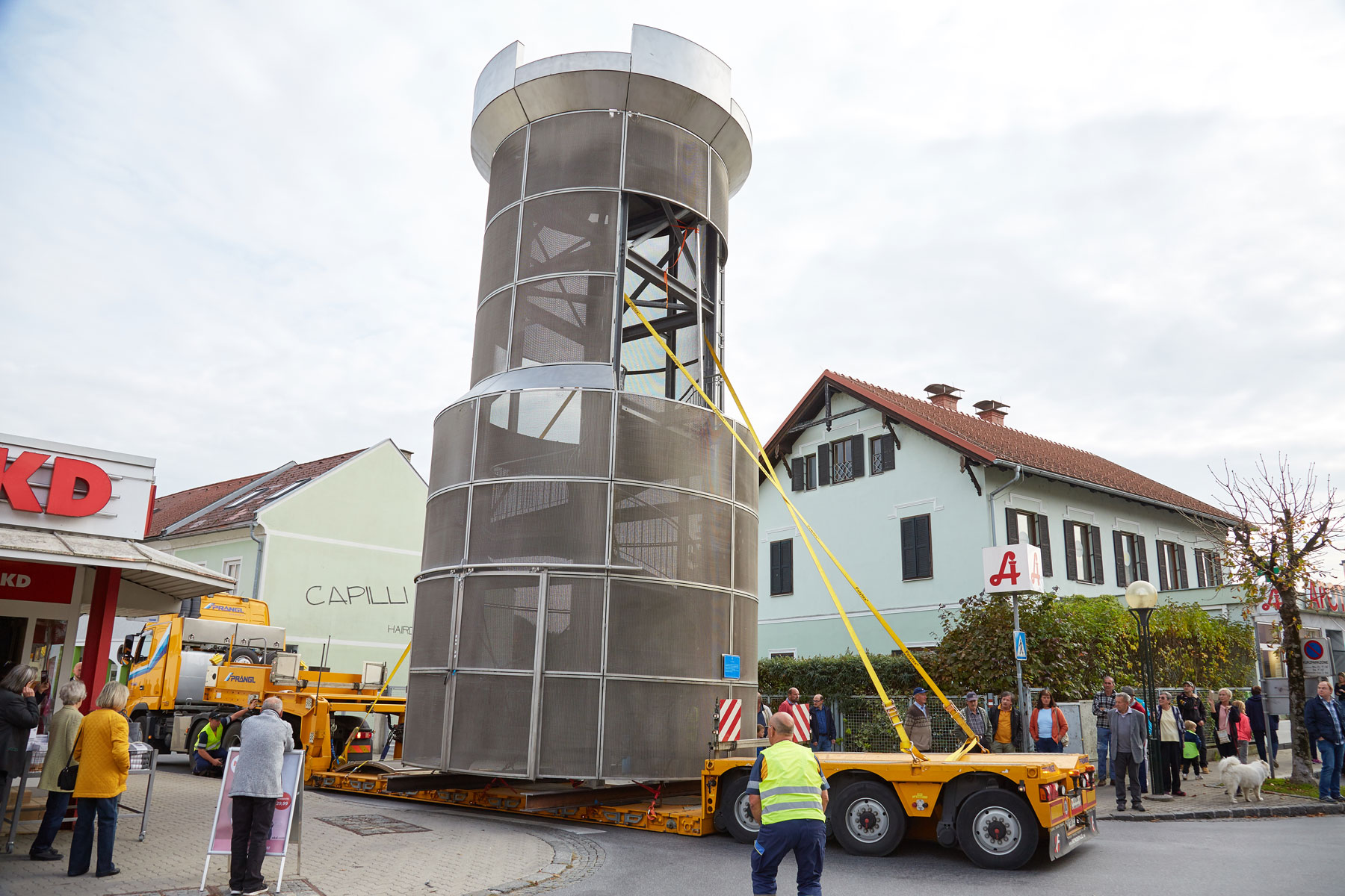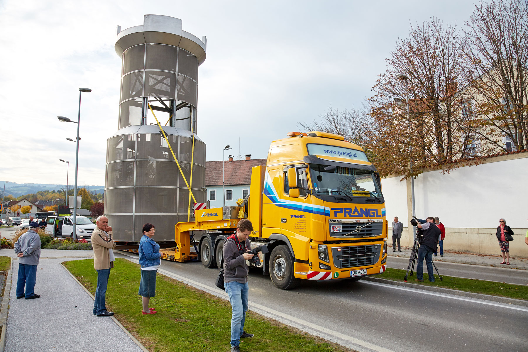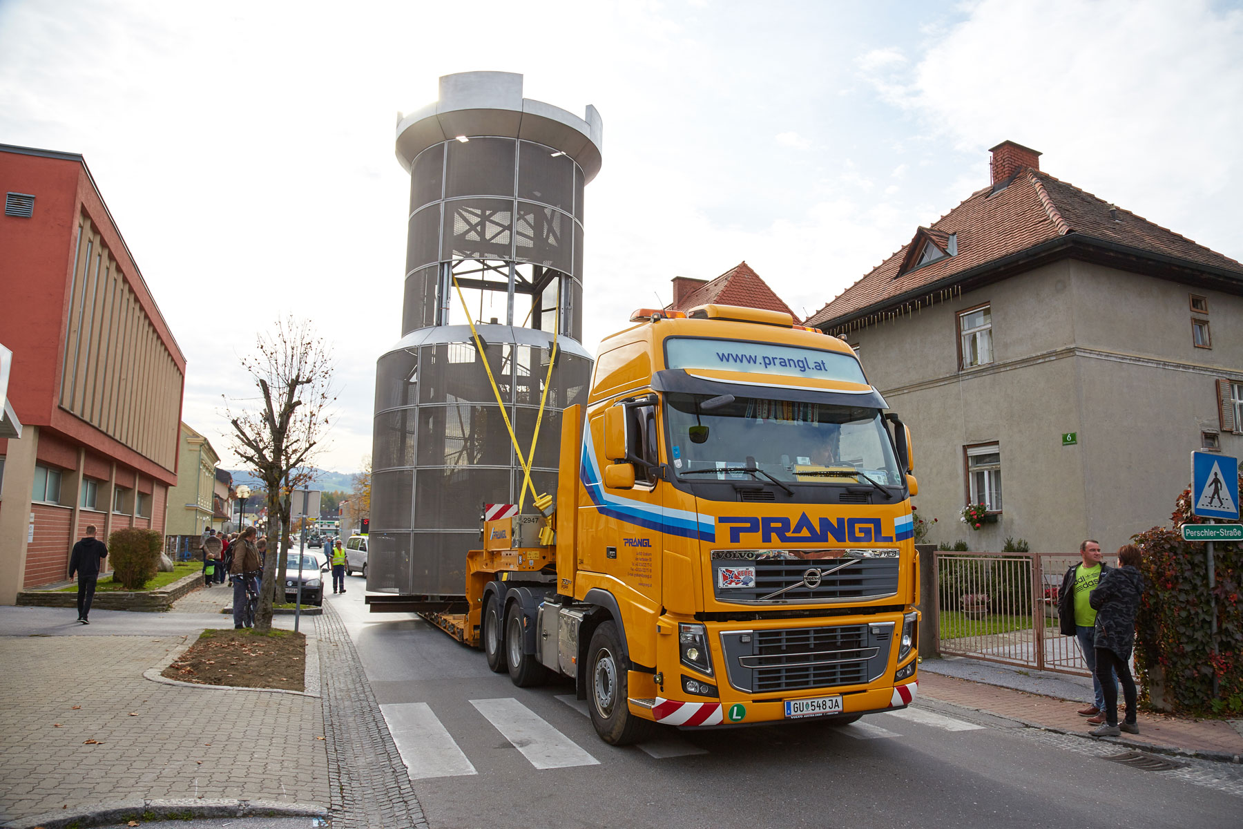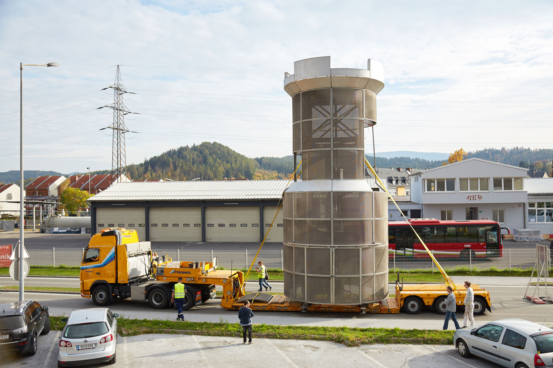 Sehr viele Zaungäste begleiteten den Turm auf dem Weg zu seinem neuen, repräsentativen Platz. Und unter großem Medien- und Zuschauerinteresse wurde das Köflacher Wahrzeichen dann auch schließlich mit einem 200 Tonnen Teleskopkran sicher in die Mitte des Kreisverkehrs gehoben. Einmal mehr hat sich gezeigt, welche Vorteile das schnittstellenfreie One-Stop-Shopping von Prangl bringt.