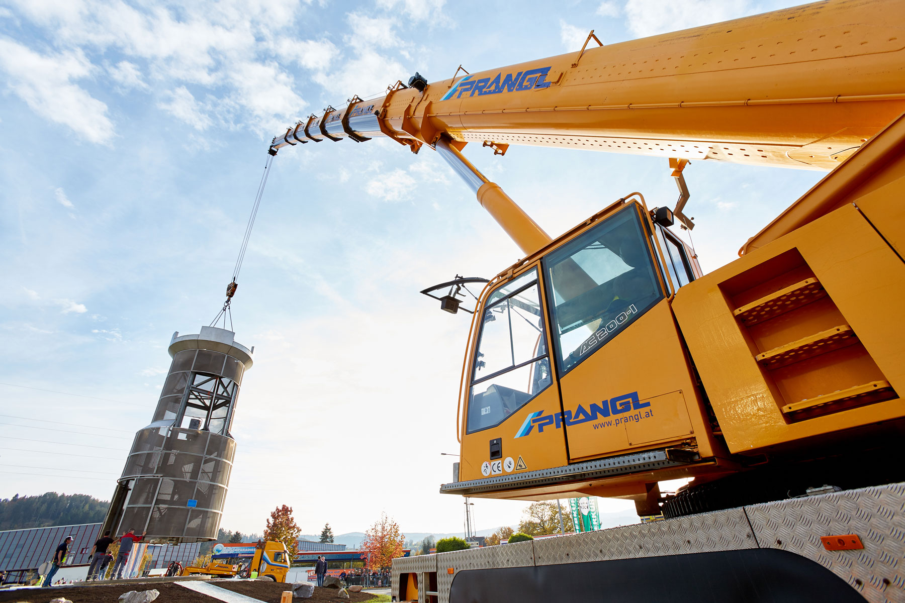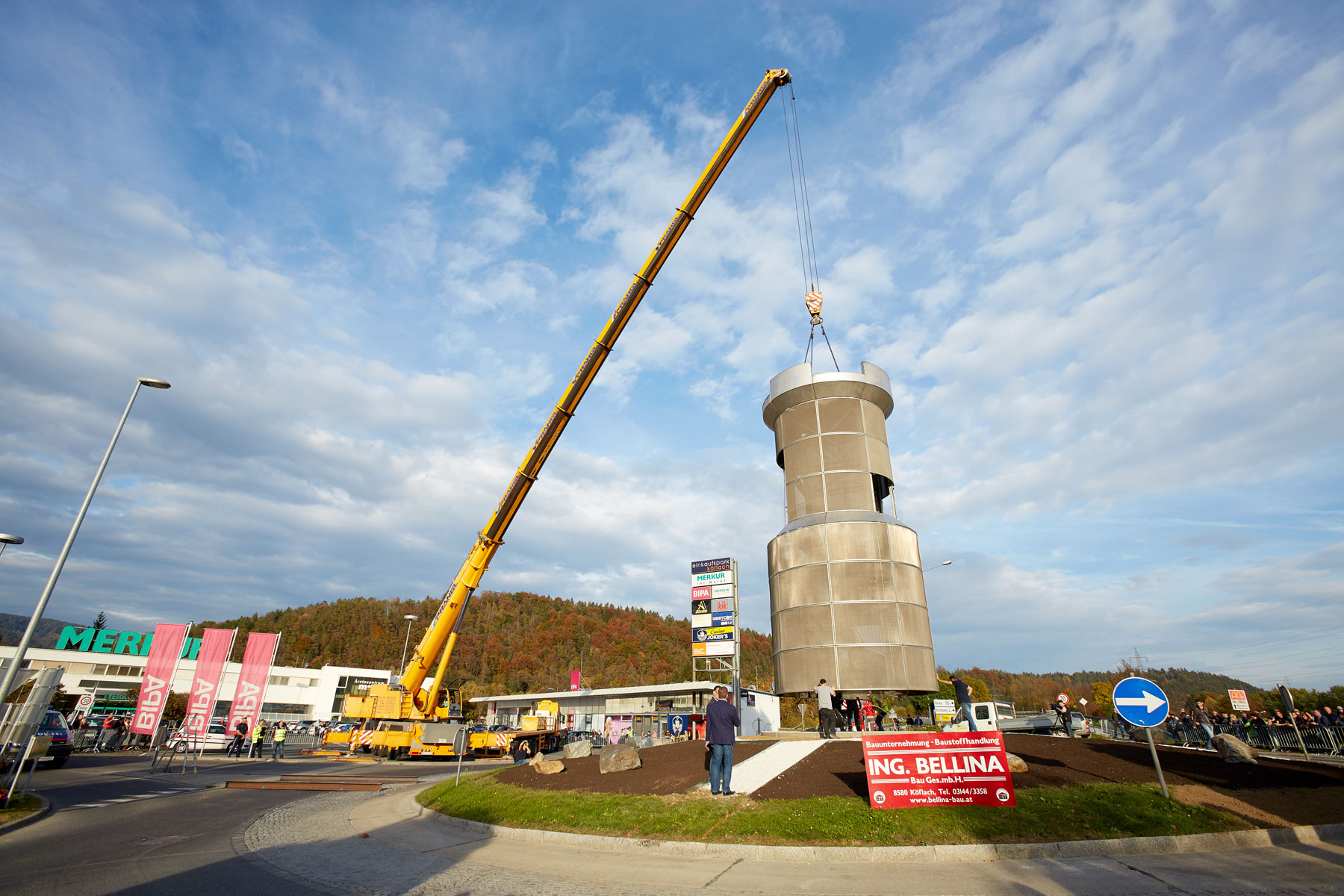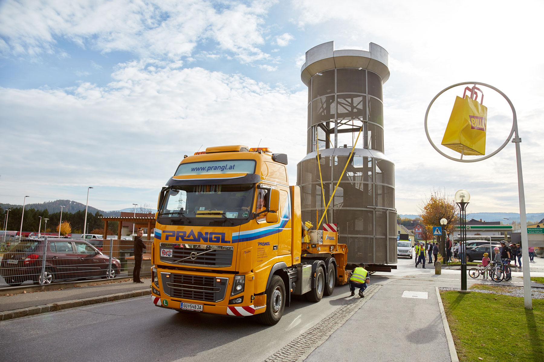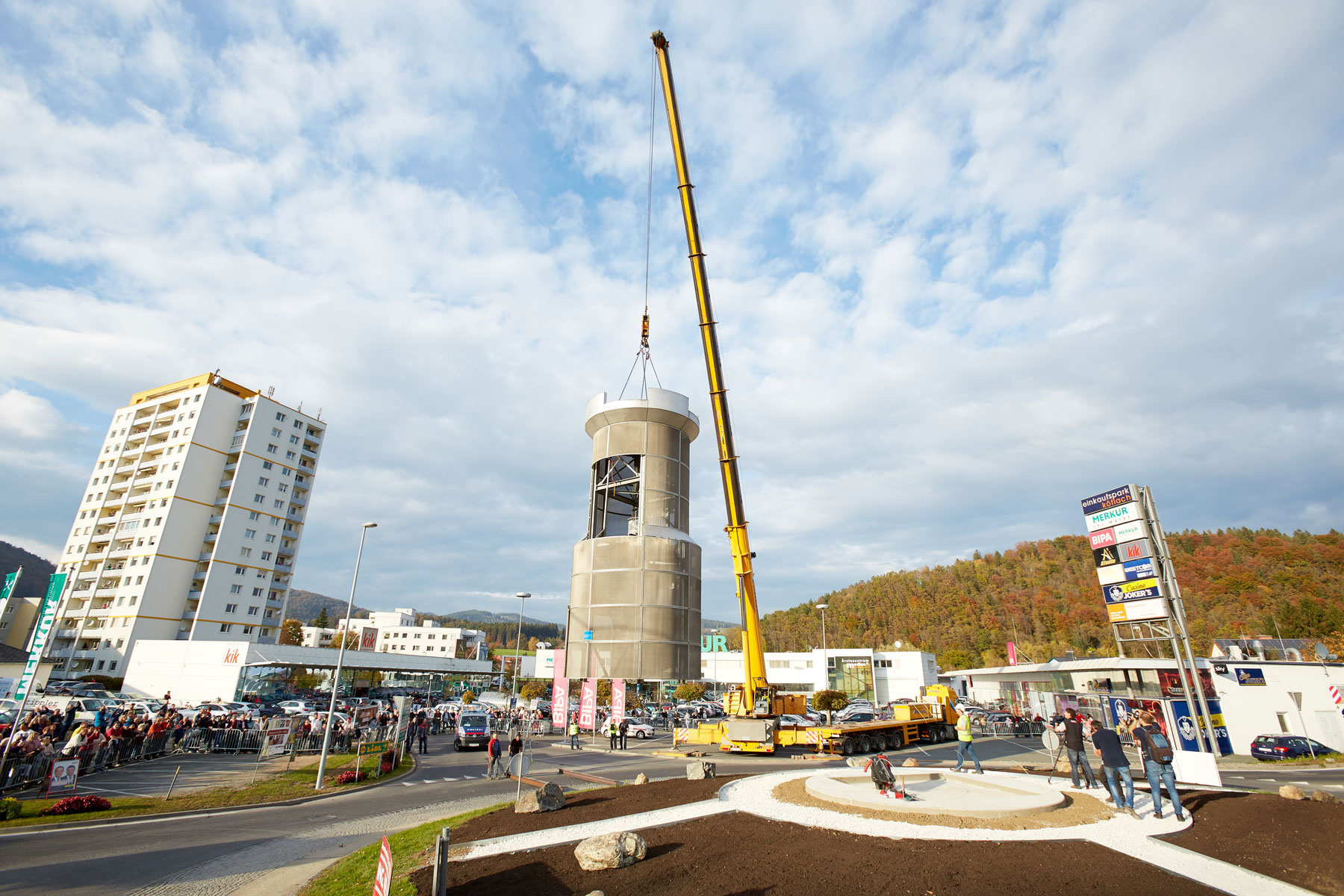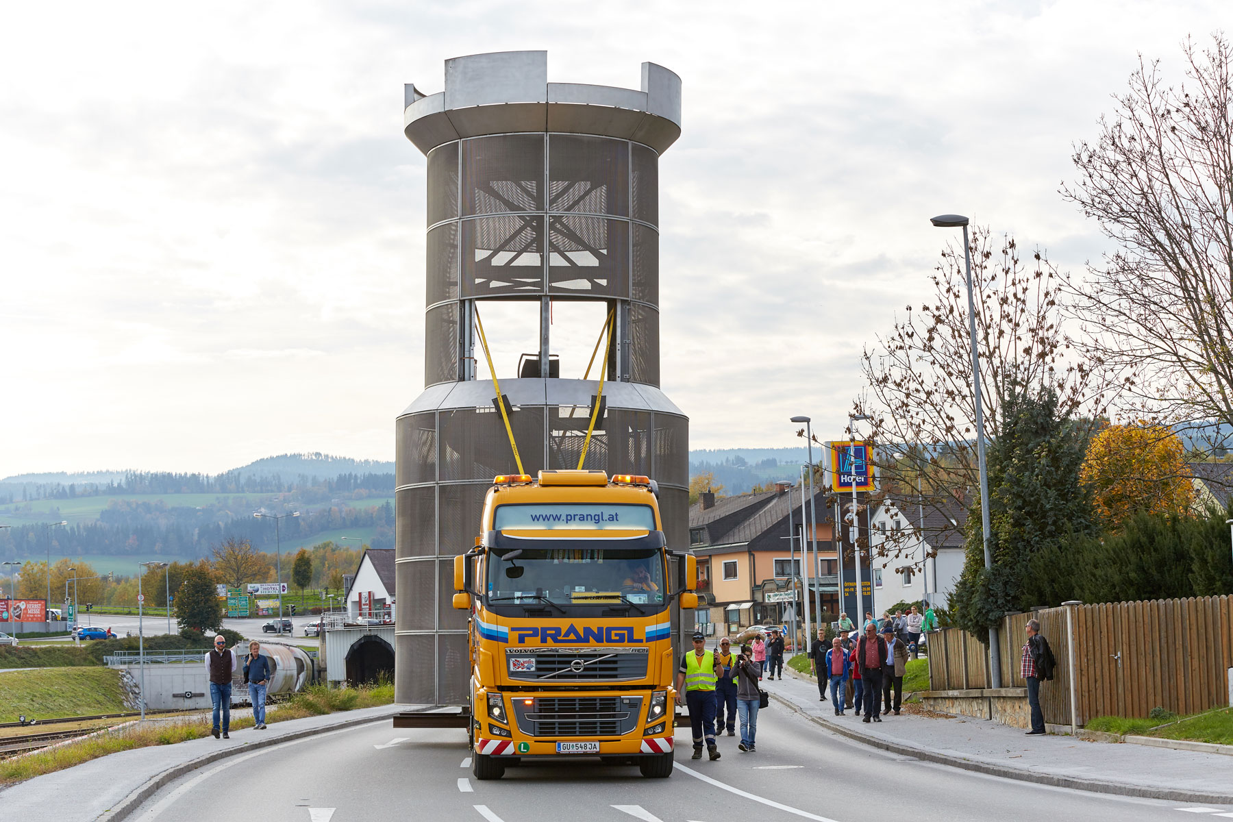 Sehr viele Zaungäste begleiteten den Turm auf dem Weg zu seinem neuen, repräsentativen Platz. Und unter großem Medien- und Zuschauerinteresse wurde das Köflacher Wahrzeichen dann auch schließlich mit einem 200 Tonnen Teleskopkran sicher in die Mitte des Kreisverkehrs gehoben. Einmal mehr hat sich gezeigt, welche Vorteile das schnittstellenfreie One-Stop-Shopping von Prangl bringt.
