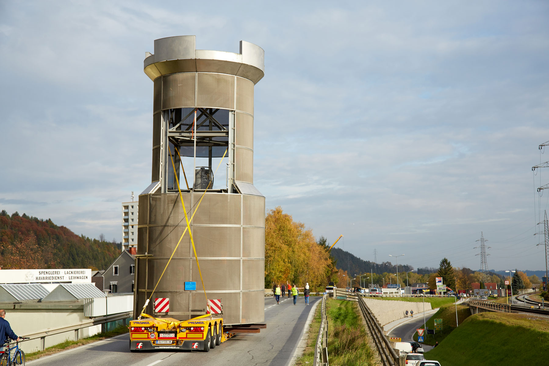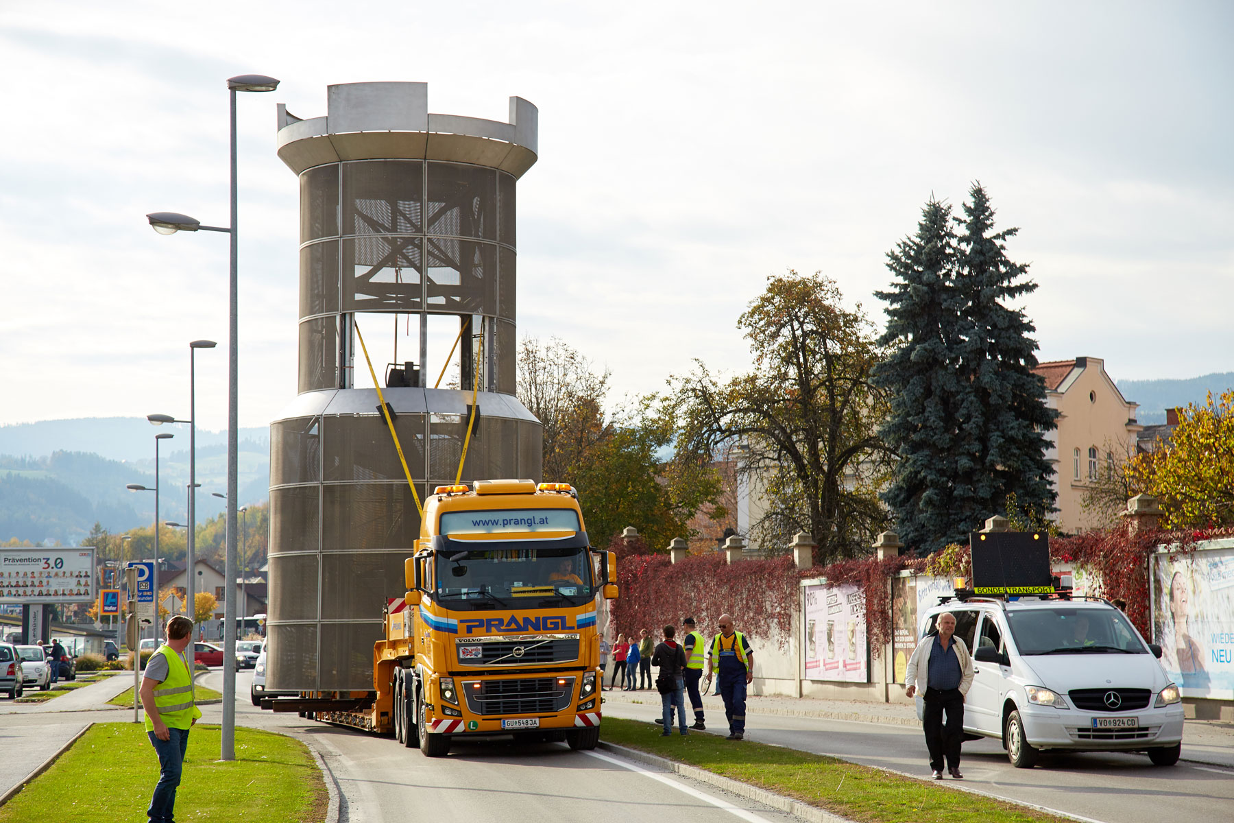 Um die Kippgefahr zu minimieren wurde die Bodenfreiheit des Tiefladers auf rund einen Zentimeter verringert. Aufgrund des hohen Schwerpunkts war jede Lenkbewegung entscheidend. Spannung war auch bei der einen oder anderen Straßenlaterne garantiert. Mit einem Abstand von nur ein paar Zentimeter wurde der Stadtturm an den Leuchten vorbeibewegt. Dank der Erfahrung und des Zusammenspiels des gesamten Prangl-Teams konnte jedes Hindernis bravourös gemeistert werden.