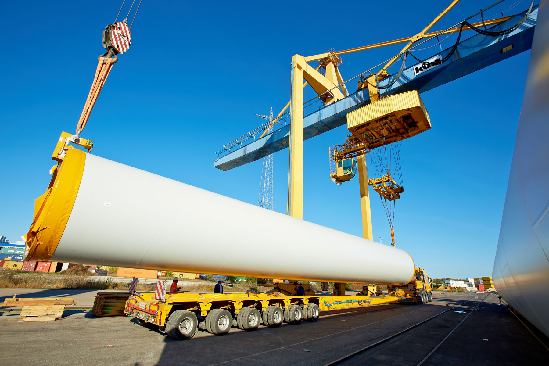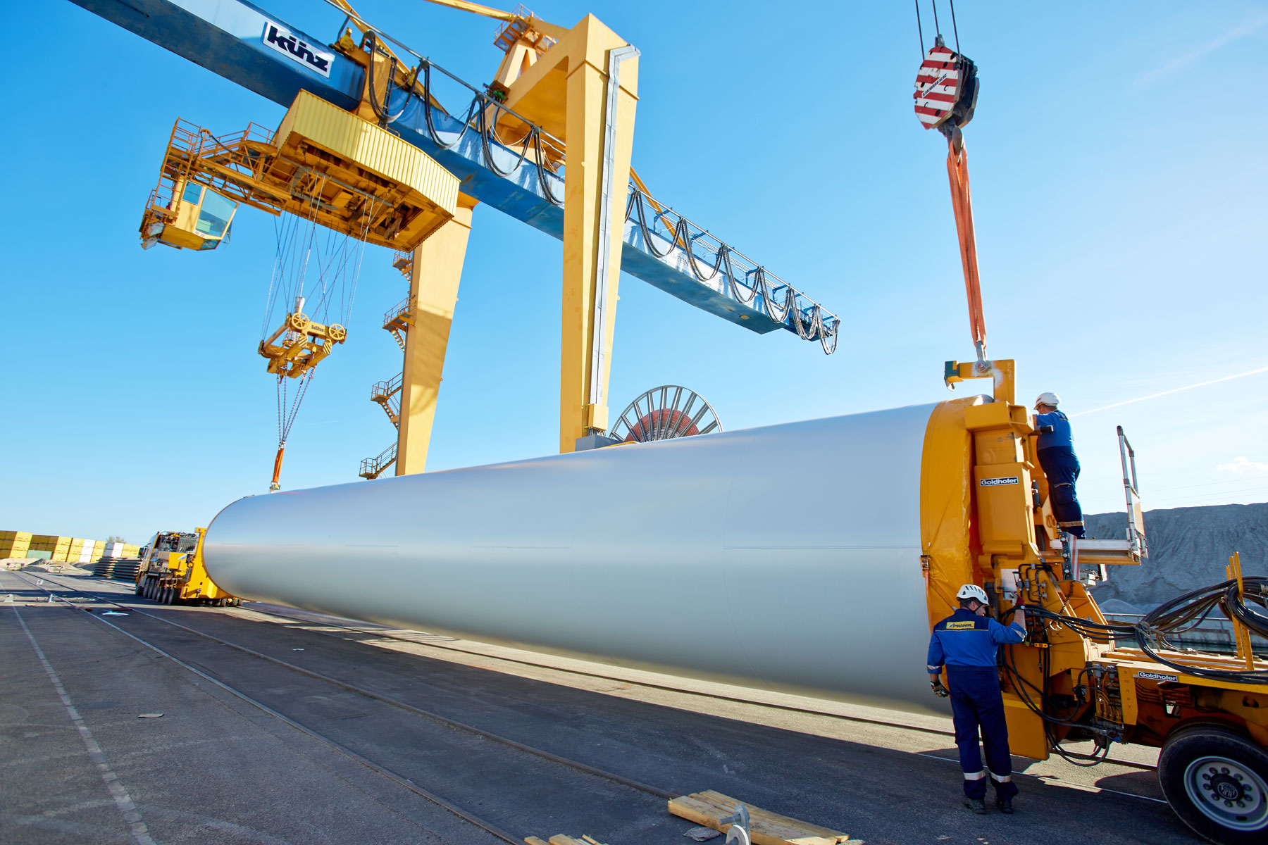 Bei dieser Aufgabe galt es zuvor ein sehr genaues Konzept zu erstellen. Denn bei einer maximalen Transportlänge von 49 Meter musste schon im Vorfeld sehr bedacht überlegt werden wie man am besten vorgehen könnte. Die Schiffsentladung passierte mit dem örtlichen Hafenkran und einem 130 Tonnen Teleskopkran. Aufgrund der unterschiedlichen Krantechnologien stellt ein derartiger Tandemhub immer eine besondere Herausforderung dar.
