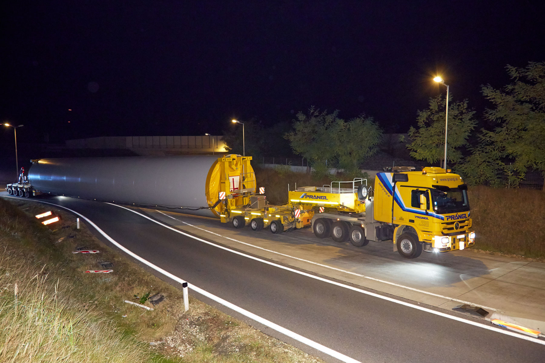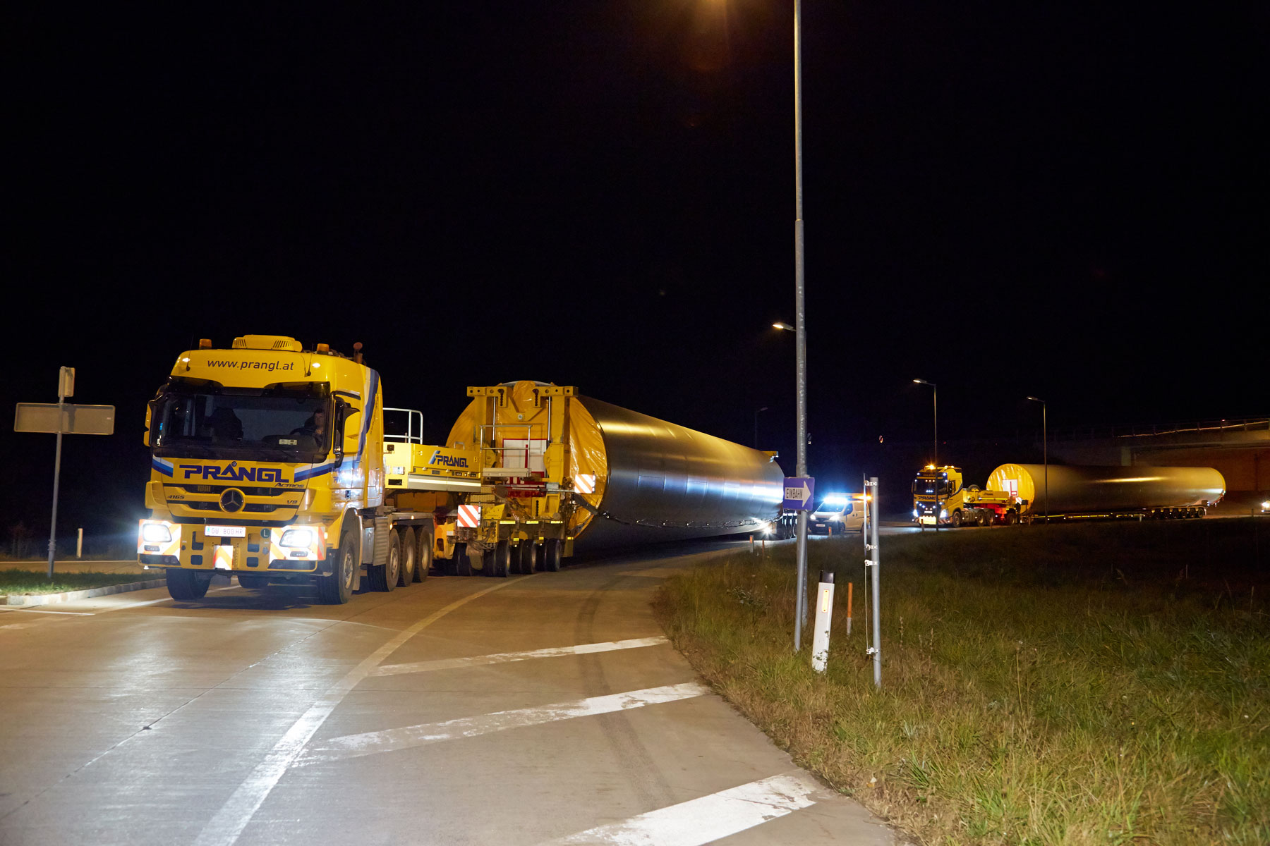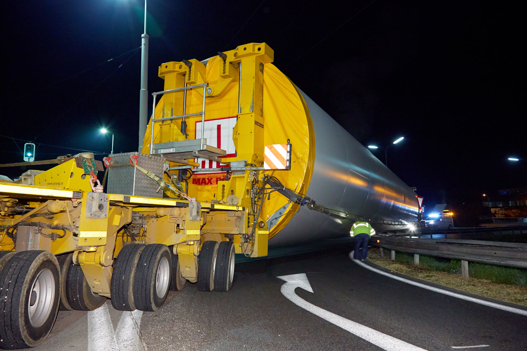 Nach erfolgreicher Entladung galt es, die bis zu 118 Tonnen schweren Spezialtransporte sicher in den Windpark zu bekommen. In den Nachtstunden wurde dies von den Prangl-Spezialisten mit Bravour erledigt, wobei die Strecke teilweise entgegen der Fahrtrichtung auf der S5 absolviert wurde. Das letzte Stück musste teilweise im Retourgang bewältigt werden. Nur so konnte eine optimale Positionierung für das anschließende Aufstellen der Windräder gewährleistet werden.