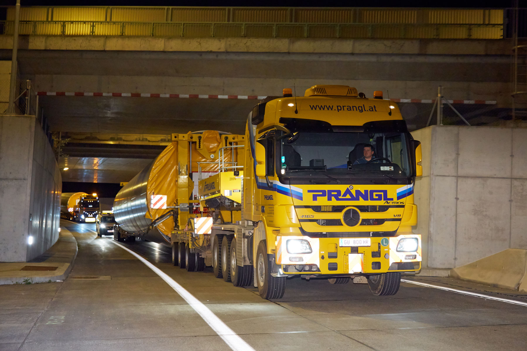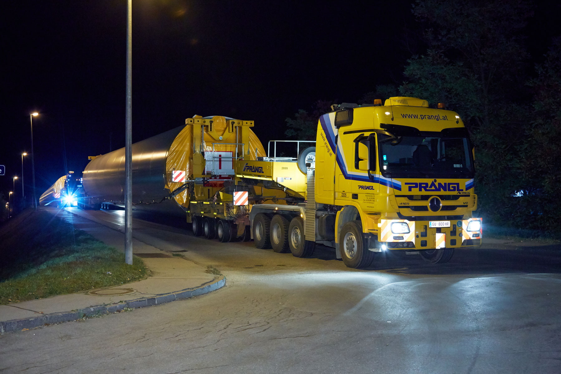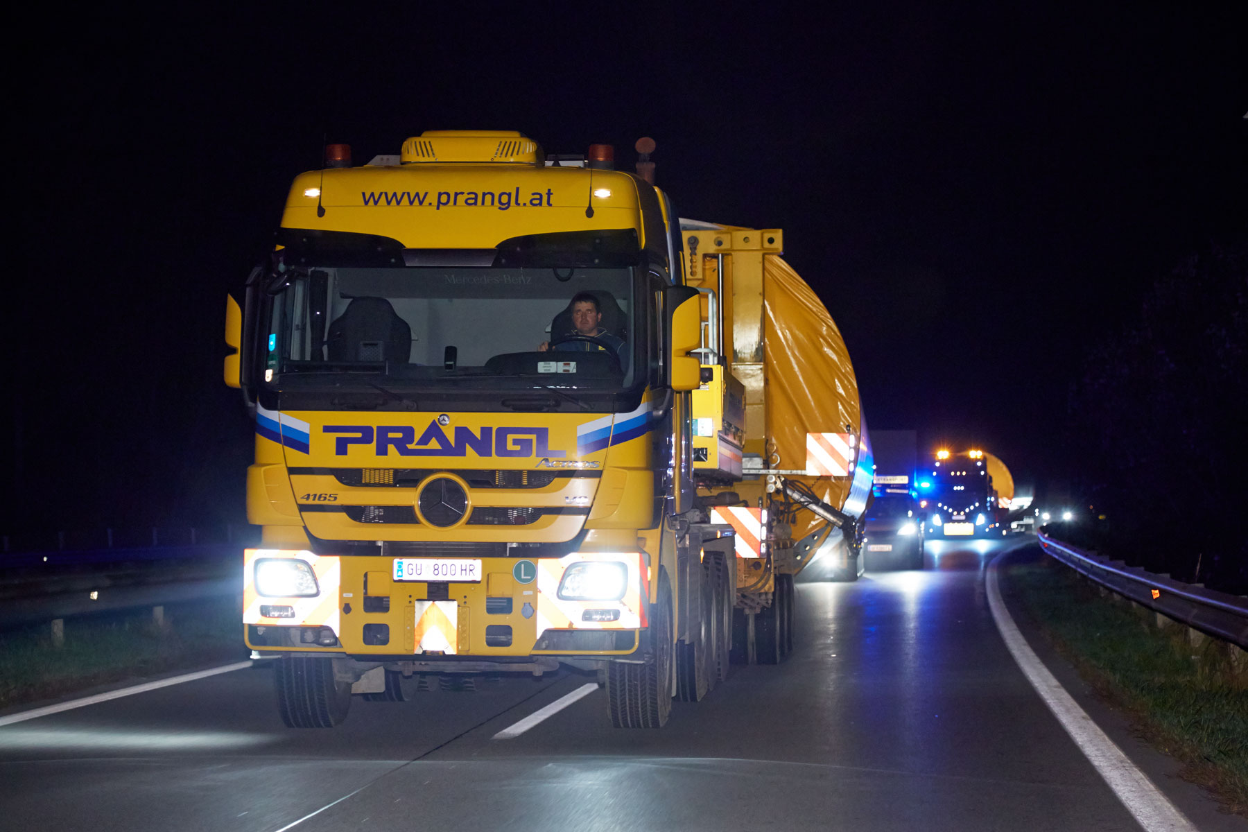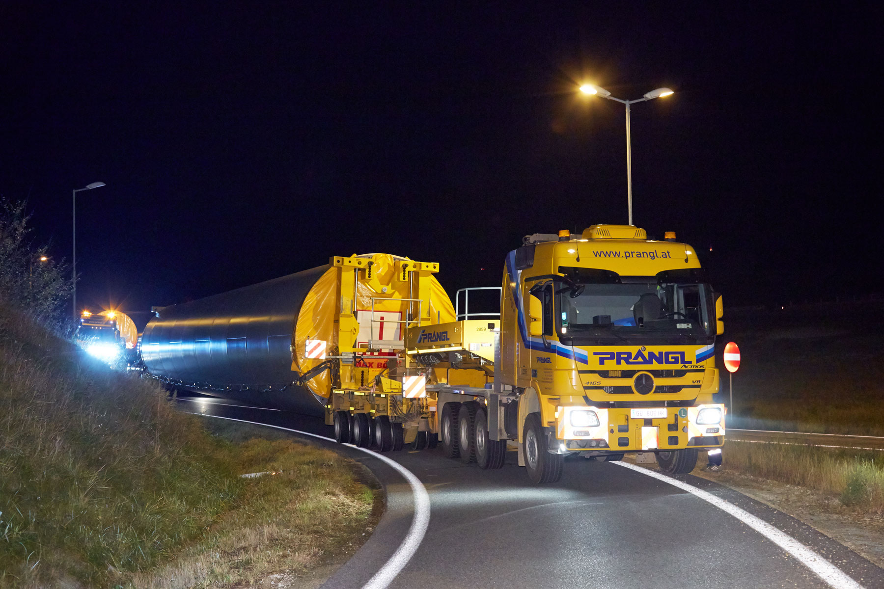 Nach erfolgreicher Entladung galt es, die bis zu 118 Tonnen schweren Spezialtransporte sicher in den Windpark zu bekommen. In den Nachtstunden wurde dies von den Prangl-Spezialisten mit Bravour erledigt, wobei die Strecke teilweise entgegen der Fahrtrichtung auf der S5 absolviert wurde. Das letzte Stück musste teilweise im Retourgang bewältigt werden. Nur so konnte eine optimale Positionierung für das anschließende Aufstellen der Windräder gewährleistet werden.