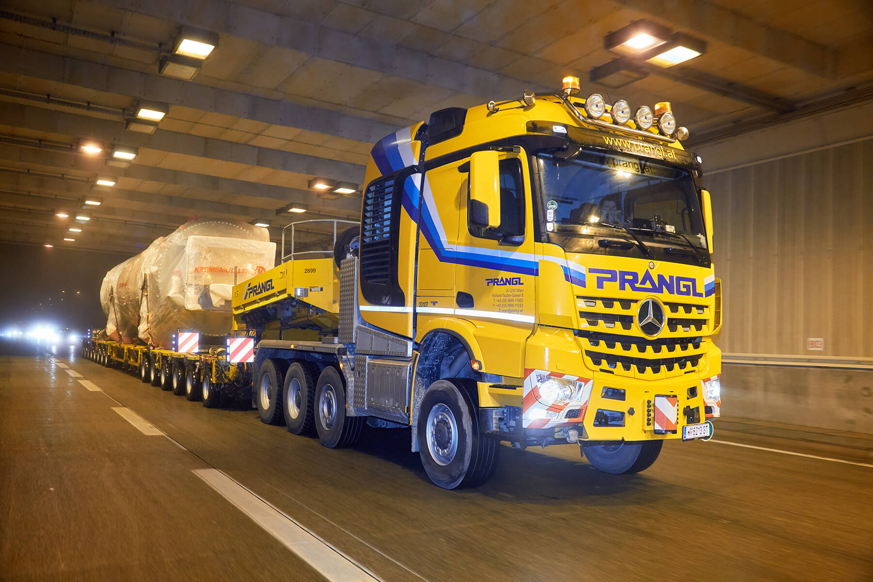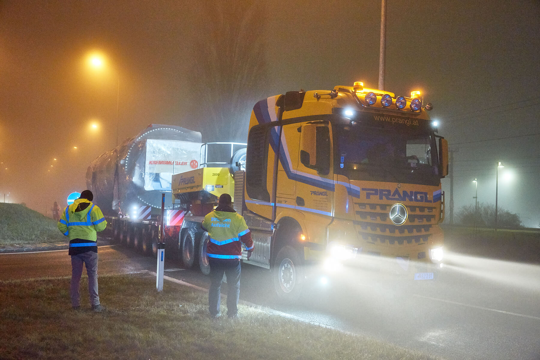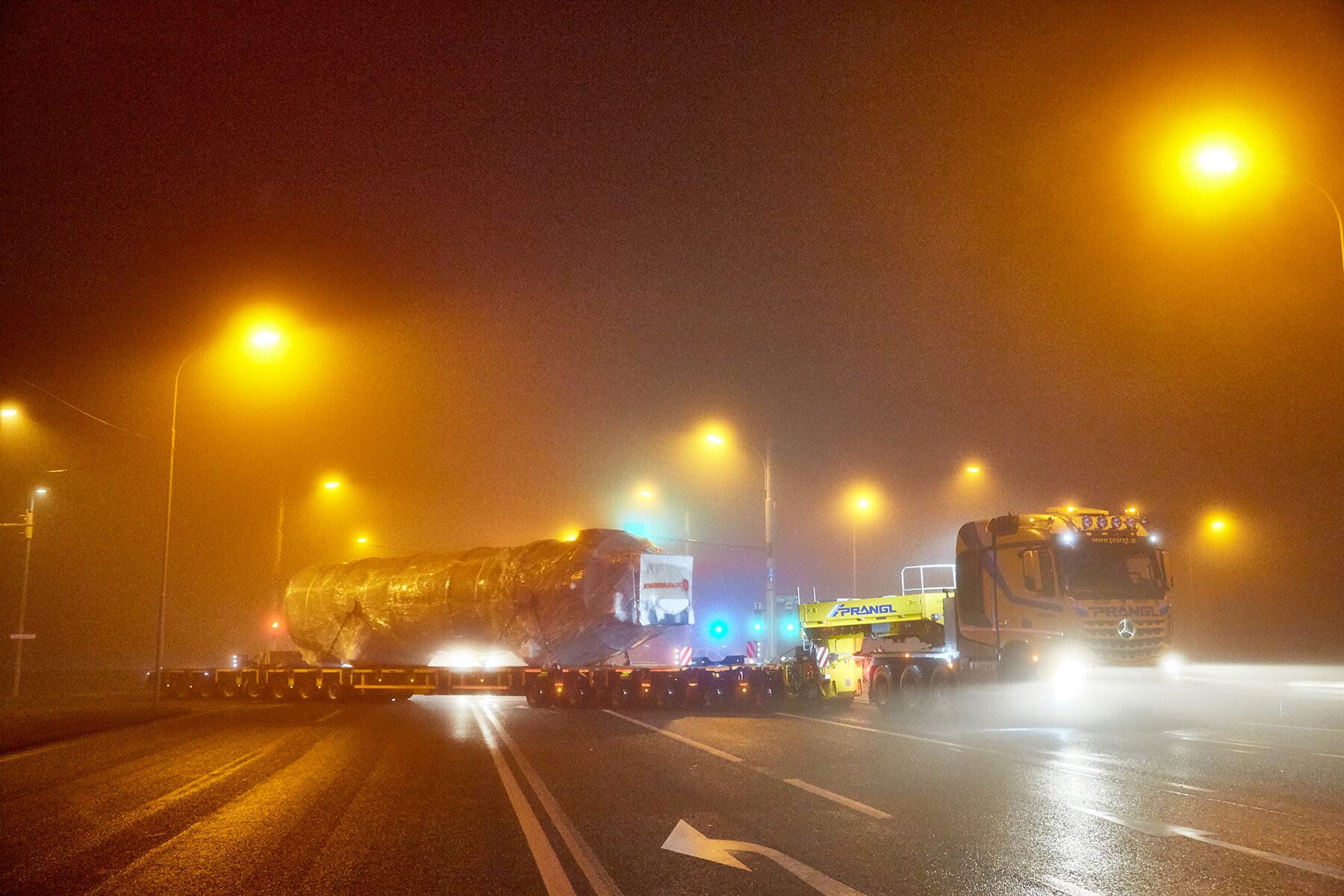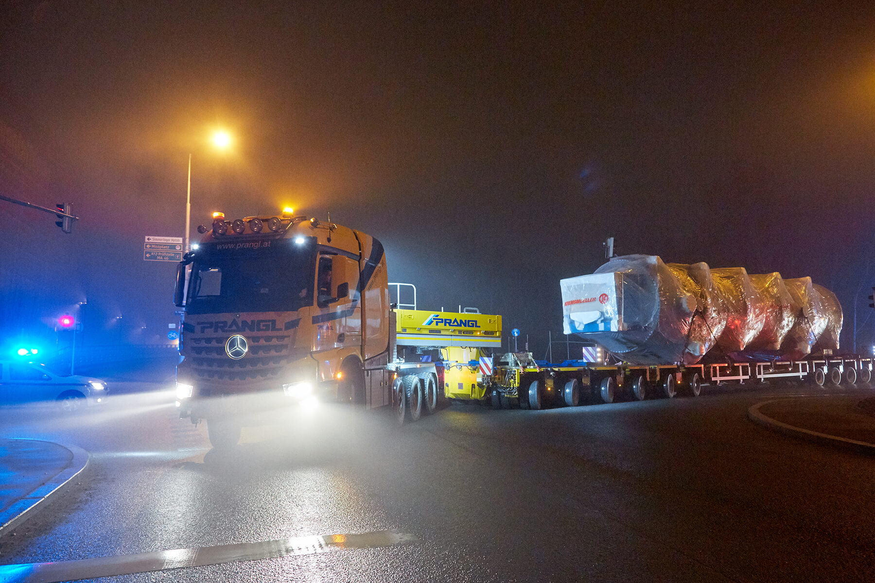 An zwei getrennten Tagen wurden die beiden Klärschlammtrockner auf insgesamt 18 Achsen von Oberösterreich nach Wien transportiert. Speziell die Nachttransporte durch Wien stellten sich sehr spektakulär dar. Die geschulten Prangl-Fahrer manövrierten die 39 Meter langen Schwertransporteinheiten gekonnt durch sämtliche Engstellen der Bundeshauptstadt. Ein 100 Metertonnen Ladekran unterstützte den Transport mit zahlreichen verkehrslenkenden Maßnahmen, wie beispielsweise dem temporären Wegräumen von Betonleitwänden.