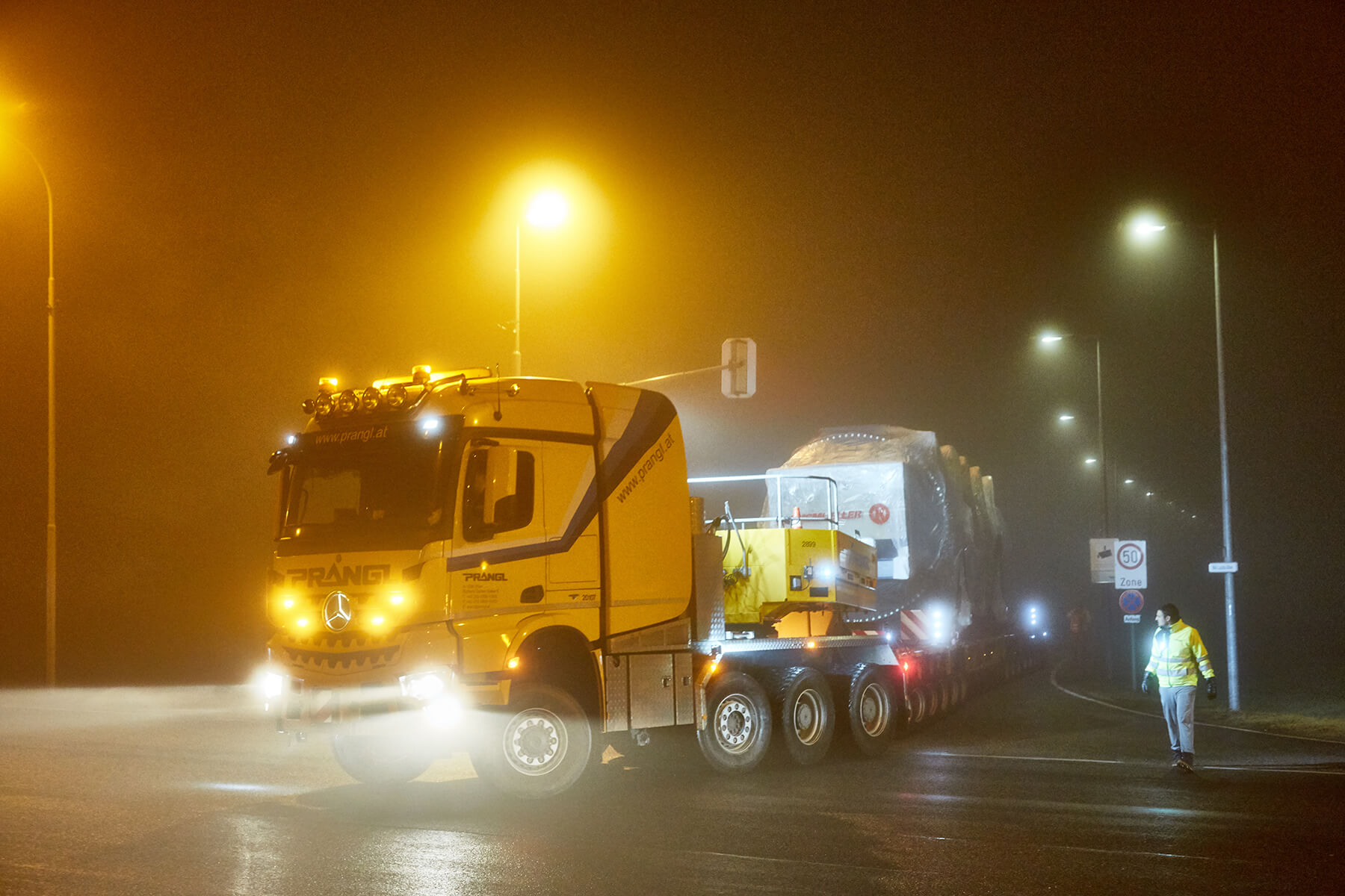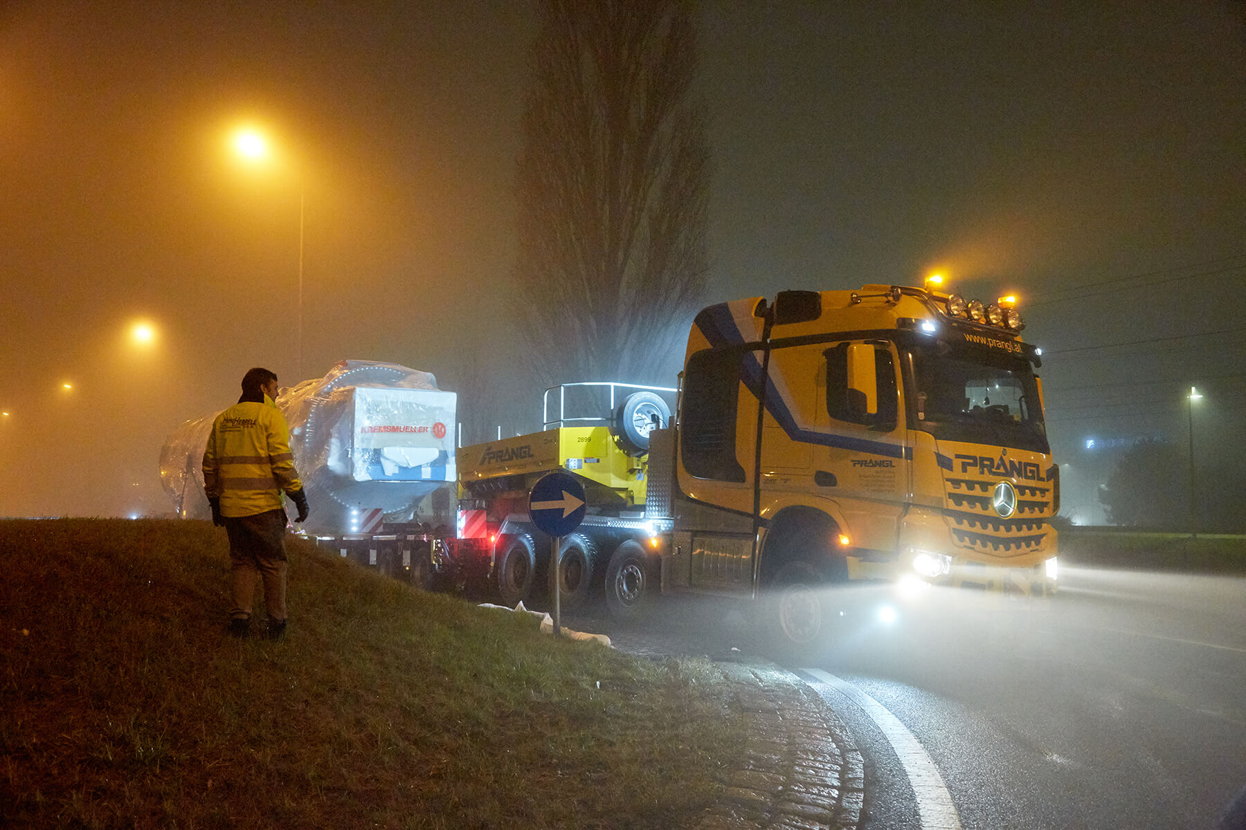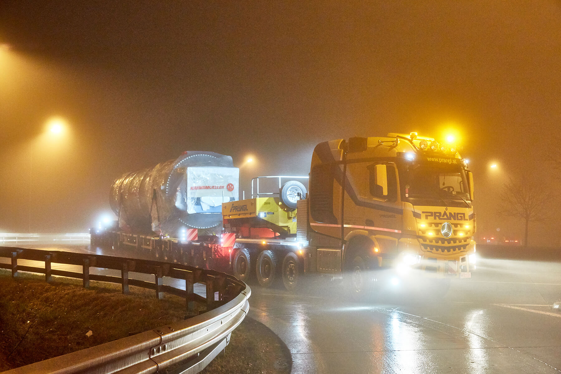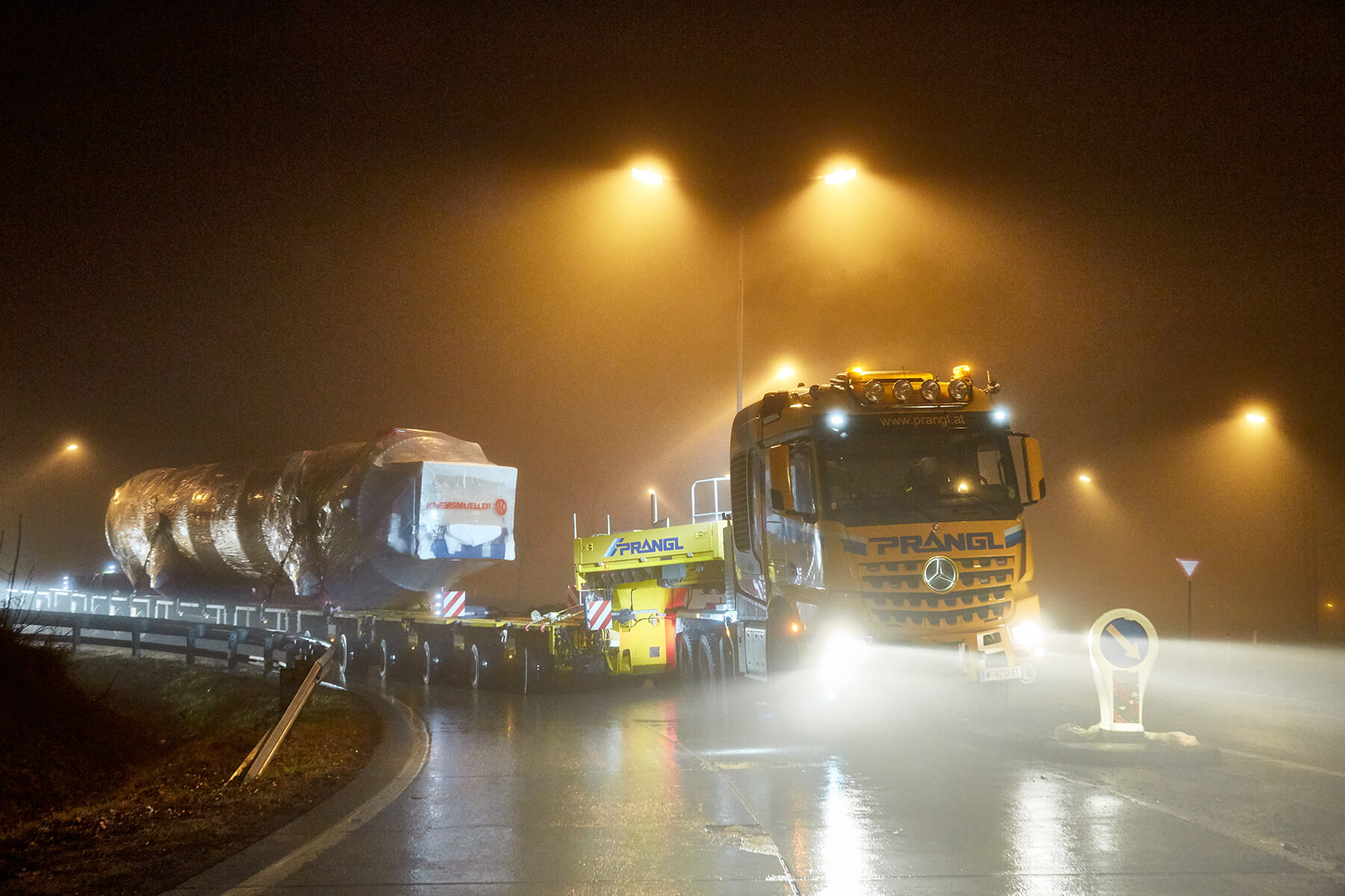 An zwei getrennten Tagen wurden die beiden Klärschlammtrockner auf insgesamt 18 Achsen von Oberösterreich nach Wien transportiert. Speziell die Nachttransporte durch Wien stellten sich sehr spektakulär dar. Die geschulten Prangl-Fahrer manövrierten die 39 Meter langen Schwertransporteinheiten gekonnt durch sämtliche Engstellen der Bundeshauptstadt. Ein 100 Metertonnen Ladekran unterstützte den Transport mit zahlreichen verkehrslenkenden Maßnahmen, wie beispielsweise dem temporären Wegräumen von Betonleitwänden.