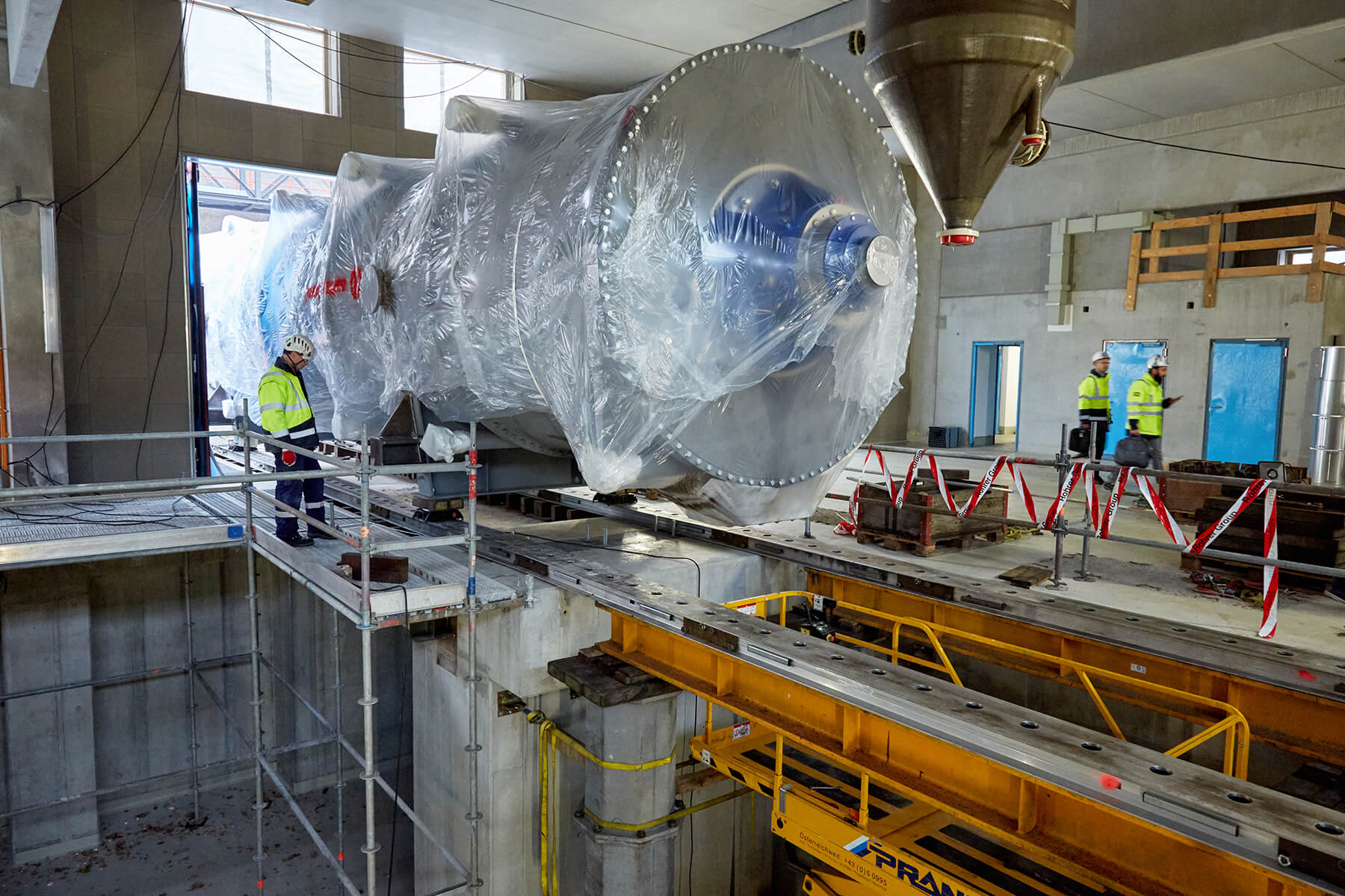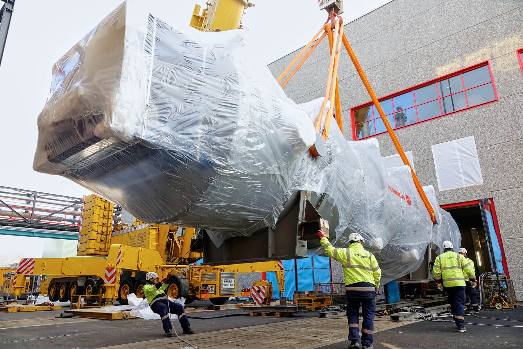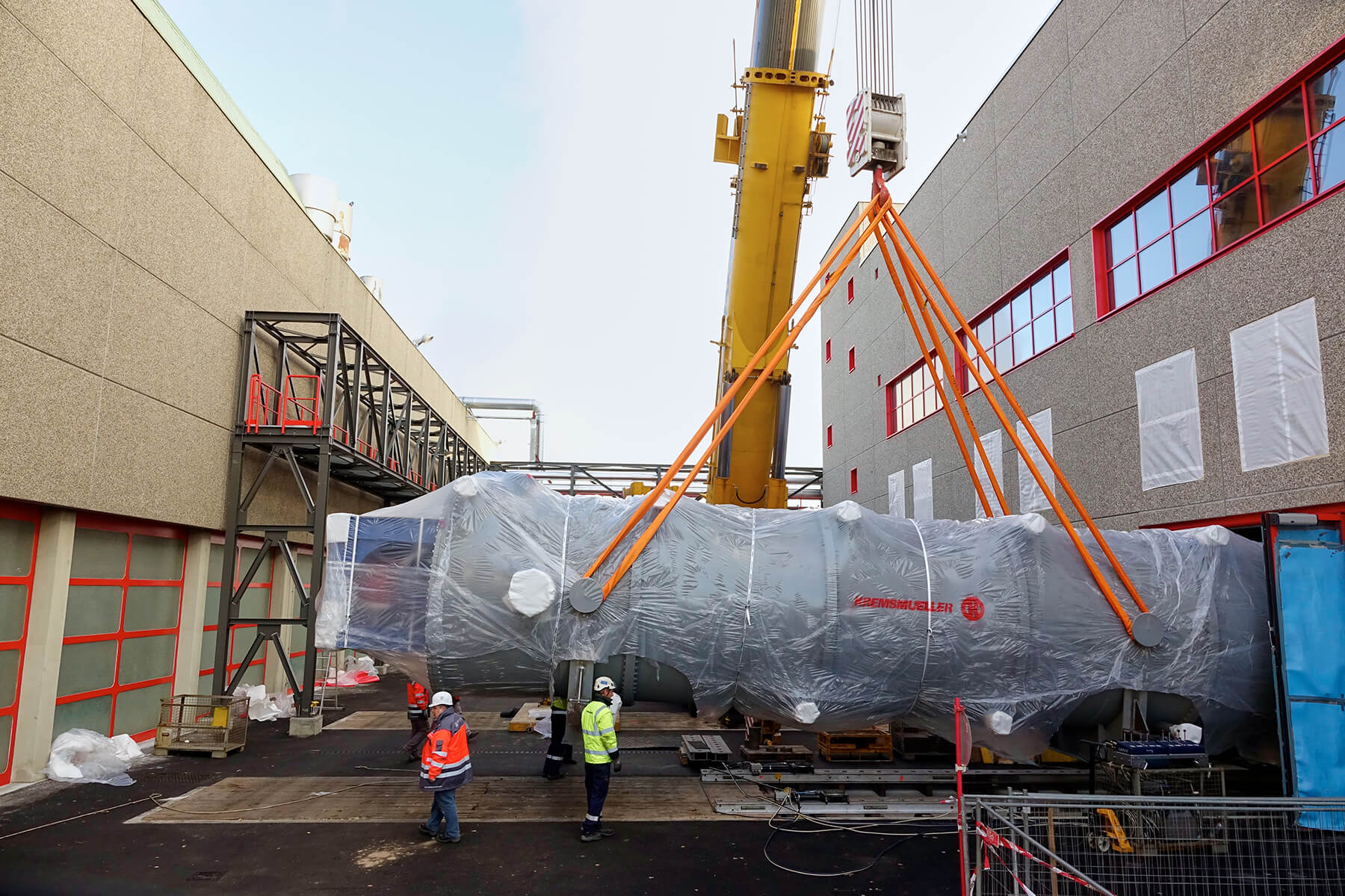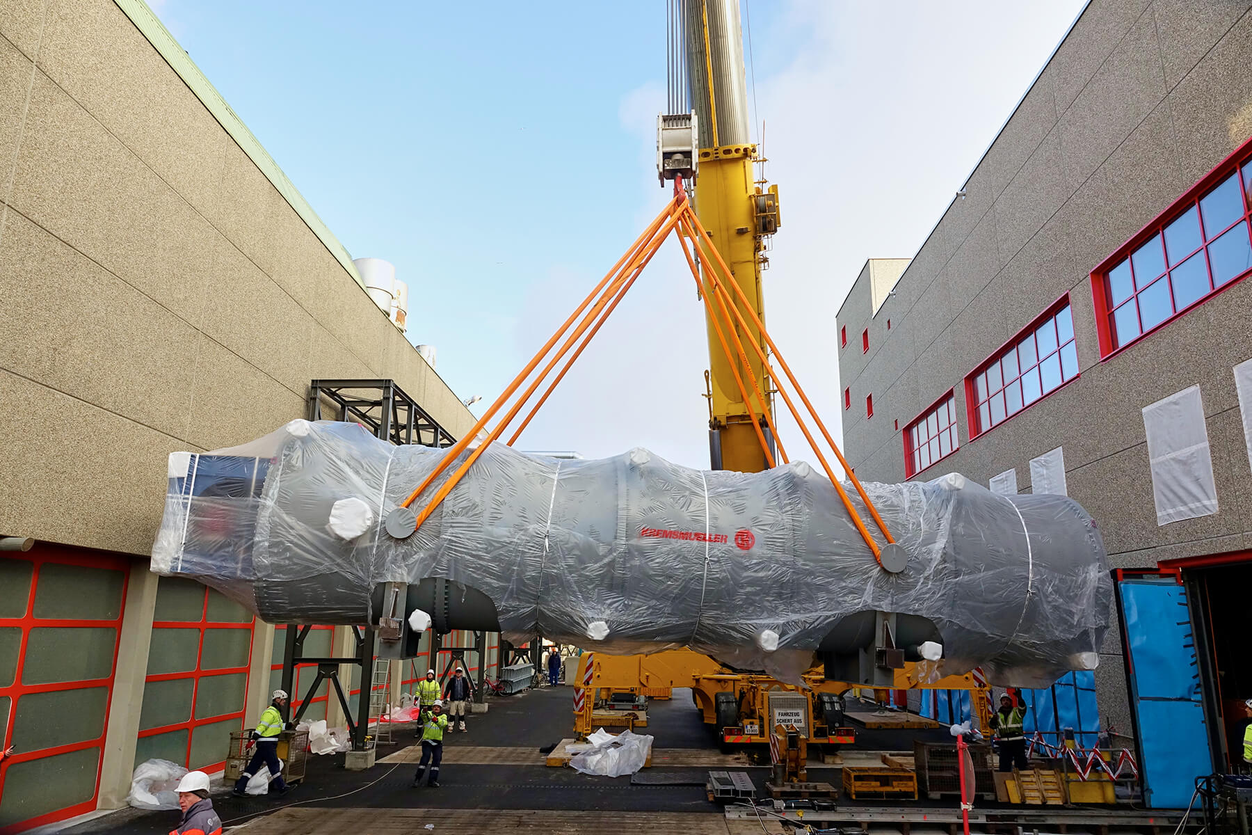 Wegen der engen Platzverhältnisse vor Ort mussten die überlangen Behälter mit einem 500 Tonnen Teleskopkran abgeladen werden. Nach einer kurzen Zwischenlagerung verhob der gelbe Riese den jeweiligen Trockner auf das Aufgleissystem PVSL 75. Nur mit diesem speziellen Schienensystem war es möglich, die Objekte in das gewünschte Gebäude einzubringen. Dank seiner kompakten Bauweise stellte auch die begrenze Einbringungshöhe kein Problem dar.