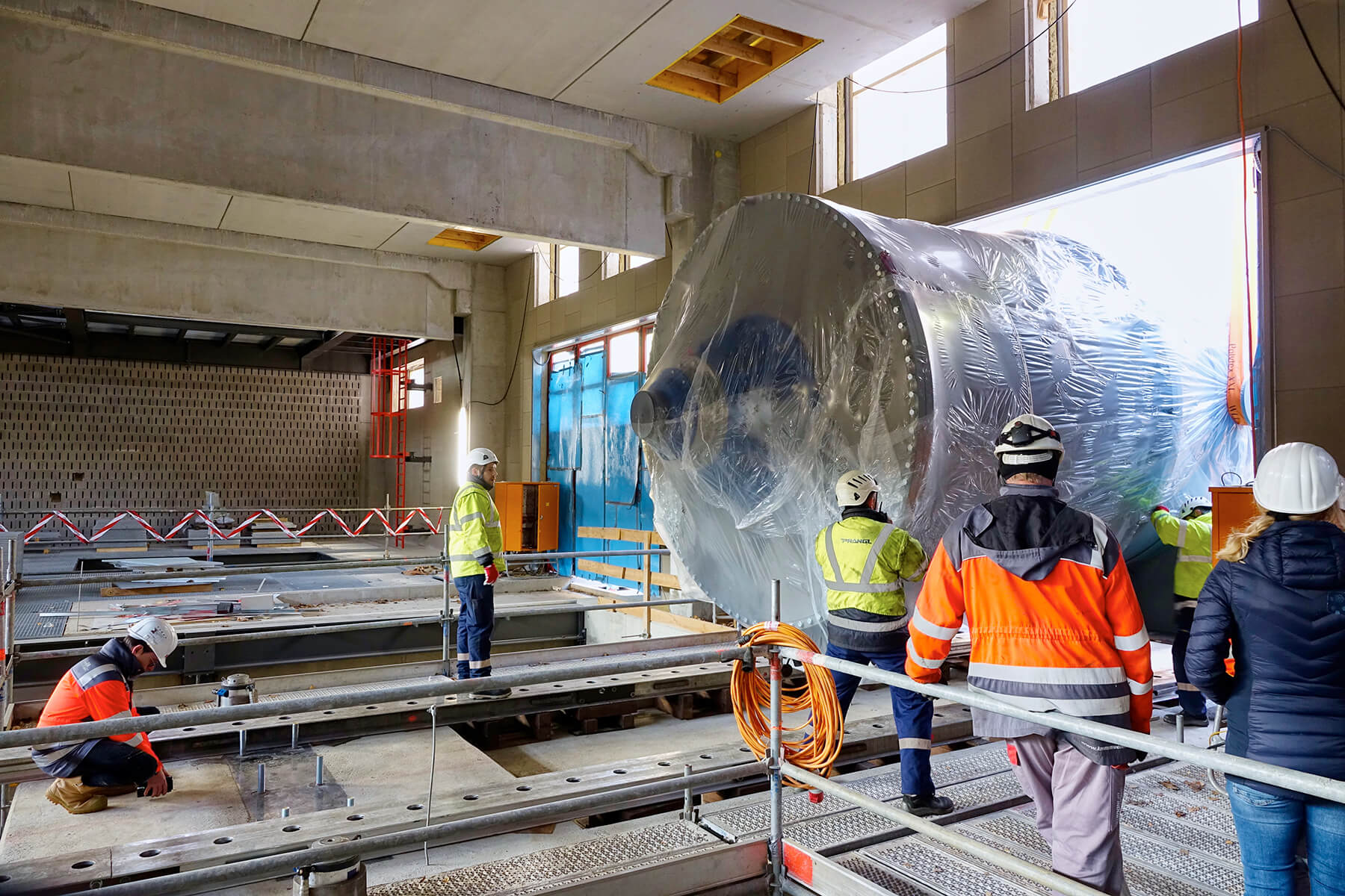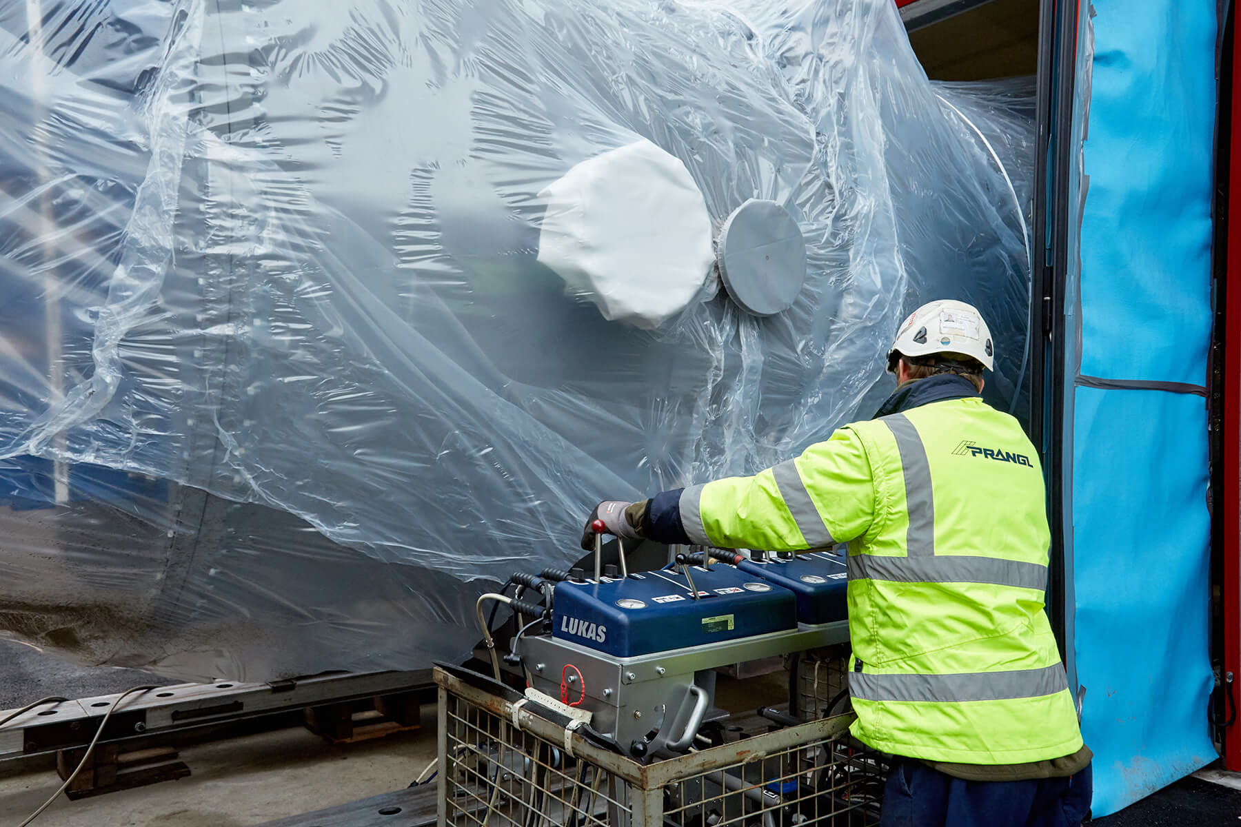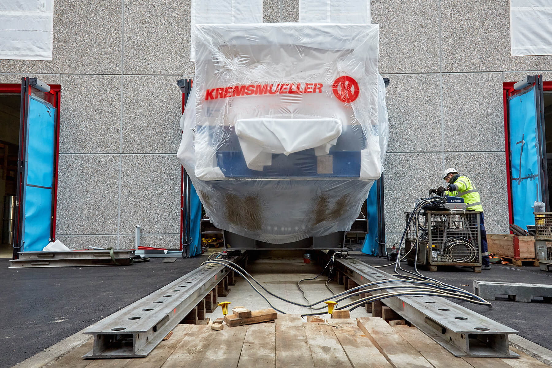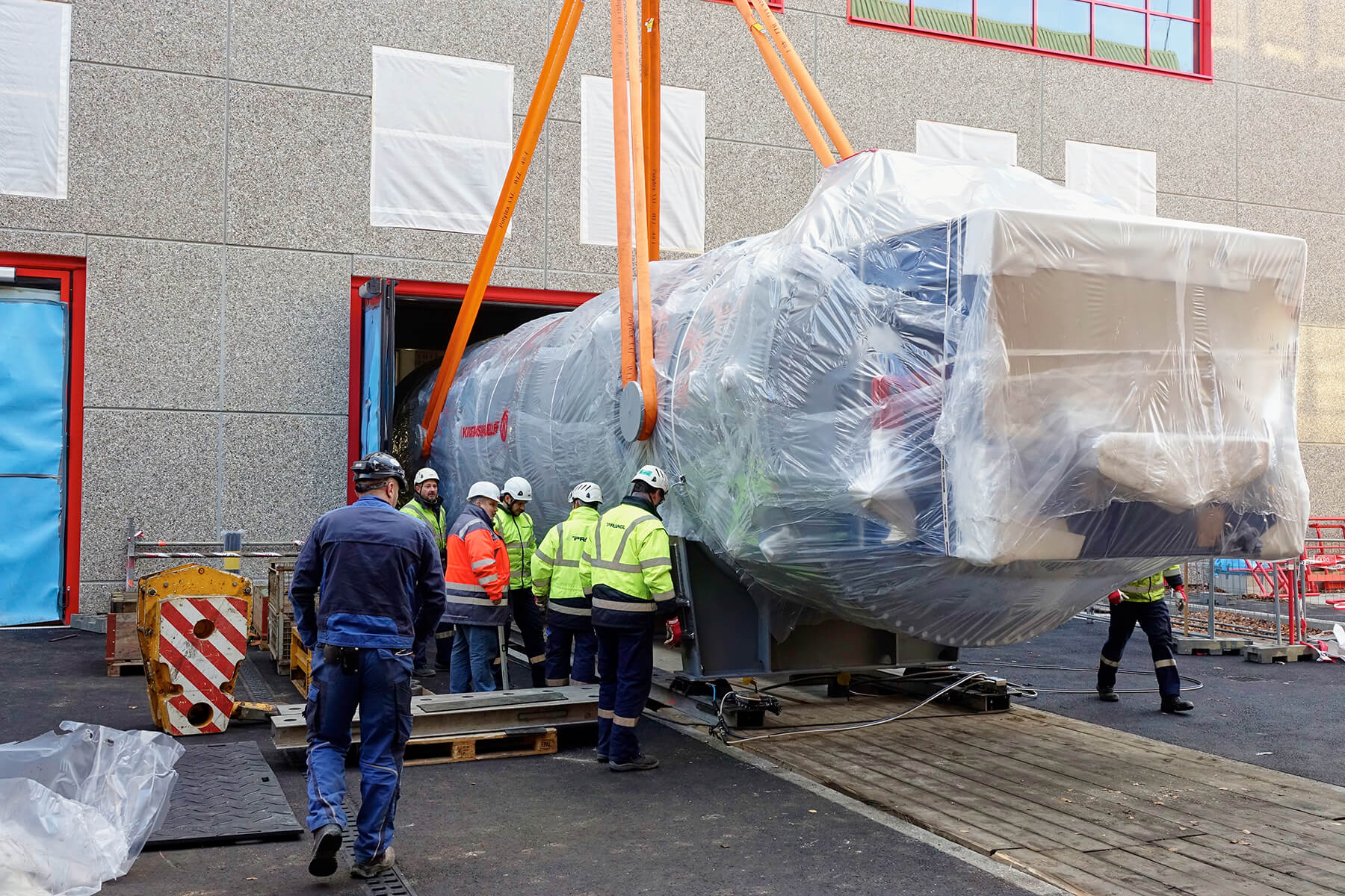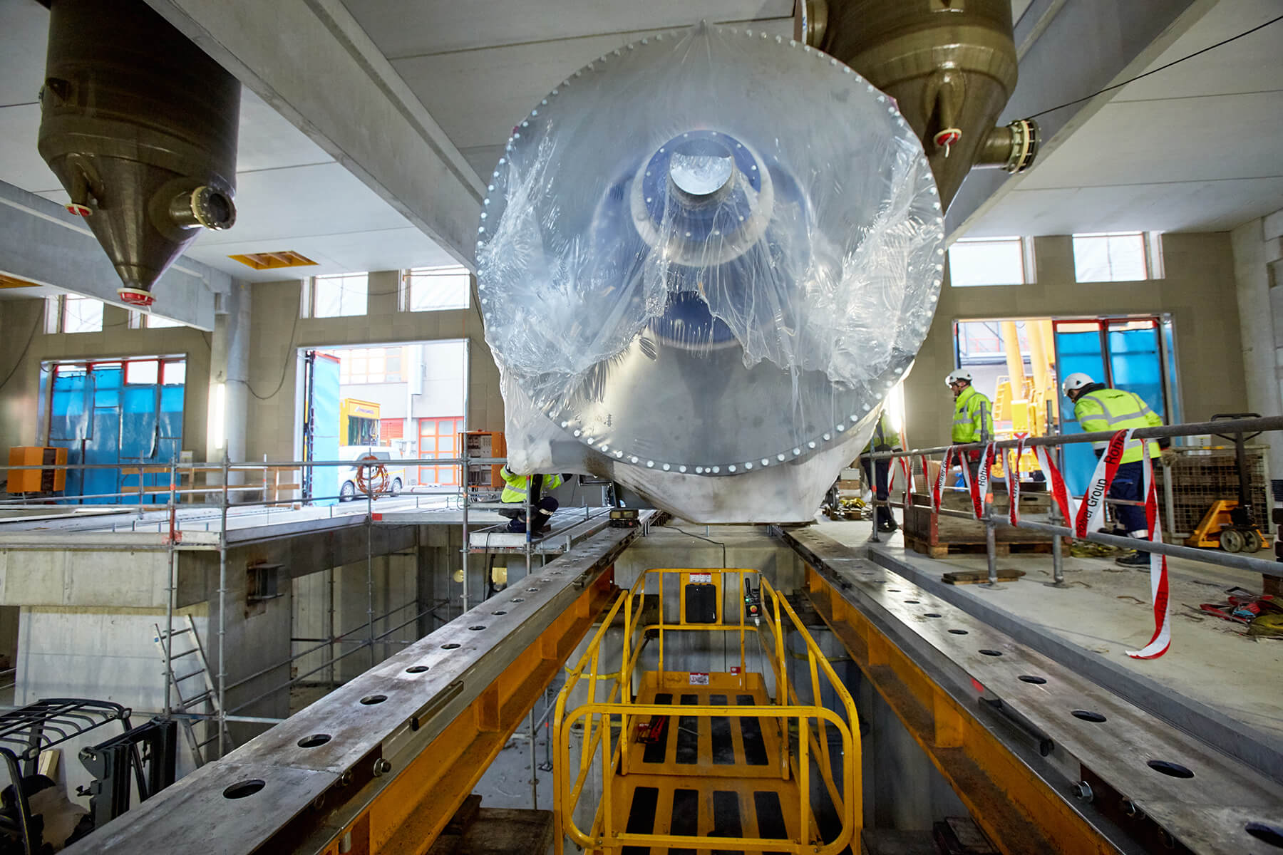 Wegen der engen Platzverhältnisse vor Ort mussten die überlangen Behälter mit einem 500 Tonnen Teleskopkran abgeladen werden. Nach einer kurzen Zwischenlagerung verhob der gelbe Riese den jeweiligen Trockner auf das Aufgleissystem PVSL 75. Nur mit diesem speziellen Schienensystem war es möglich, die Objekte in das gewünschte Gebäude einzubringen. Dank seiner kompakten Bauweise stellte auch die begrenze Einbringungshöhe kein Problem dar.