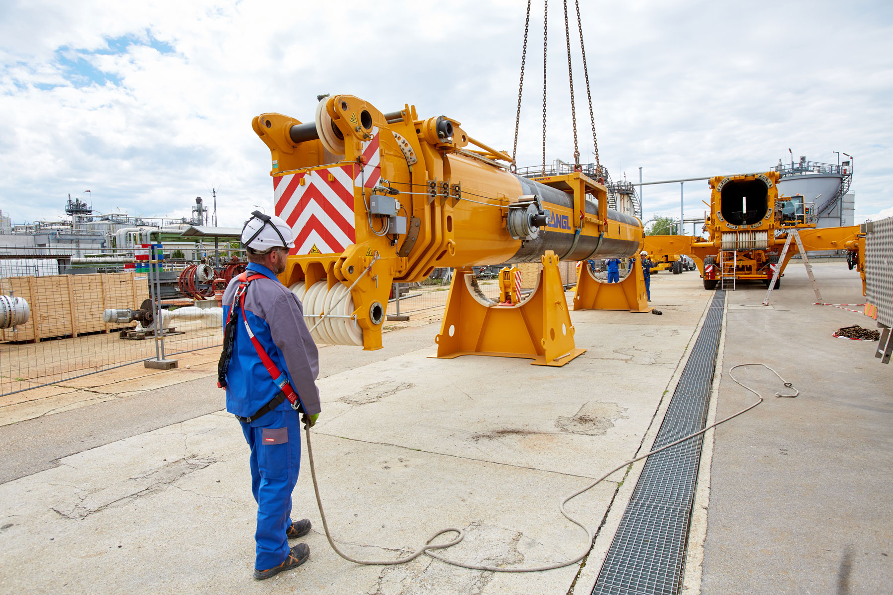 Der gelbe Gigant hatte eine Ausladung von 60 Meter in einer Höhe von 70 Meter mit einem Hubgewicht von 10 Tonnen zu bewältigen. Aufgrund des beengten Aufstellplatzes inmitten der produzierenden Anlagen und der Notwendigkeit, die Fahrstraße freizuhalten, hätte kein anderes Gerät eigesetzt werden können. Mit seinem geteilten und vor Ort zusammengesetzten Hauptausleger ist er die Spitze seiner Klasse. Alternativkonzepte hätten ein Aufrüsten oberhalb einer in Betrieb befindlichen Rohrleitung benötigt, was aus Sicherheitsgründen von der OMV abgelehnt wurde.