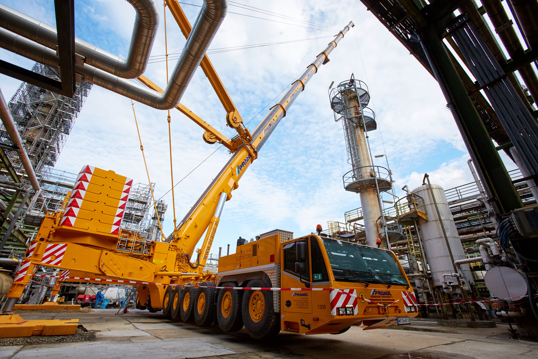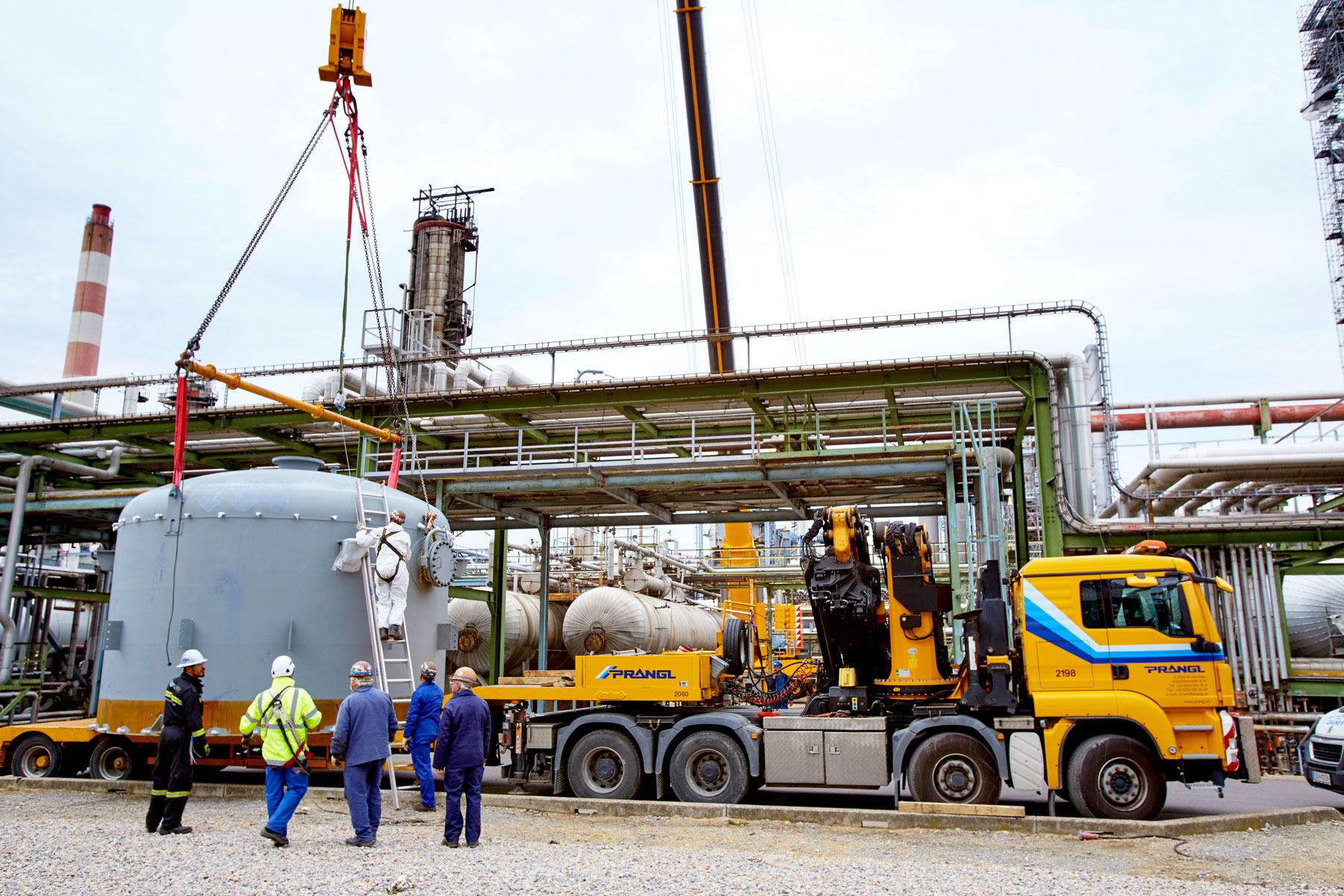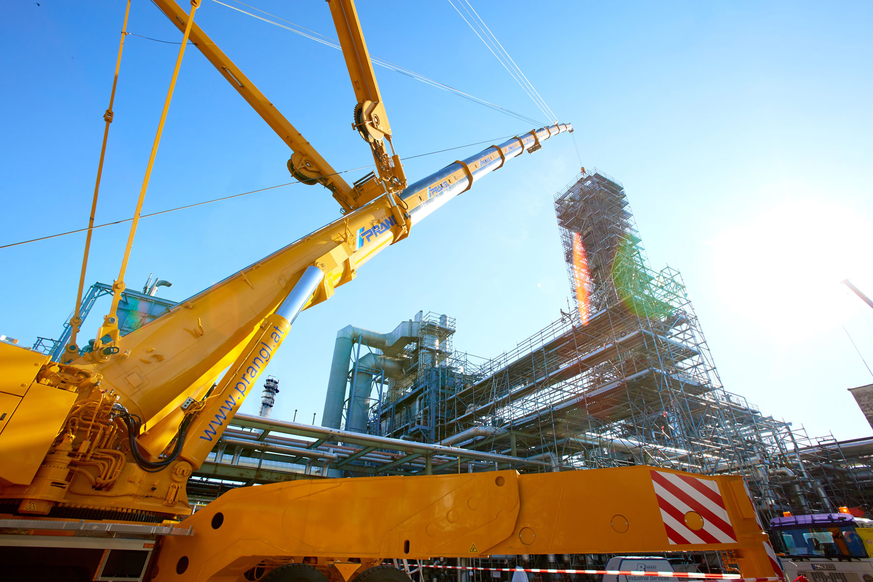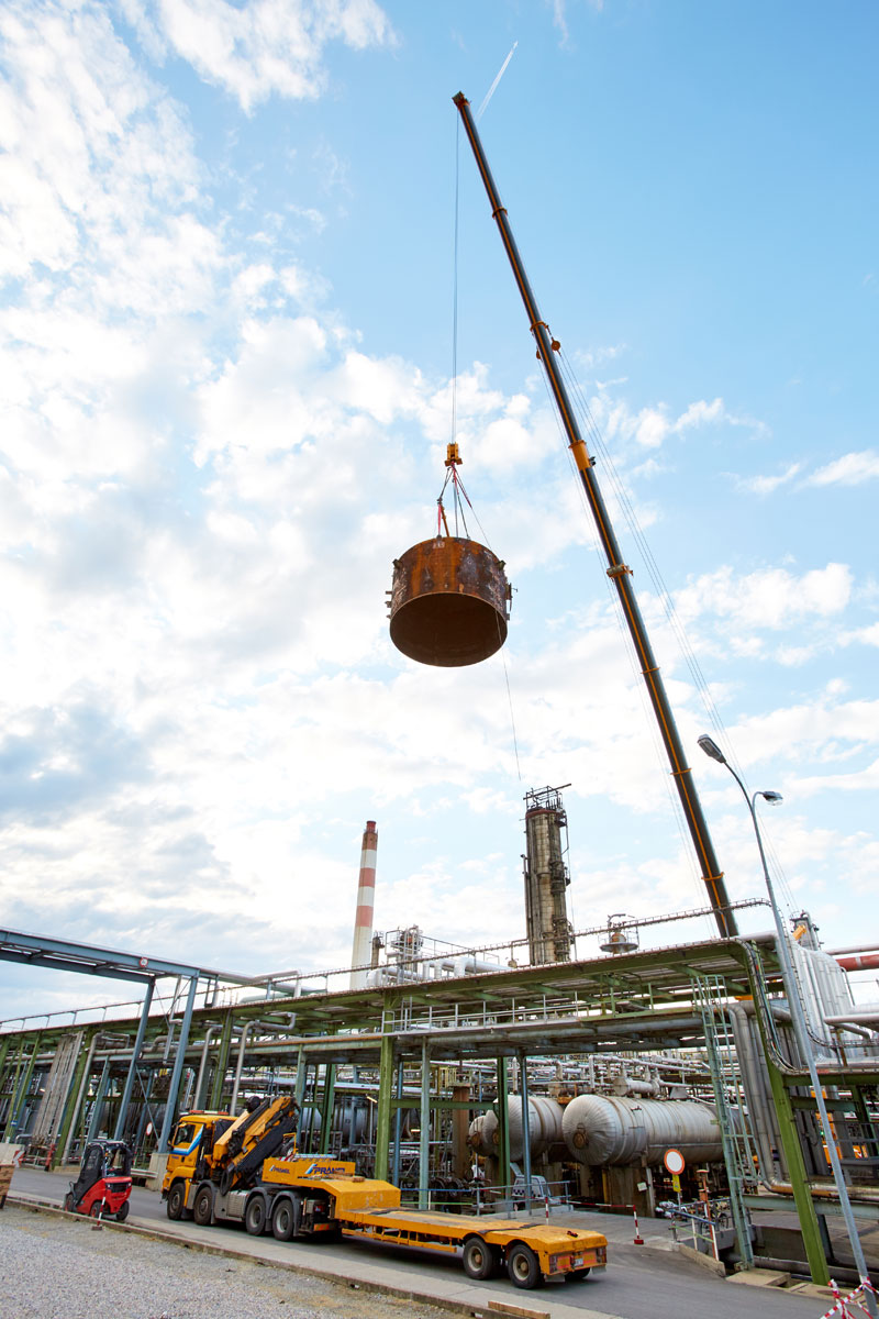 Auch bei Prangl war jeder Handgriff bis ins letzte Detail geplant, denn gearbeitet wurde auf engstem Raum und unter großem Zeitdruck. Genauso akribisch wurden auch die Geräte für den Groß-Auftrag gewählt: Die Spezialisten von Prangl waren mit 45 Teleskopkranen, 11 Ladekranen, 25 Hub- und Teleskopstaplern, drei Zugmaschinen und einer 50 Meter LKW-Arbeitsbühne vor Ort. Herzstück des gesamten Turnarounds 2017 war mit Sicherheit der gelbe 1 000 Tonnen Teleskopkran, der stärkste Österreichs. Er kam beim Tausch des Kolonenkopfes in der Anlage “HDS 3 Splitter“ wegen seiner unvergleichlichen seitlichen Reichweite zum Einsatz.