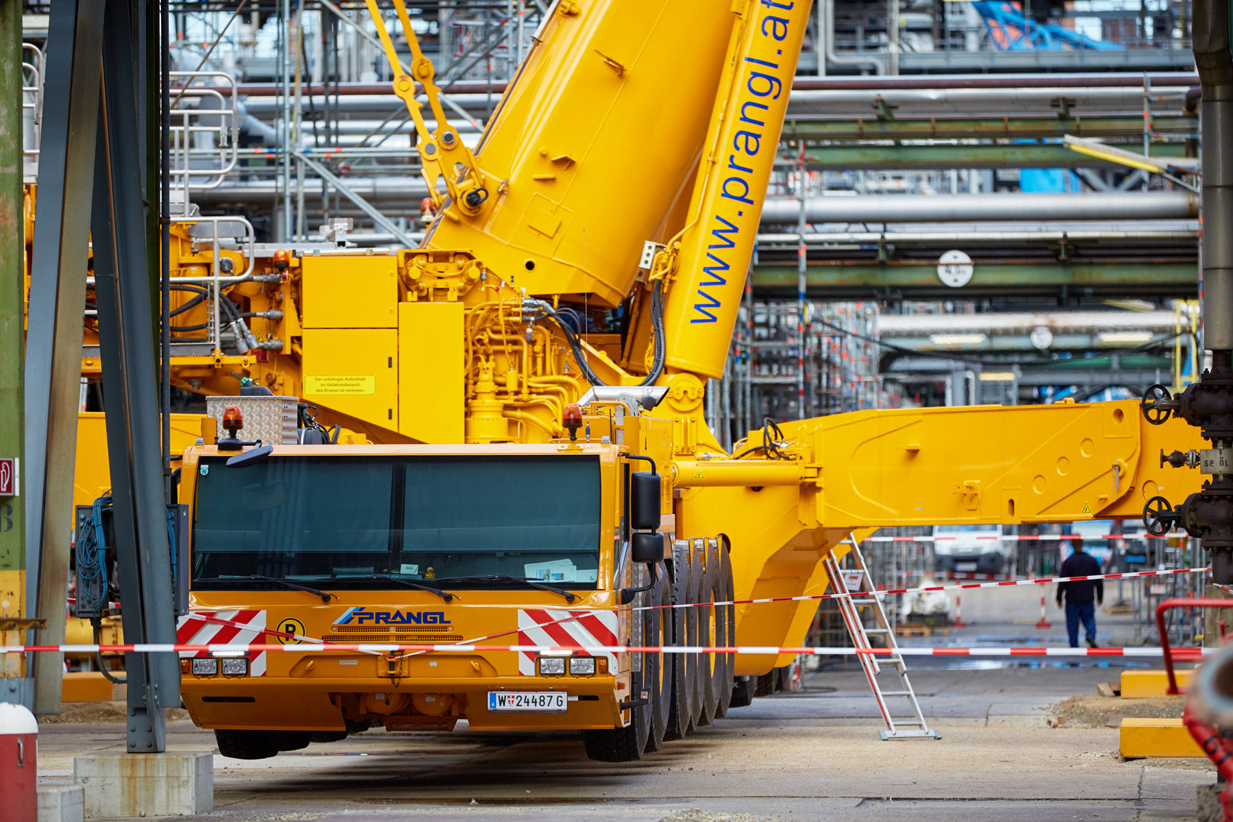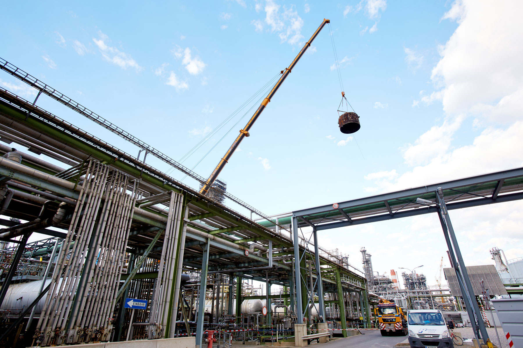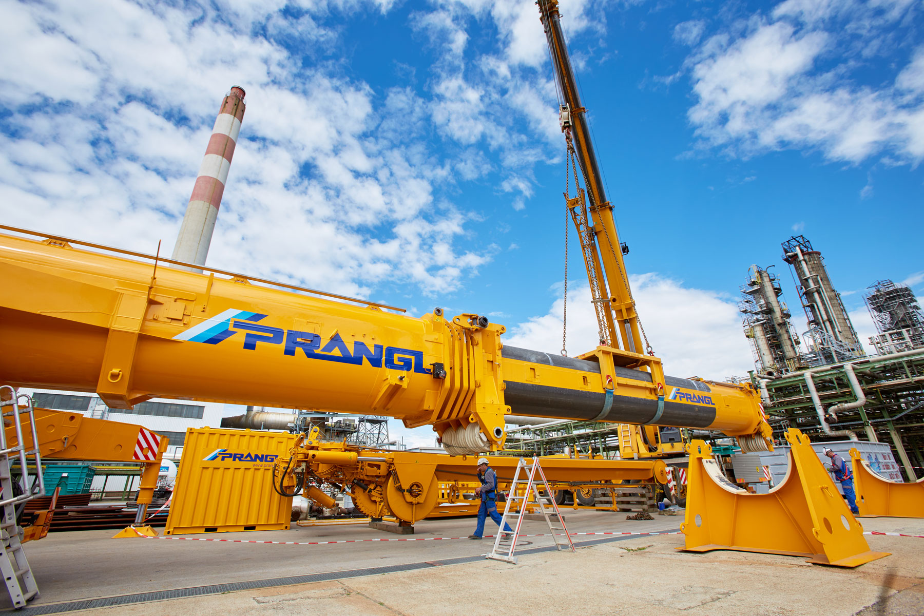 Auch bei Prangl war jeder Handgriff bis ins letzte Detail geplant, denn gearbeitet wurde auf engstem Raum und unter großem Zeitdruck. Genauso akribisch wurden auch die Geräte für den Groß-Auftrag gewählt: Die Spezialisten von Prangl waren mit 45 Teleskopkranen, 11 Ladekranen, 25 Hub- und Teleskopstaplern, drei Zugmaschinen und einer 50 Meter LKW-Arbeitsbühne vor Ort. Herzstück des gesamten Turnarounds 2017 war mit Sicherheit der gelbe 1 000 Tonnen Teleskopkran, der stärkste Österreichs. Er kam beim Tausch des Kolonenkopfes in der Anlage “HDS 3 Splitter“ wegen seiner unvergleichlichen seitlichen Reichweite zum Einsatz.