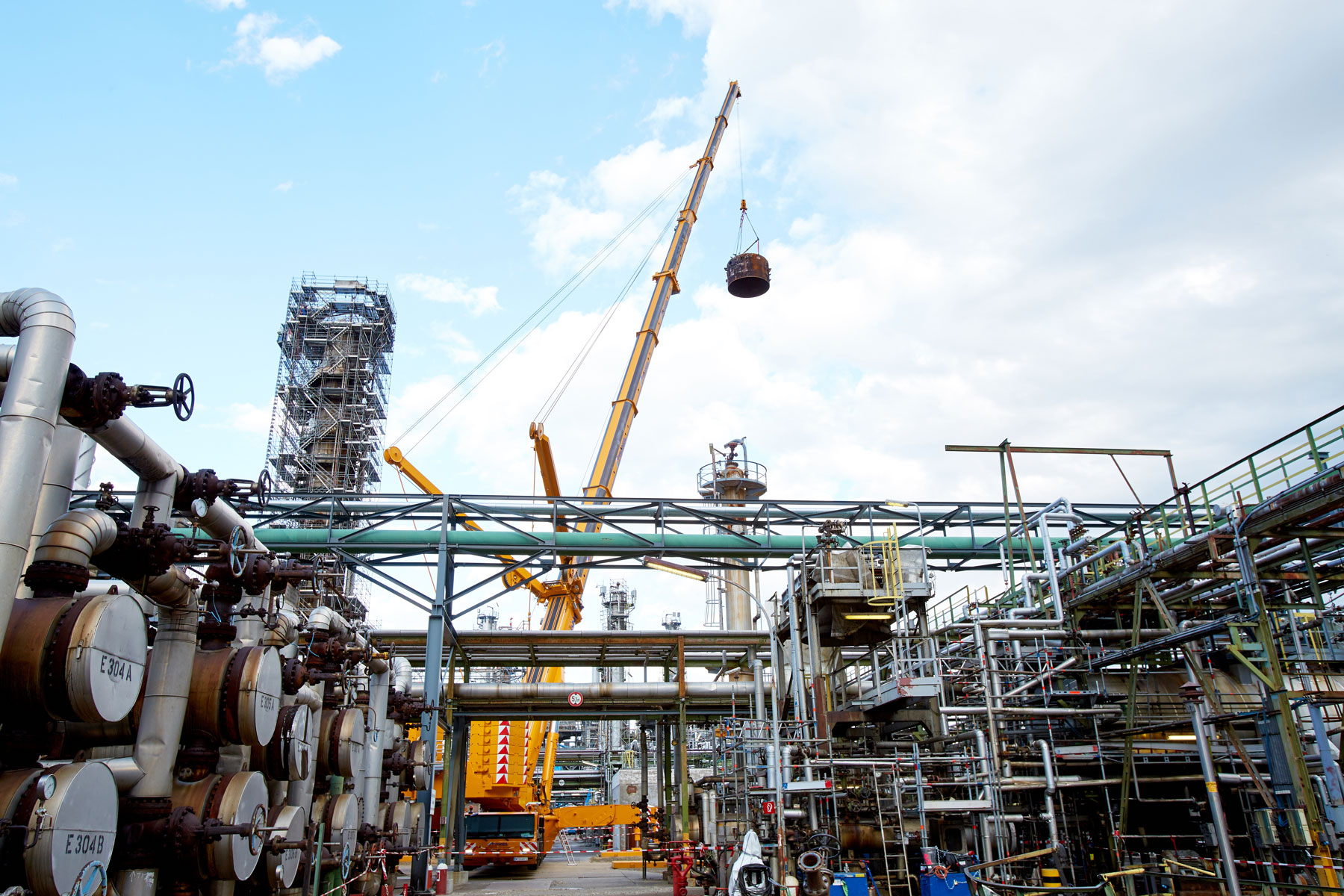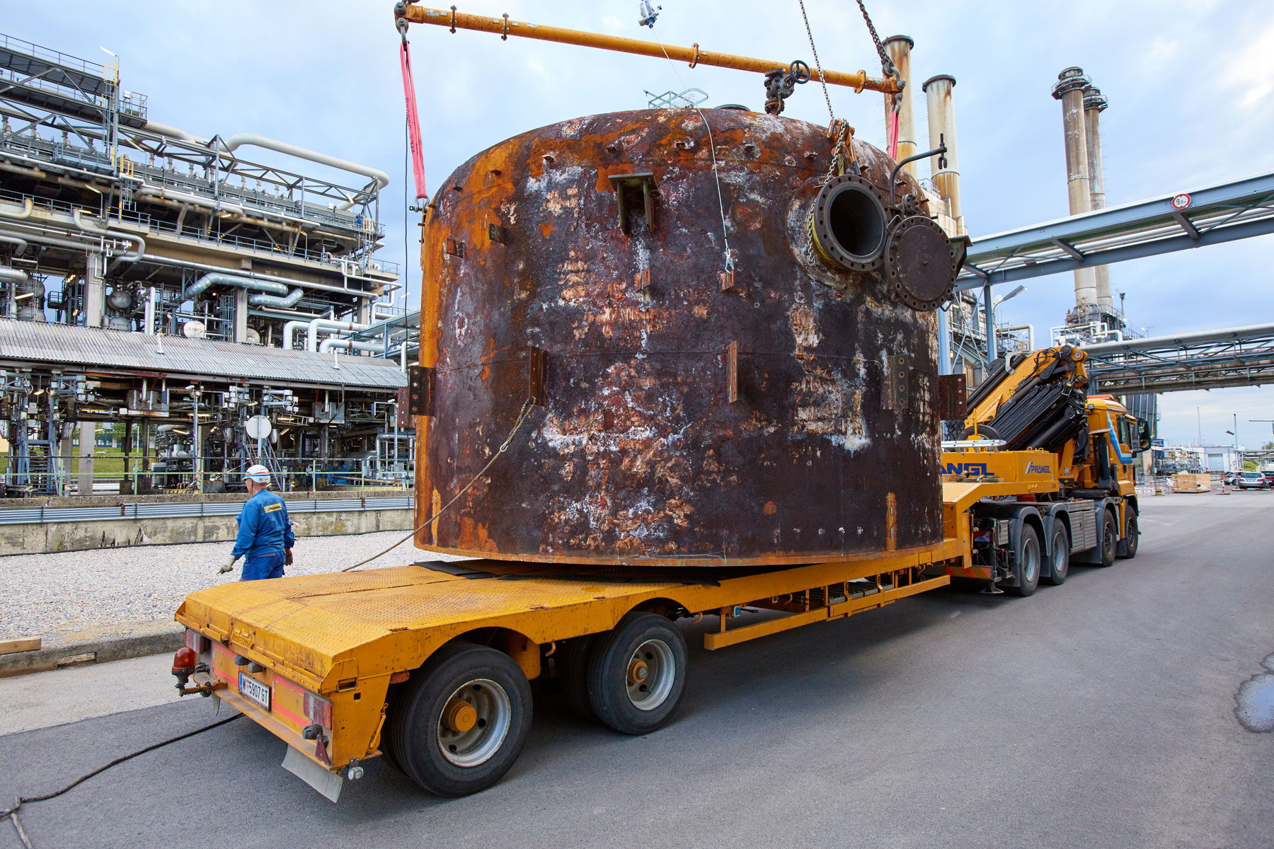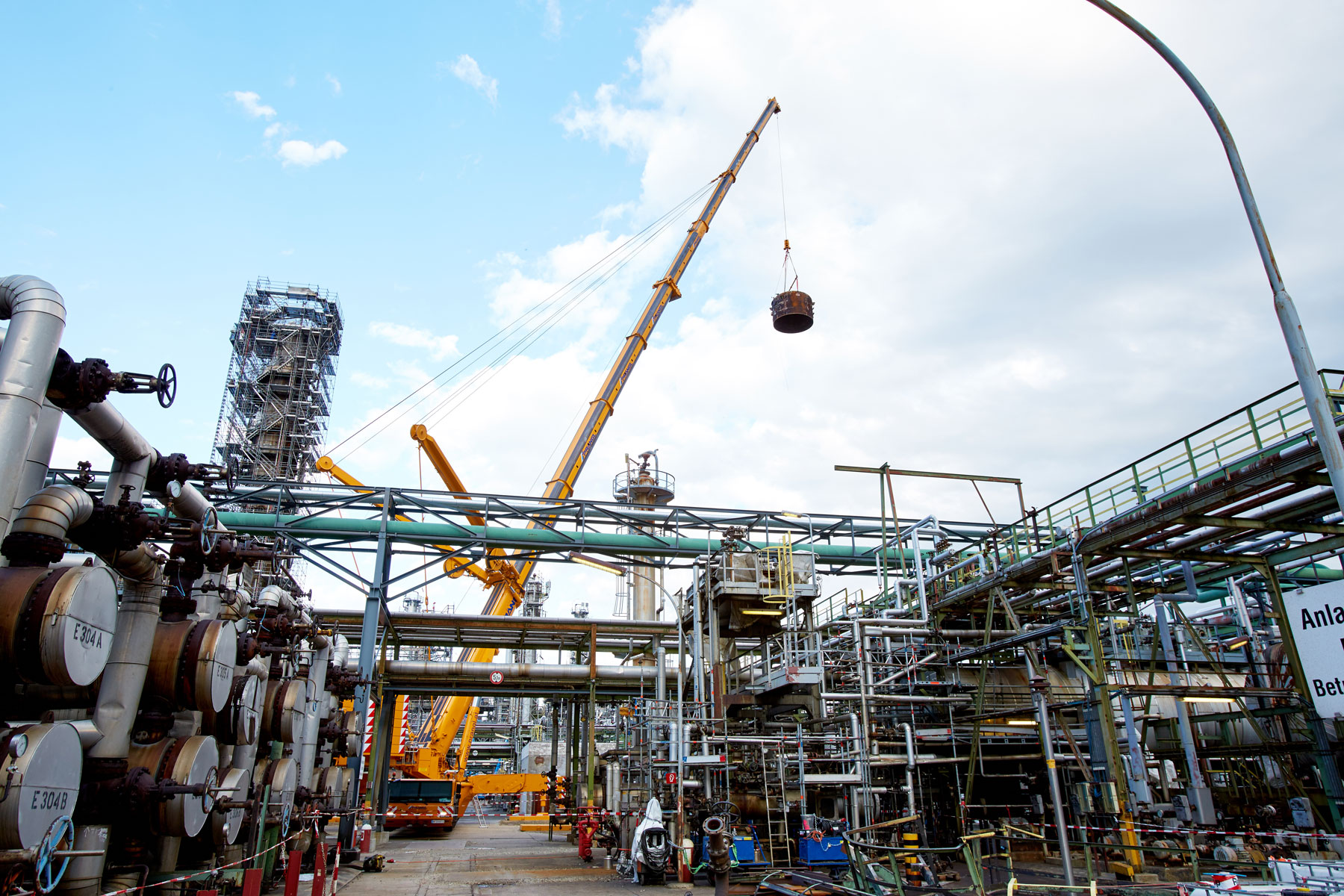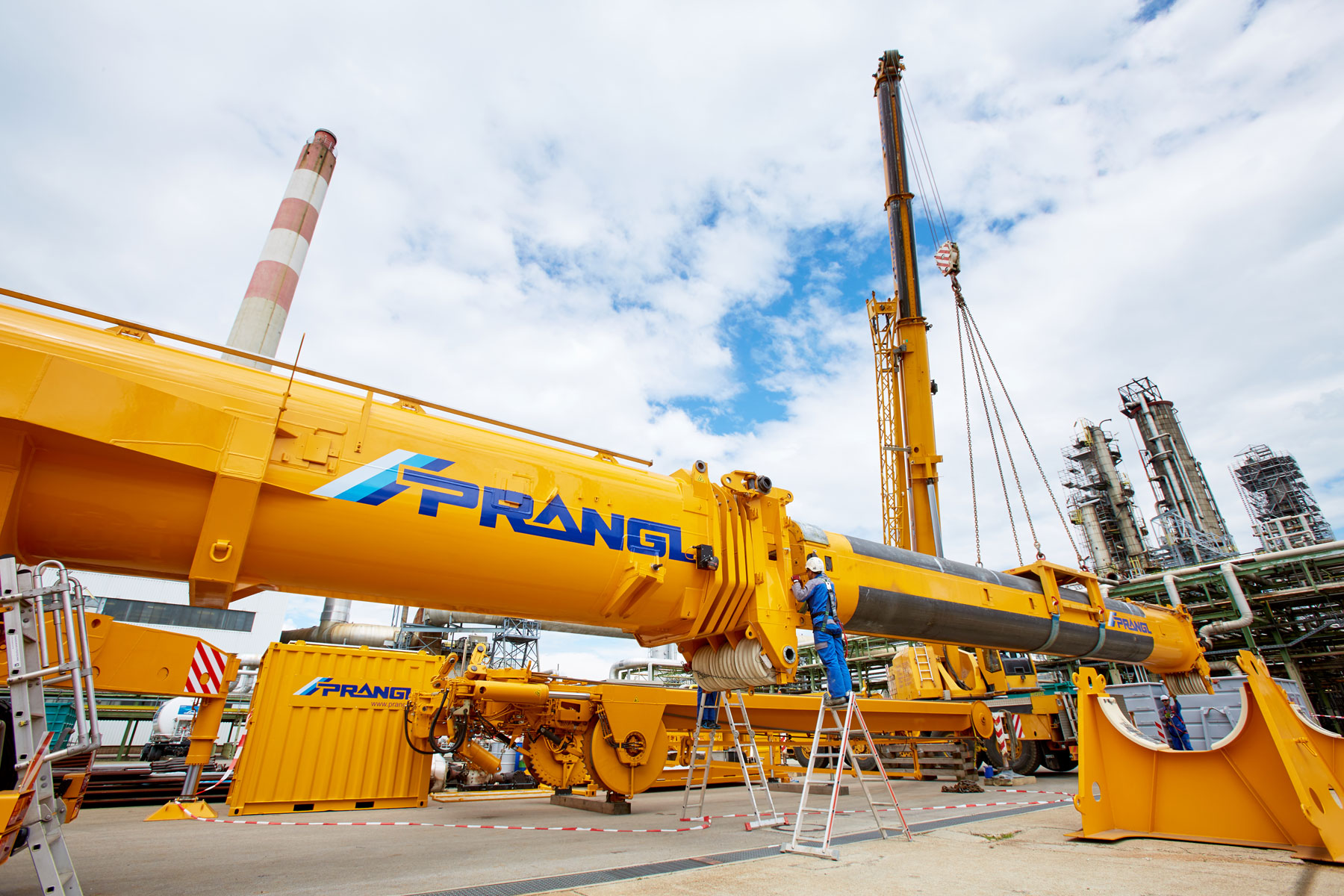 Auch bei Prangl war jeder Handgriff bis ins letzte Detail geplant, denn gearbeitet wurde auf engstem Raum und unter großem Zeitdruck. Genauso akribisch wurden auch die Geräte für den Groß-Auftrag gewählt: Die Spezialisten von Prangl waren mit 45 Teleskopkranen, 11 Ladekranen, 25 Hub- und Teleskopstaplern, drei Zugmaschinen und einer 50 Meter LKW-Arbeitsbühne vor Ort. Herzstück des gesamten Turnarounds 2017 war mit Sicherheit der gelbe 1 000 Tonnen Teleskopkran, der stärkste Österreichs. Er kam beim Tausch des Kolonenkopfes in der Anlage “HDS 3 Splitter“ wegen seiner unvergleichlichen seitlichen Reichweite zum Einsatz.