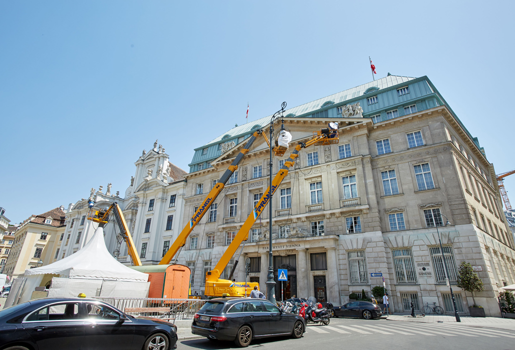 Vor der wunderschönen Kulisse des Park Hyatt Wien wurden drei Teleskop-Arbeitsbühnen mit 43 Meter Arbeitshöhe aufgebaut. Auf Ihnen wurden die Scheinwerfer für die Dreharbeiten angebracht. Jede der Maschinen bringt ein Eigengewicht von 20,0 Tonnen auf die Waage. Aufgrund ihrer hohen Tragfähigkeiten (450 Kilogramm pro Arbeitskorb) und der enormen Arbeitshöhe waren die drei gelben Giganten genau das richtige Equipment für diesen Job.