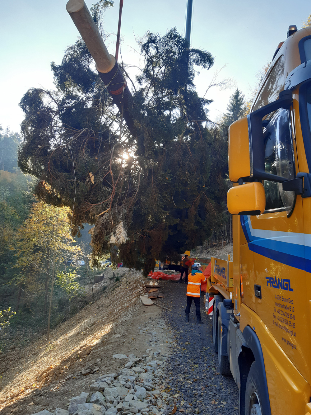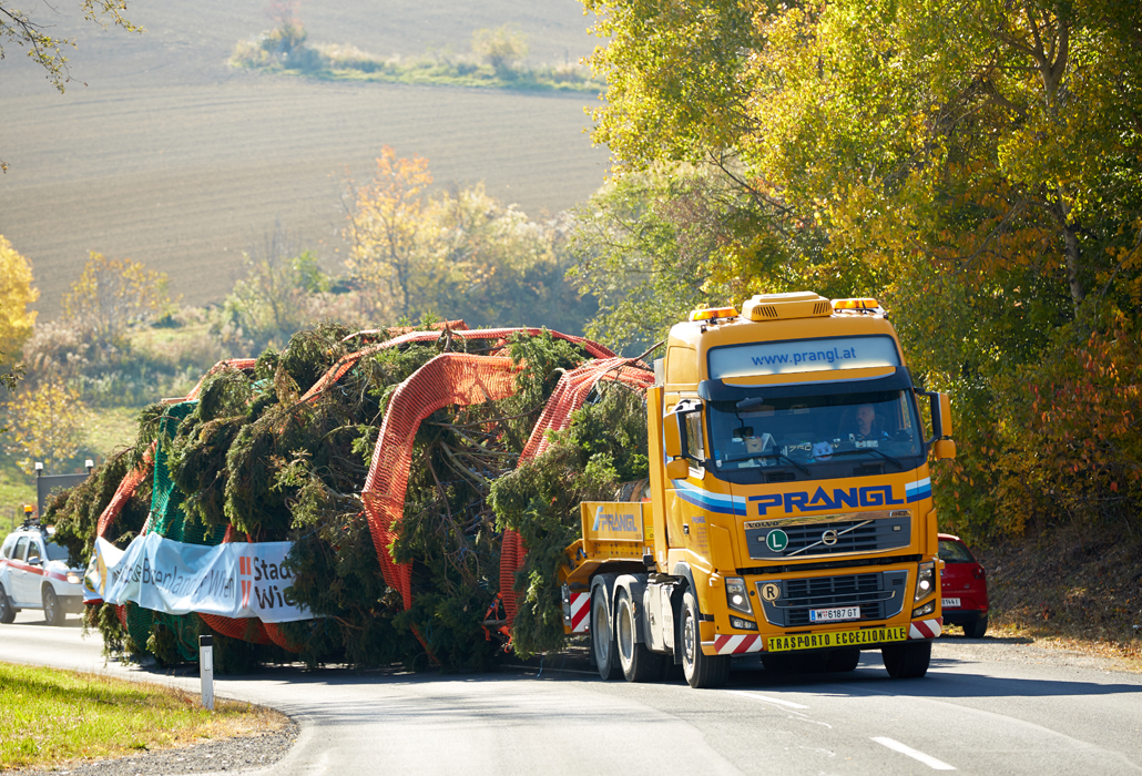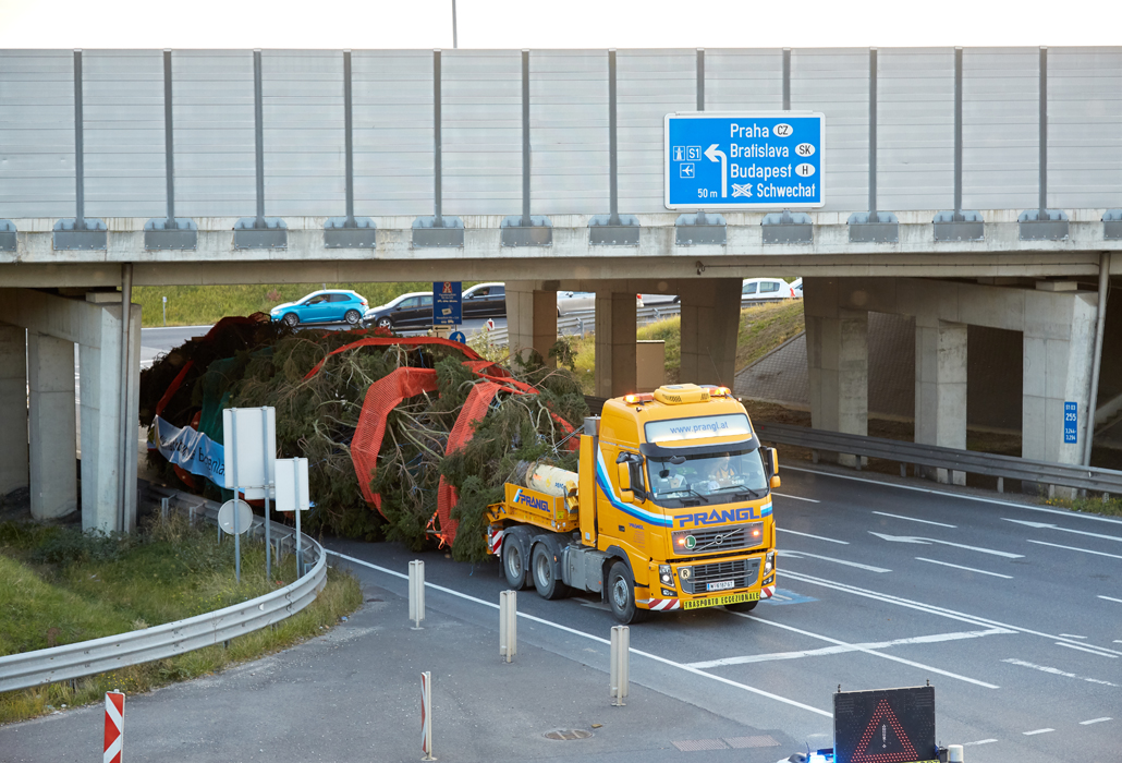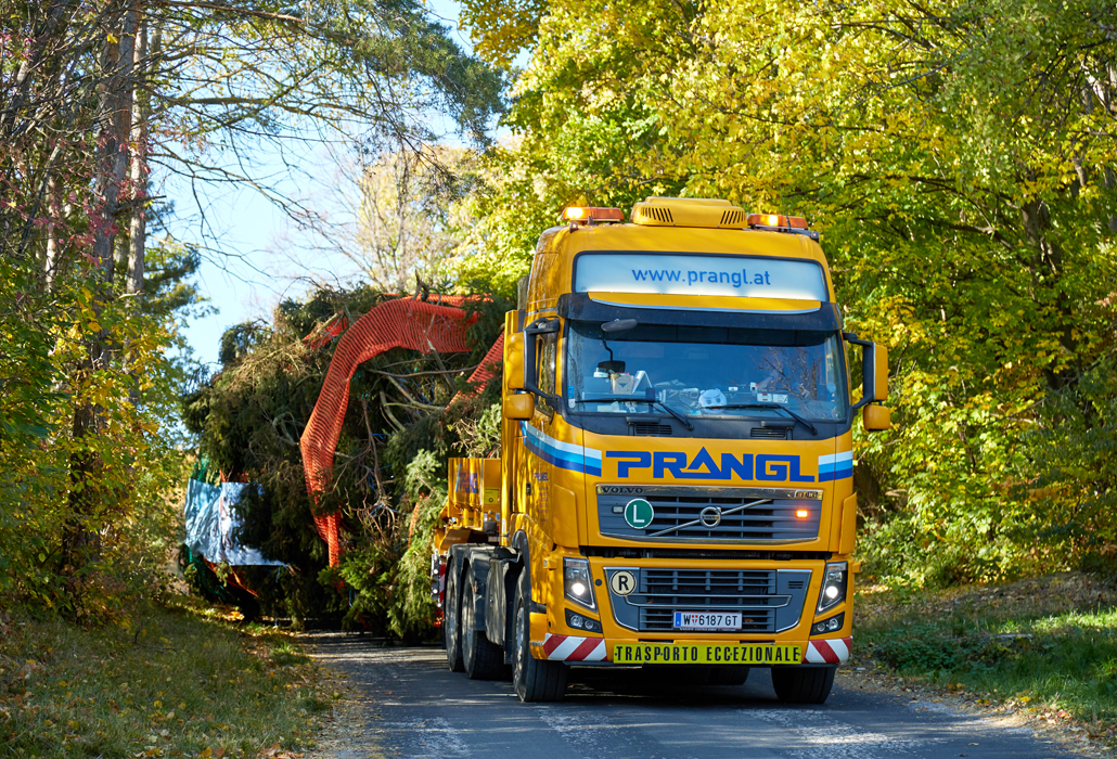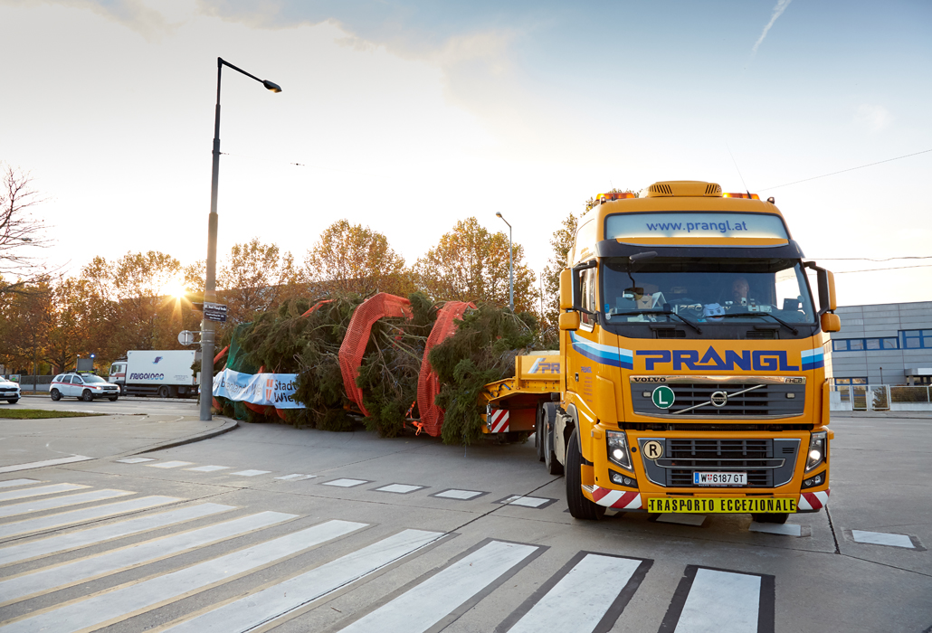 Die Platzverhältnisse am Ursprungsort machten zwei Mobilkrane notwendig, waren doch die Forststraßen als auch der Kranstellplatz so beengt, dass man mit größerem Equipment nicht ausrücken konnte. Mit einer 3-Achs-Zugmaschine und einem teleskopierbaren Semi-Tieflader wurde der 5,5 Meter breite und ca. 10 Tonnen schwere Christbaum auf die Reise geschickt. Doch damit nicht genug: Es musste auch eine geschützte Zwischenlagerfläche gefunden werden. Diese fand man schlussendlich in der neuen Prangl-Zentrale in Wien Liesing vor.
