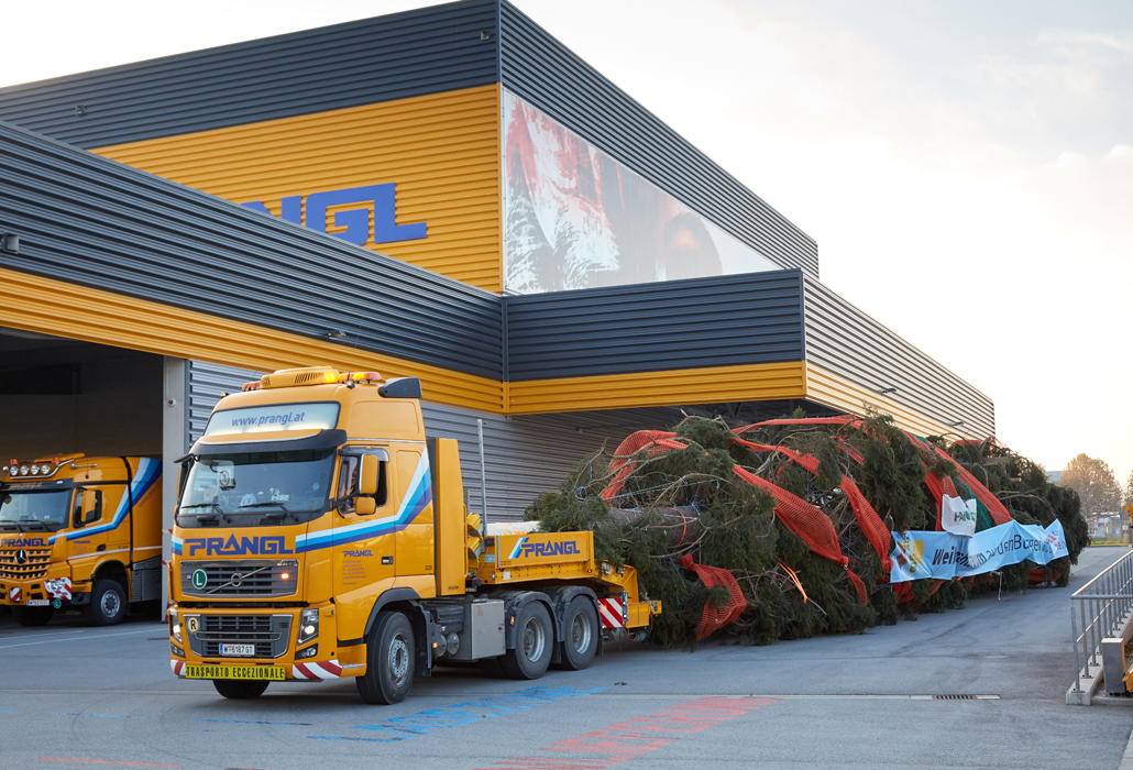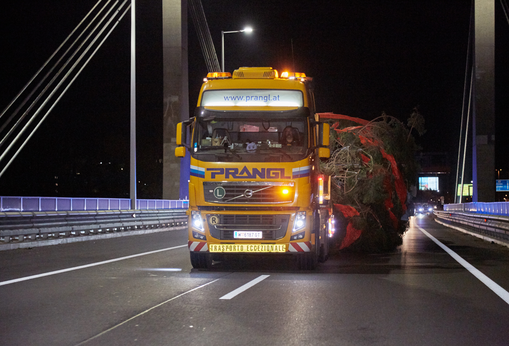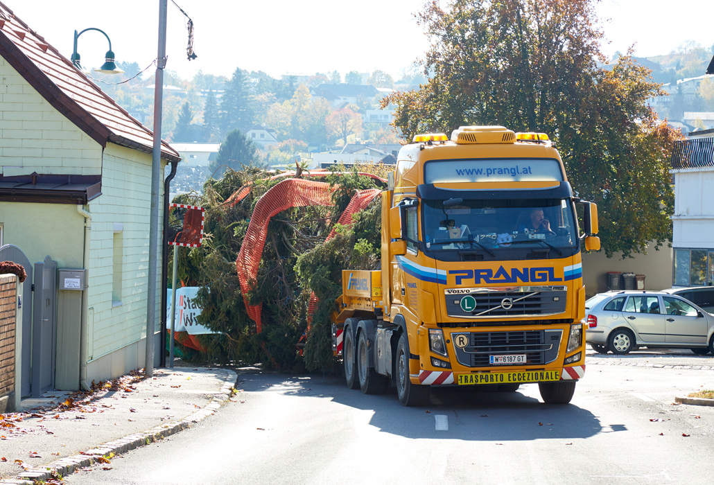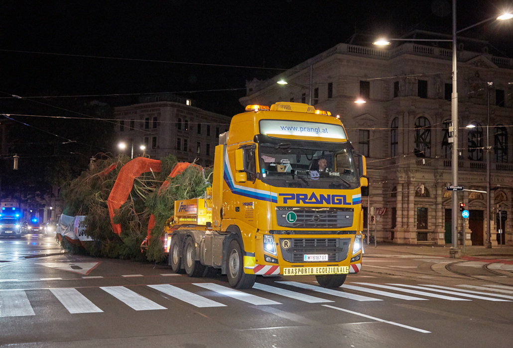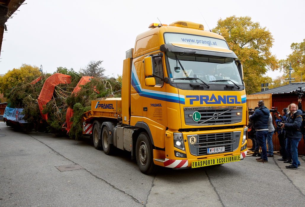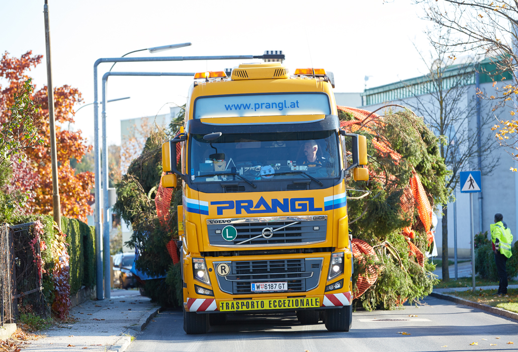 Die Platzverhältnisse am Ursprungsort machten zwei Mobilkrane notwendig, waren doch die Forststraßen als auch der Kranstellplatz so beengt, dass man mit größerem Equipment nicht ausrücken konnte. Mit einer 3-Achs-Zugmaschine und einem teleskopierbaren Semi-Tieflader wurde der 5,5 Meter breite und ca. 10 Tonnen schwere Christbaum auf die Reise geschickt. Doch damit nicht genug: Es musste auch eine geschützte Zwischenlagerfläche gefunden werden. Diese fand man schlussendlich in der neuen Prangl-Zentrale in Wien Liesing vor.