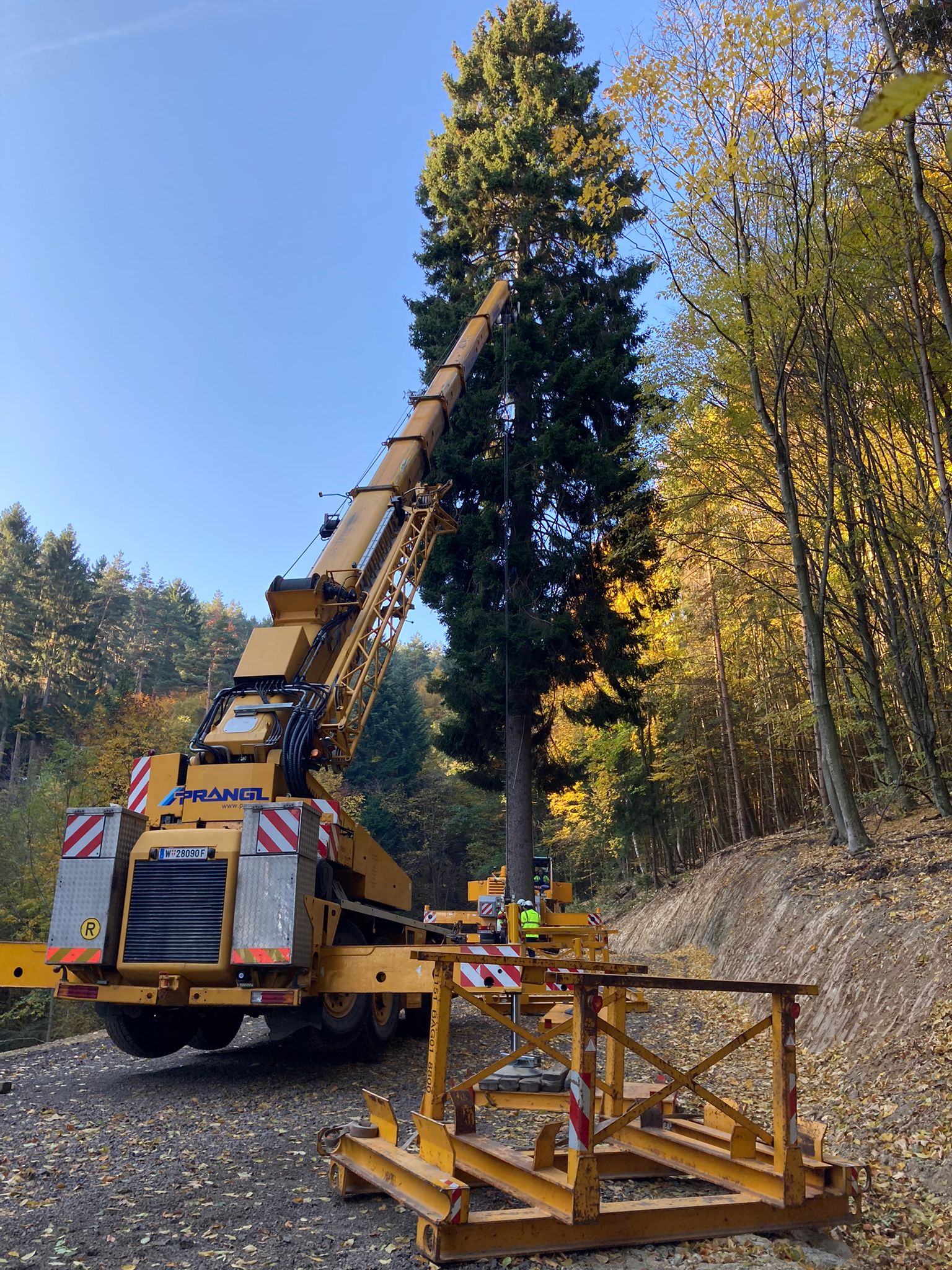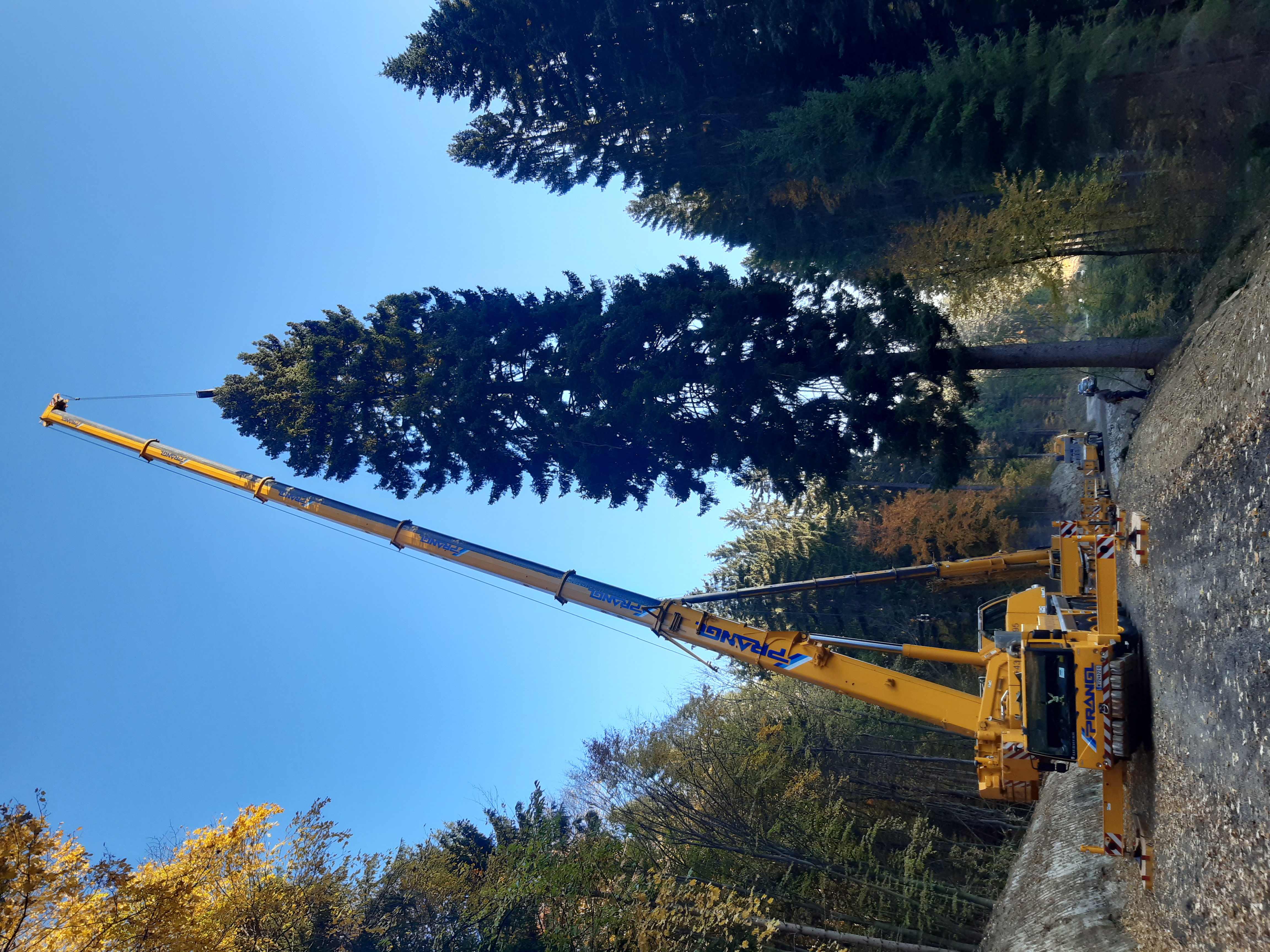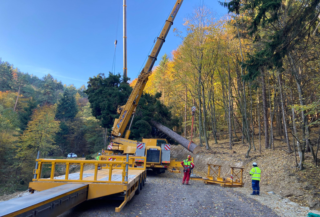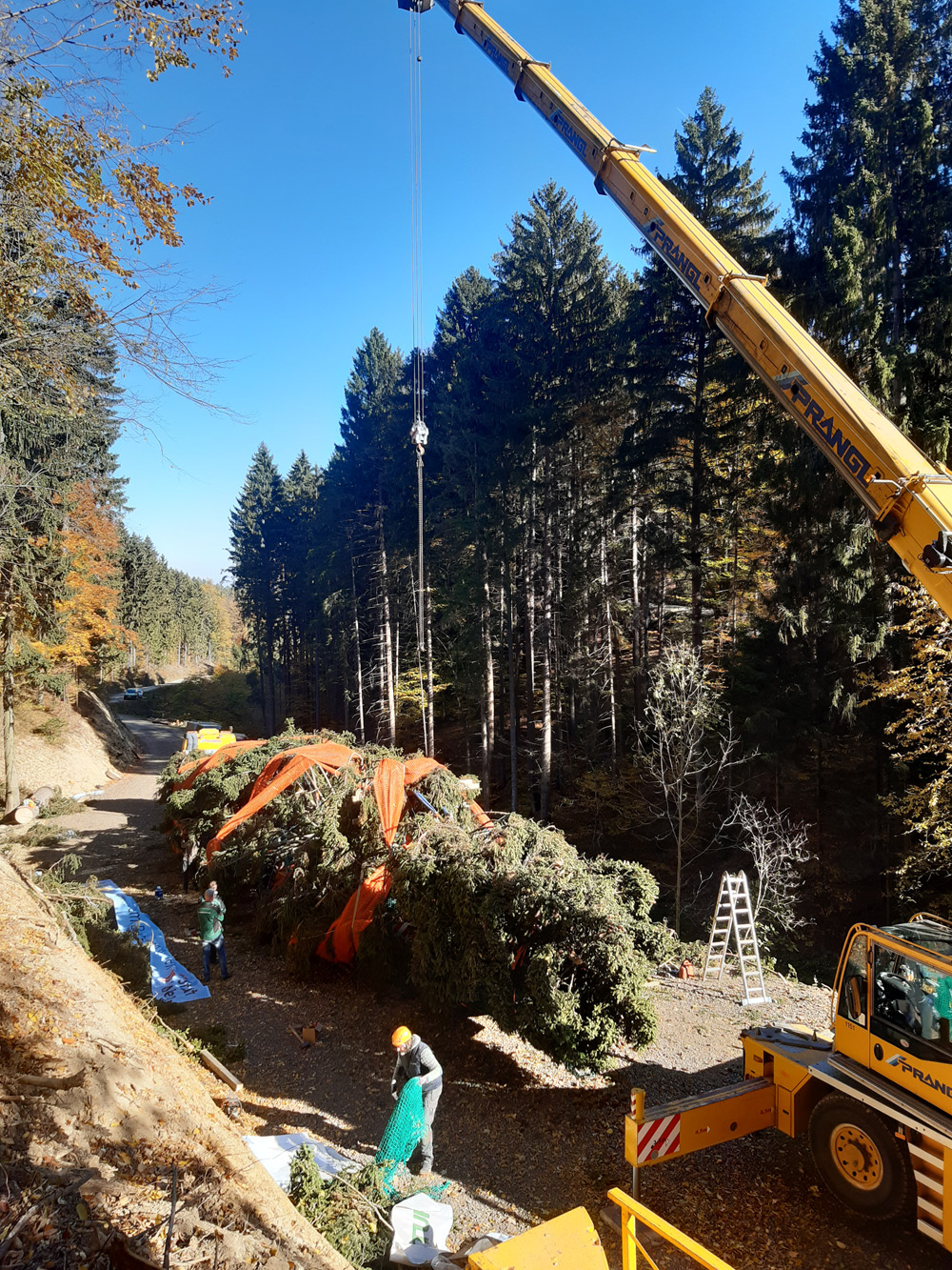 Die Platzverhältnisse am Ursprungsort machten zwei Mobilkrane notwendig, waren doch die Forststraßen als auch der Kranstellplatz so beengt, dass man mit größerem Equipment nicht ausrücken konnte. Mit einer 3-Achs-Zugmaschine und einem teleskopierbaren Semi-Tieflader wurde der 5,5 Meter breite und ca. 10 Tonnen schwere Christbaum auf die Reise geschickt. Doch damit nicht genug: Es musste auch eine geschützte Zwischenlagerfläche gefunden werden. Diese fand man schlussendlich in der neuen Prangl-Zentrale in Wien Liesing vor.
