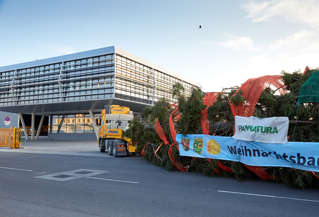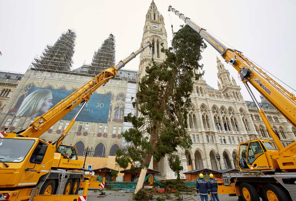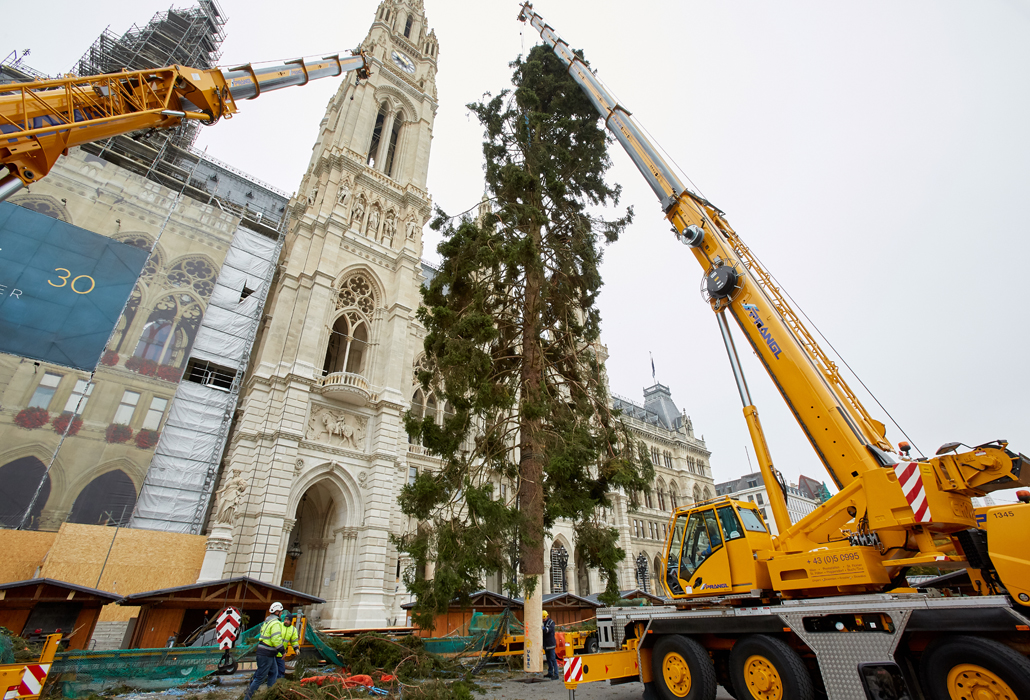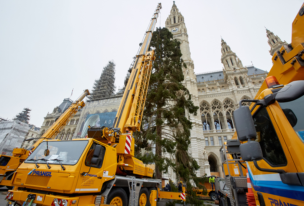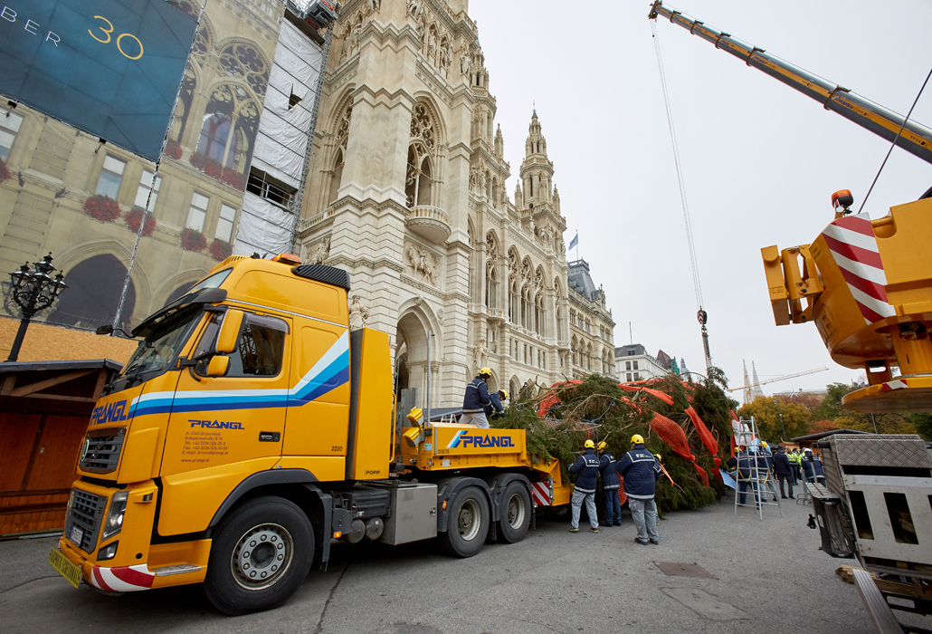 Nach einer Nacht und einem Tag am "gelben" Firmengelände wurde die Fichte schlussendlich nächtens zum Wiener Rathausplatz geführt. In der Früh startete dann der letzte Akt auf dieser Reise: das Aufrichten der stolzen Fichte. Auch in der Bundeshauptstadt waren zwei Mobilkrane von Nöten. In einem Tandemhub drehten und positionierten zwei 60 Tonnen Teleskopkräne den Christbaum millimetergenau in die dafür vorgesehene Bodenöffnung. Dieses vorweihnachtliche Spektakel bewies einmal mehr, wie reibungslos Logistikprojekte funktionieren können, wenn man vom Prangl-Konzept des "One Stop Shoppings" Gebrauch macht.