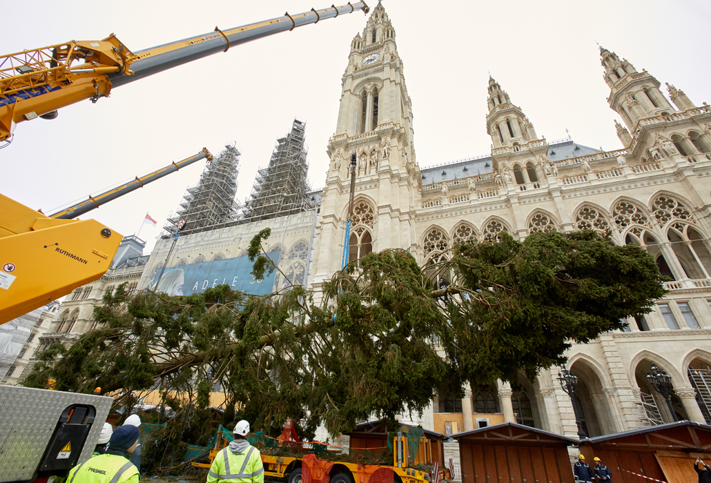 Der diesjährige Christbaum stammt aus dem Bezirk Mattersburg. "Der Wiener Weihnachtsbaum ist seit jeher ein Zeichen des Miteinanders und des Zusammenhalts. Dieses Jahr symbolisiert er auch anlässlich des Jubiläums 100 Jahre Burgenland die Zugehörigkeit des 'jüngsten Bundeslandes' zu Österreich", betonte Wiens Bürgermeister Ludwig bei der Ankunft des Baumes. Bevor die Fichte jedoch ihre Reise antreten konnte, musste sie in einem Wald in der Gemeinde Wiesen gefällt und von einem 100 Tonnen Teleskop- und einem 55 Tonnen Spezialkran von Prangl auf einen Sondertransporter verladen werden.