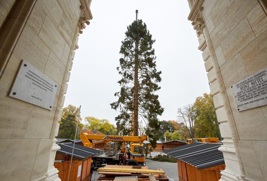Die 130 Jahre alte und 30 Meter hohe Fichte wurde am 13.11.2021 feierlich illuminiert. Seit 1959 ist es Tradition, dass Wiens wichtigster Weihnachtsbaum alljährlich aus einem anderen Bundesland stammt. Ebenso ist es auch fast schon Usus, dass Prangl den Christbaum aufstellt.