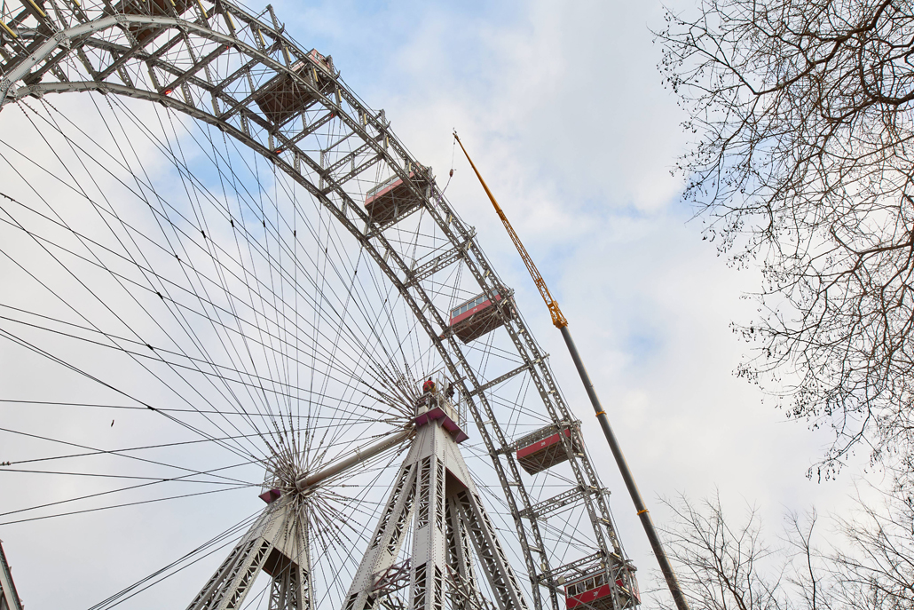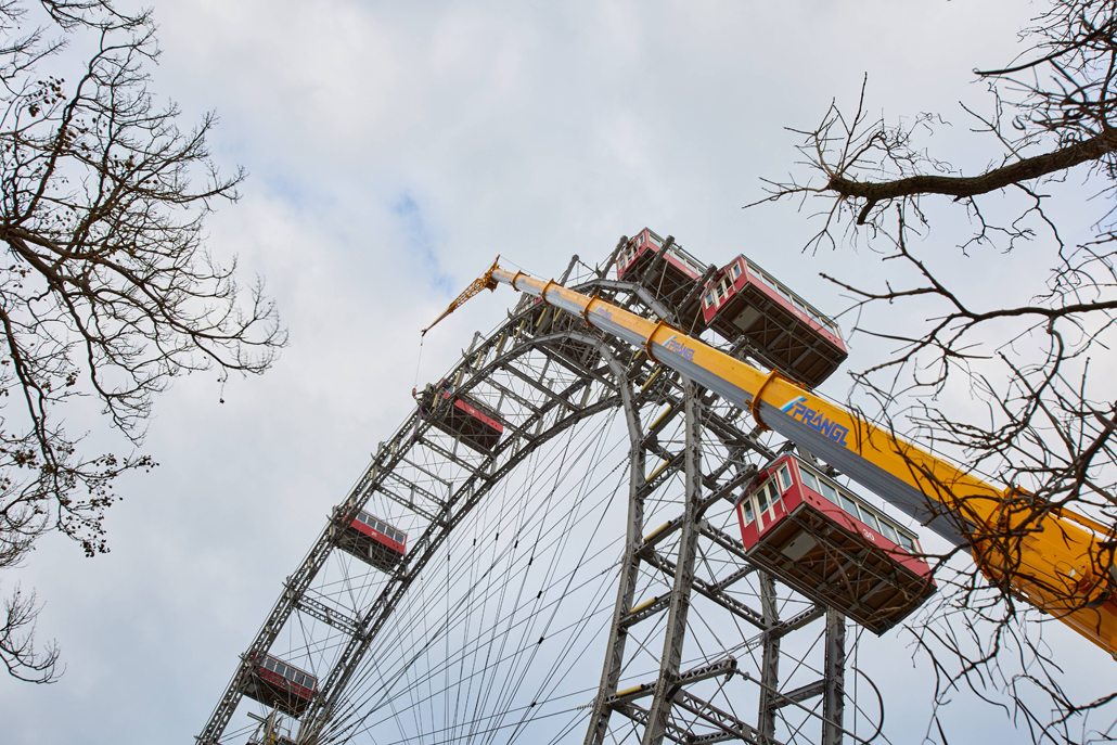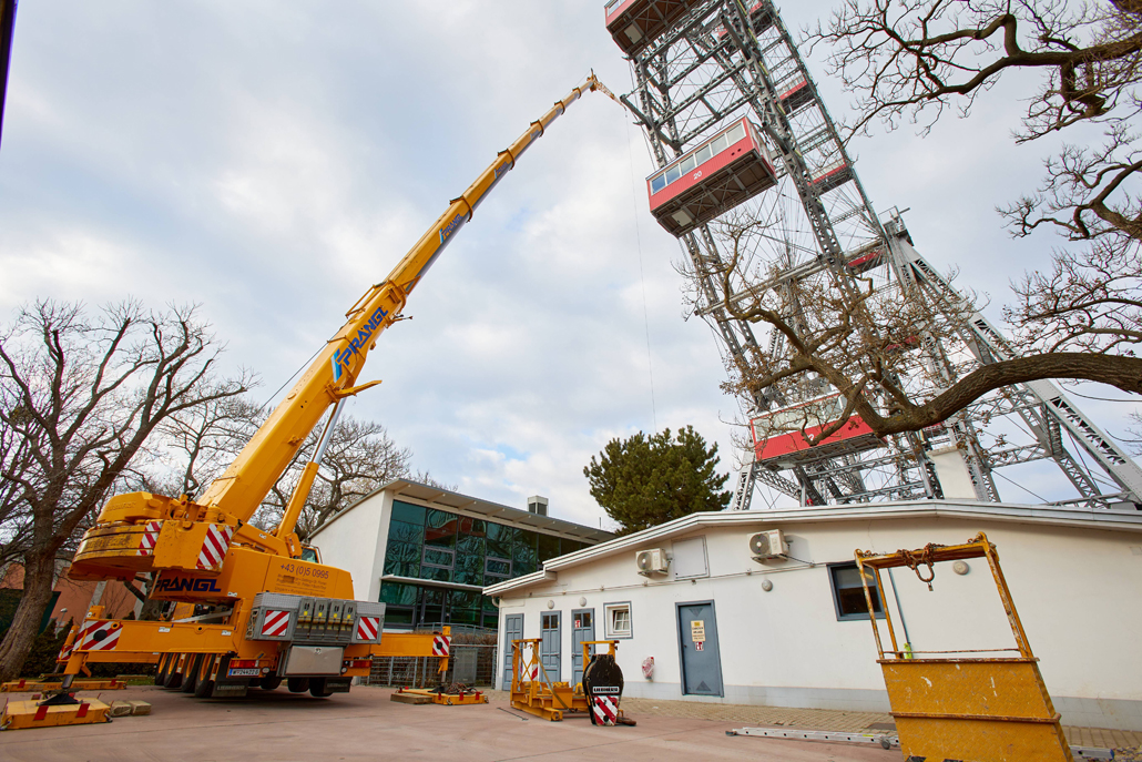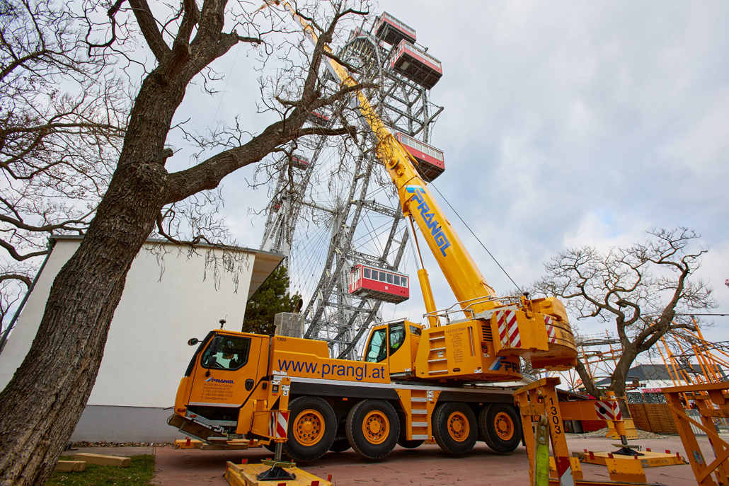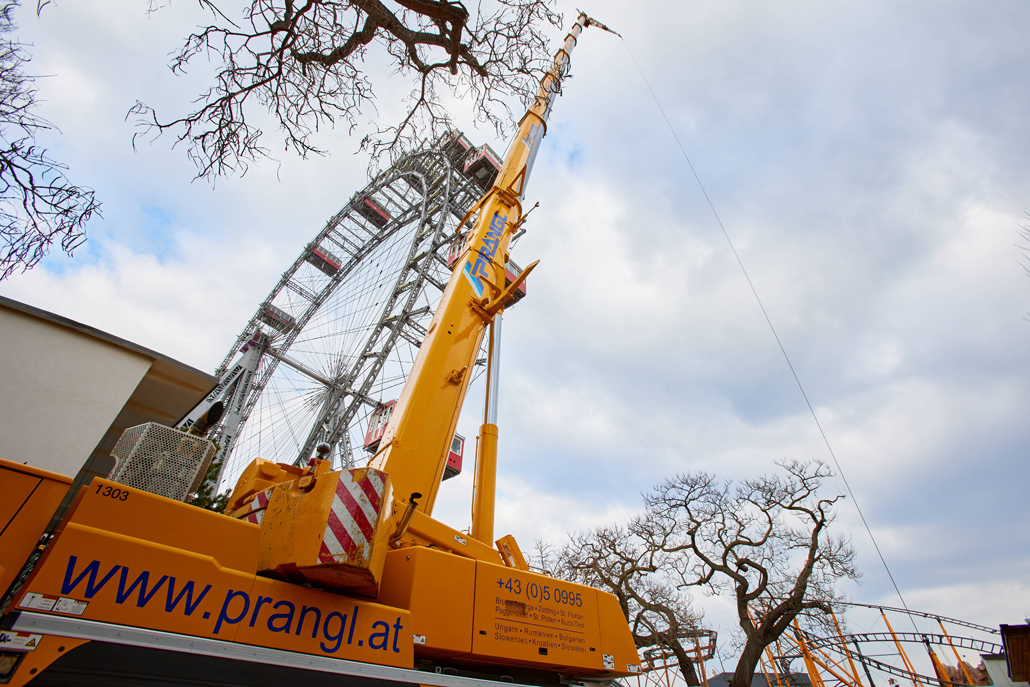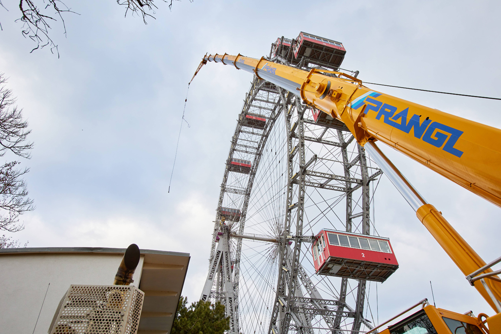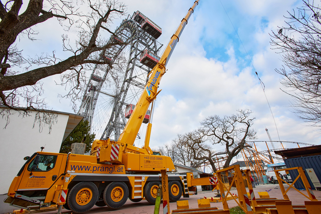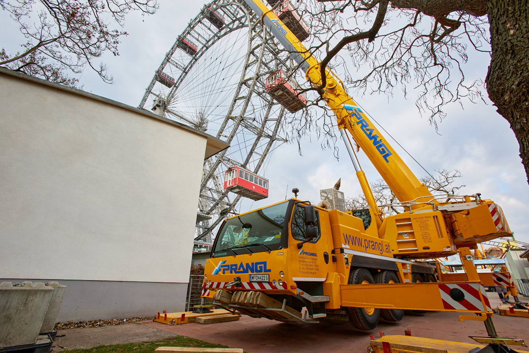 Insgesamt 120 Seilspeichen verleihen dem Riesenrad, das anlässlich der Feier zum 50. Thronjubiläum Kaiser Franz Josefs I. Ende des 19. Jahrhunderts errichtet wurde, die notwendige Stabilität. Je nach Abnutzung werden diese wichtigen Seile erneuert. Um die Arbeiter diesmal bei ihrem heiklen Job in großer Höhe zu unterstützen, kam ein 4-achsiger 100 Tonnen Teleskopkran von Prangl zum Einsatz. Dies vor allem deshalb, weil hier wegen der vorhandenen Zufahrt die Kompaktheit gerade dieses Kranes gefragt war. Nur mit einem "kurzen" Kran war es möglich, die notwendige Position einzunehmen.