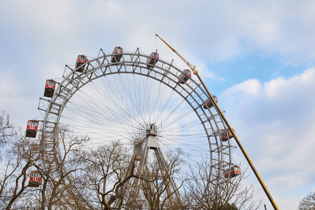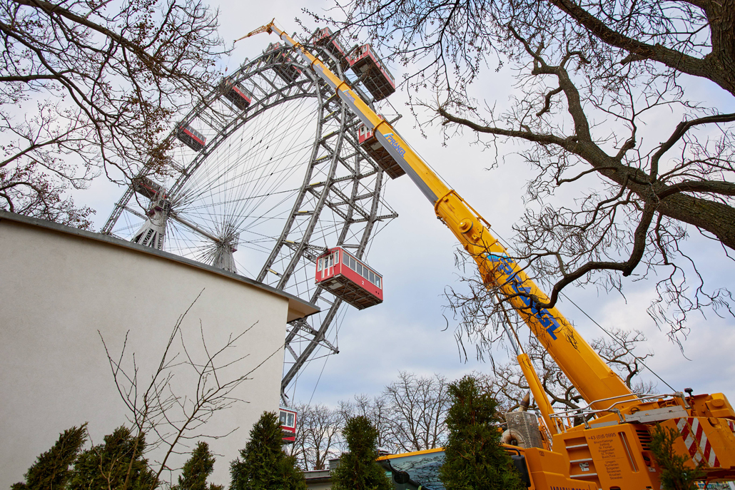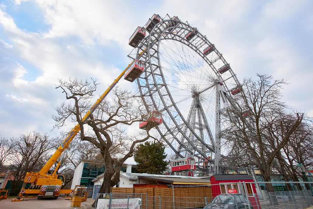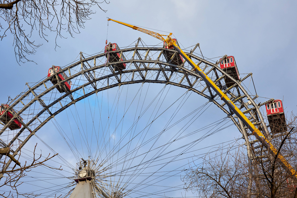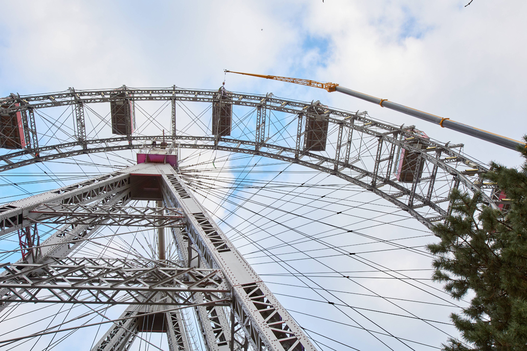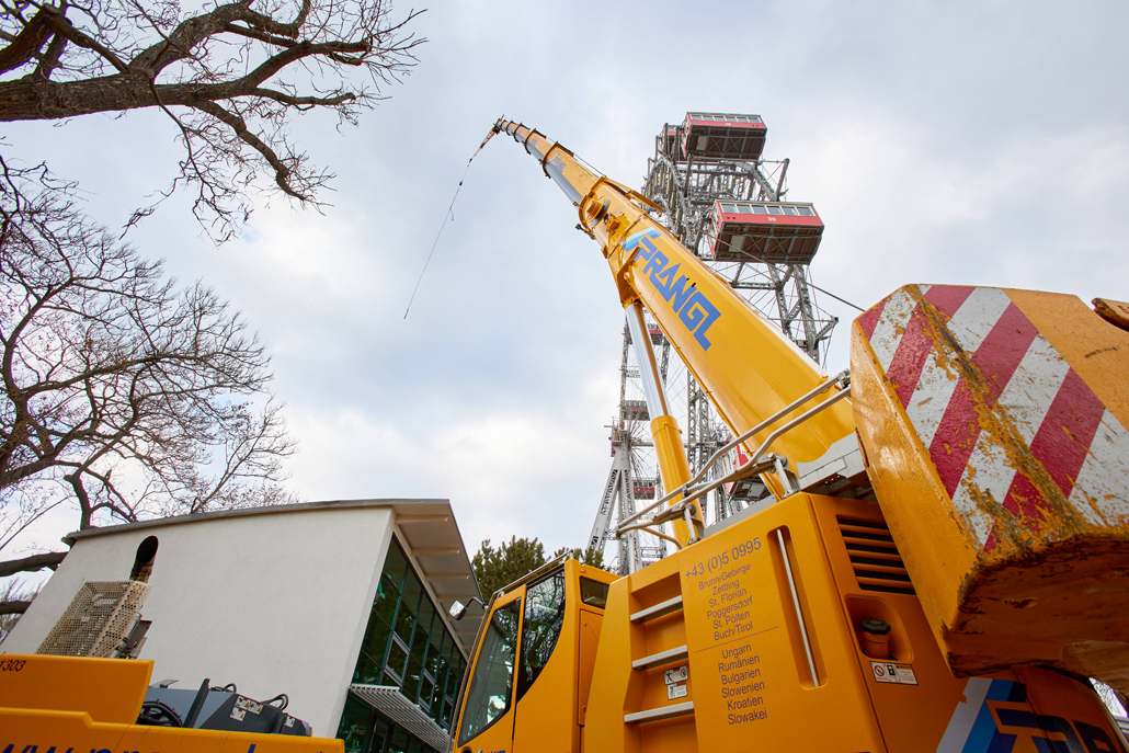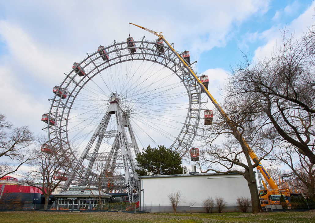 Insgesamt 120 Seilspeichen verleihen dem Riesenrad, das anlässlich der Feier zum 50. Thronjubiläum Kaiser Franz Josefs I. Ende des 19. Jahrhunderts errichtet wurde, die notwendige Stabilität. Je nach Abnutzung werden diese wichtigen Seile erneuert. Um die Arbeiter diesmal bei ihrem heiklen Job in großer Höhe zu unterstützen, kam ein 4-achsiger 100 Tonnen Teleskopkran von Prangl zum Einsatz. Dies vor allem deshalb, weil hier wegen der vorhandenen Zufahrt die Kompaktheit gerade dieses Kranes gefragt war. Nur mit einem "kurzen" Kran war es möglich, die notwendige Position einzunehmen.