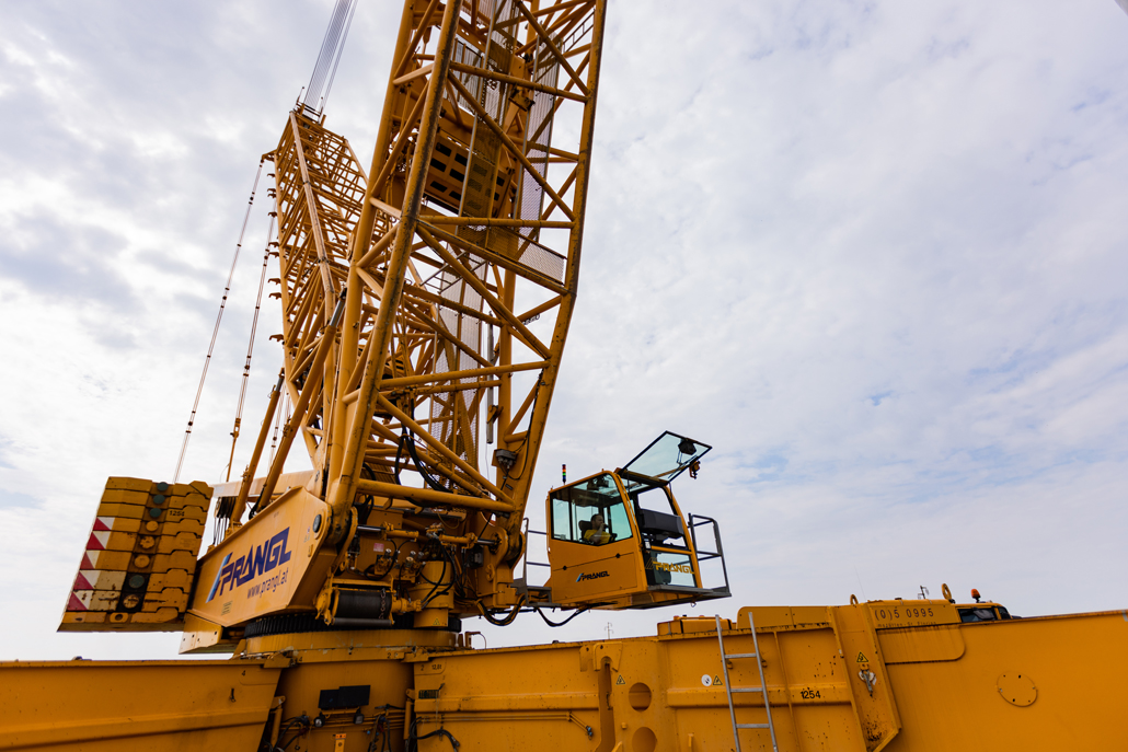 Für den Aufbau der Windkraftanlagen mit einer Nabenhöhe von je 100 Meter kam nur ein 600 Tonnen Gittermastkran in Frage. Nicht nur wegen seiner enormen Stärke ist dieser Kran perfekt. Auch die niedrigen Mobilisierungskosten und die Möglichkeit, ihn rasch von einer Standfläche zur nächsten zu verlegen, sprachen ganz klar für diesen Giganten aus der gelben Flotte. Der Großkran wurde mit einer Gesamtsystemlänge von 120 Meter konfiguriert. In Summe brachte der gelbe Riese 568 Tonnen auf die Waage. Die gewichtigsten zu verhebenden Komponenten waren jedenfalls die je 123 Tonnen schweren und 11,4 Meter langen Maschinenhäuser.