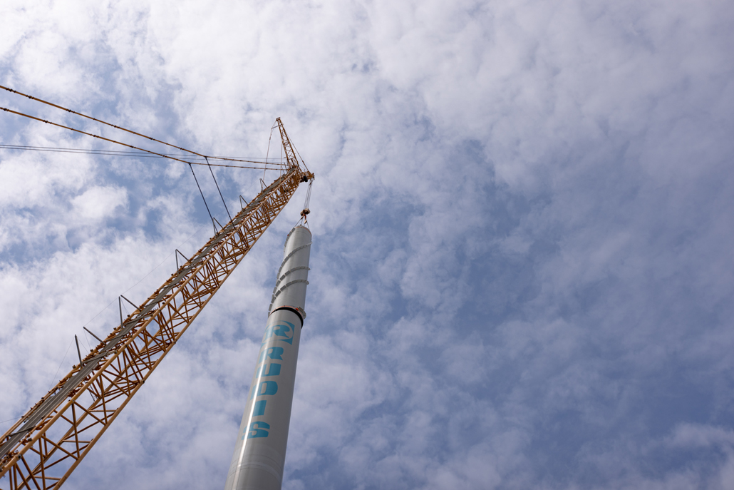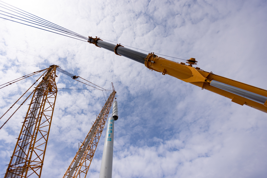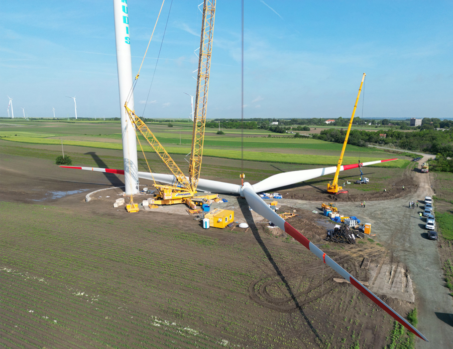 Schlussendlich wurde der Rotorstern an der Nabe an den Großkran gehängt, gedreht und hochgehoben: Zwei Rotorblätter wurden parallel von den Hilfskränen angehoben – so lange, bis der Rotorstern senkrecht hing. Danach wurde die Verbindung zu den Hilfskränen gelöst und der Gittermastkran hob den Rotorstern langsam bis auf Höhe des Maschinenhauses. Nach einem Schwenk konnte der Rotorstern der Endposition am Maschinenhaus vorsichtig angenähert und danach montiert werden. Die Kommunikation zwischen den internationalen Teams klappte hervorragend. Der Aufbau der ersten chinesischen Windkraftanlagen in Serbien kann daher dank Prangl als voller Erfolg bewertet werden.