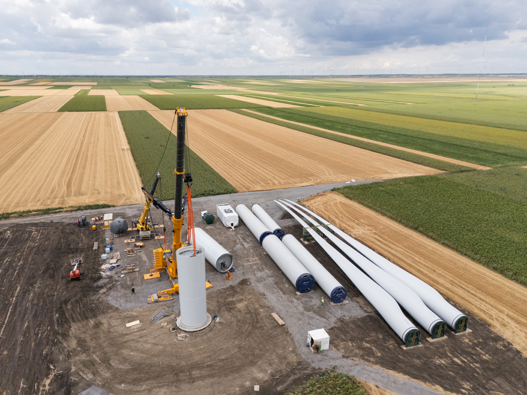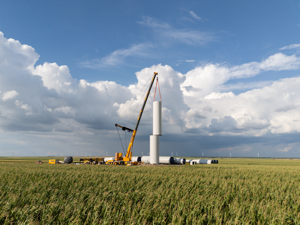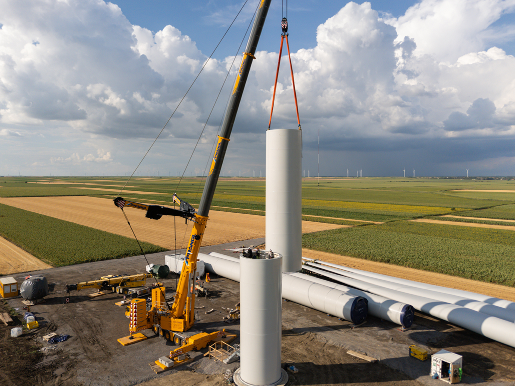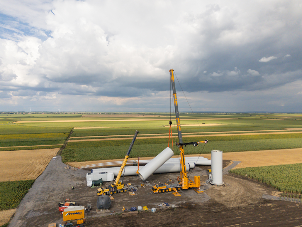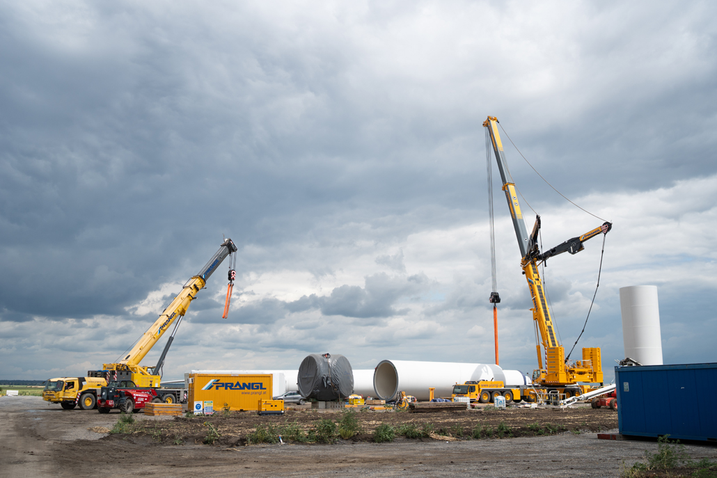Die Montage von Windkraftanlagen erfordert viel Erfahrung und Fingerspitzengefühl. Weil man bei Prangl beides hat, wurden die gelben Experten für die Entladung sämtlicher Teile – insgesamt sechs Turmelemente, Gondel, Antriebsstrang, Nabe und Rotorblätter – sowie die Vormontage von zwei Turmabschnitten engagiert.