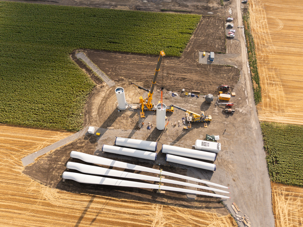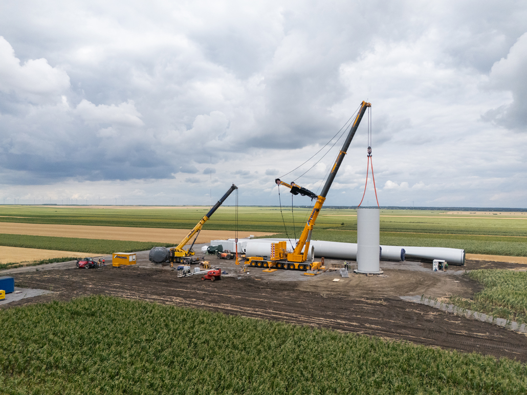 Neben dem 700 Tonnen Kran waren noch ein 200 Tonnen Mobilkran und ein Teleskopstapler mit 12,5 Meter maximaler Hubhöhe und 8,7 Meter maximaler Reichweite sowie einer Tragfähigkeit von 4 Tonnen im Einsatz. Der Arbeitsablauf war bei jeder Windturbine gleich: Am ersten Tag wurden die vier obersten Turmelemente (zwischen 16,1 und 24,6 Meter hoch und zwischen 44,1 und 98,9 Tonnen schwer), die Gondel (73,9 Tonnen), der Antriebsstrang (81,9 Tonnen), die Nabe (56,3 Tonnen) und die drei Rotoren (80,2 Meter lang und 26,9 Tonnen schwer) an der Baustelle angeliefert und mit Hilfe der beiden Krane abgeladen.