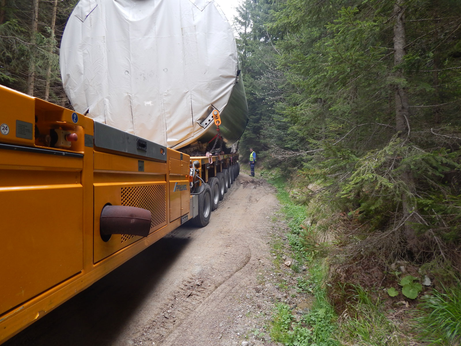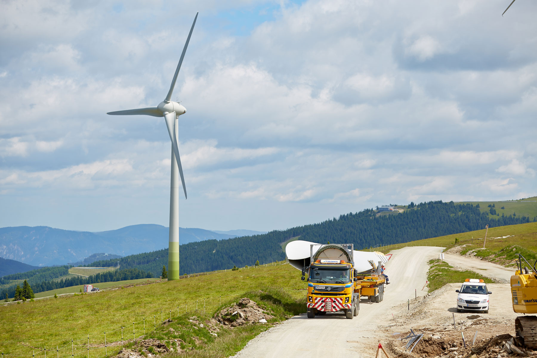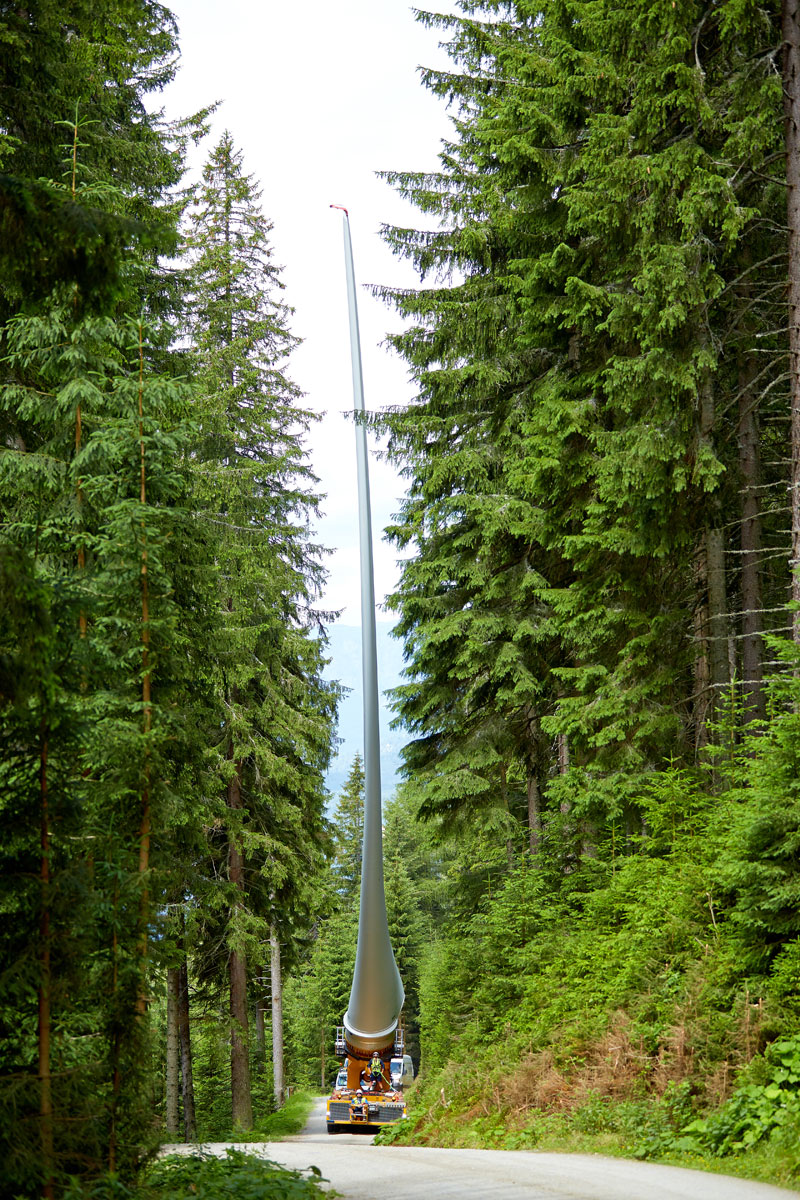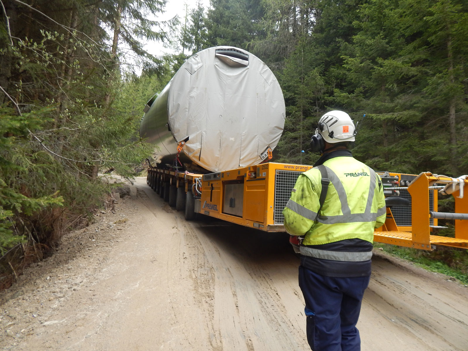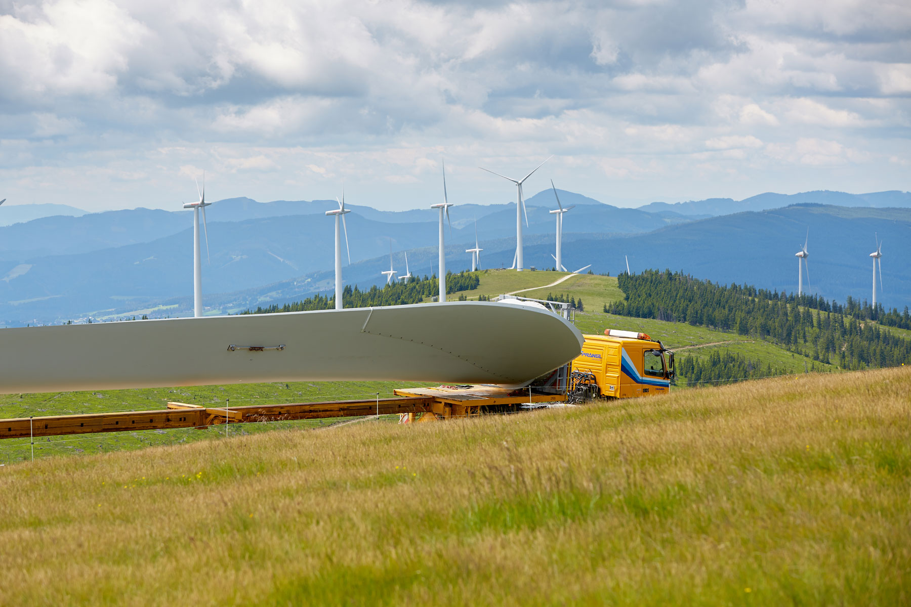 Als größter Naturraumbewirtschafter forcieren die österreichischen Bundesforste die Energiegewinnung aus erneuerbaren Ressourcen. Der Windpark Pretul wird auf der Pretulalpe auf rund 1.600 Meter Seehöhe errichtet und Aufgabe des Experten-Teams von Prangl war es auch diesmal, das passende Transport-, Zwischenlagerungs- und Hebekonzept zu finden.